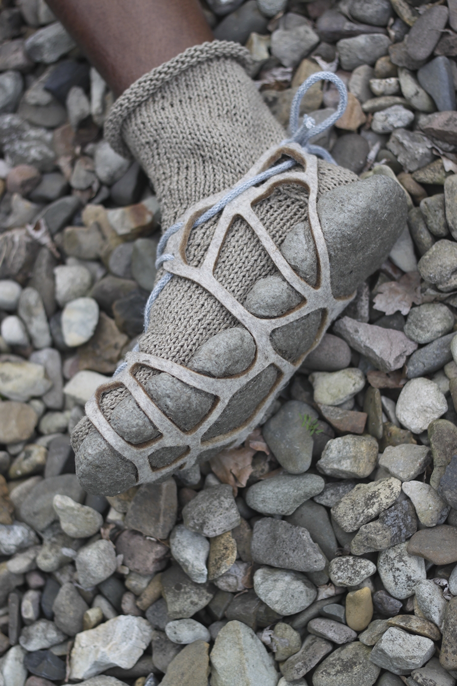 Laura’s aim is to create a recyclable product that can be composted in our gardens, which adds value to the environment. For the sole, Laura uses latex extract from the root of the dandelion (natural rubber) and waste materials such as straw or sawdust as fillers and natural dyes. The thin string is made with cellulose felt while the upper with woven hemp. The elements are not glued together, they can be assembled and freely combined: the upper shape wraps the lower part of the sole, in order to hold all the elements together.