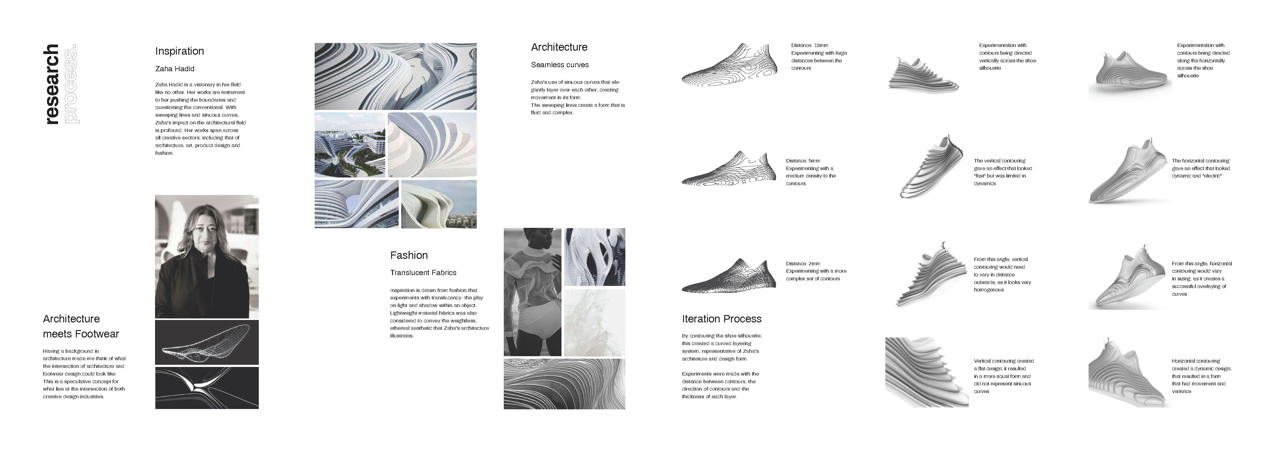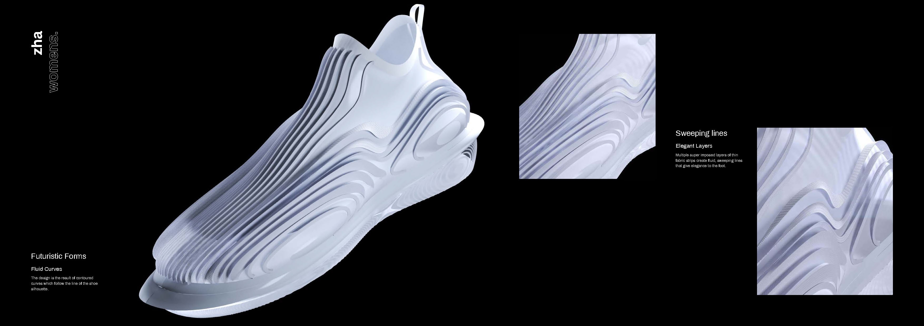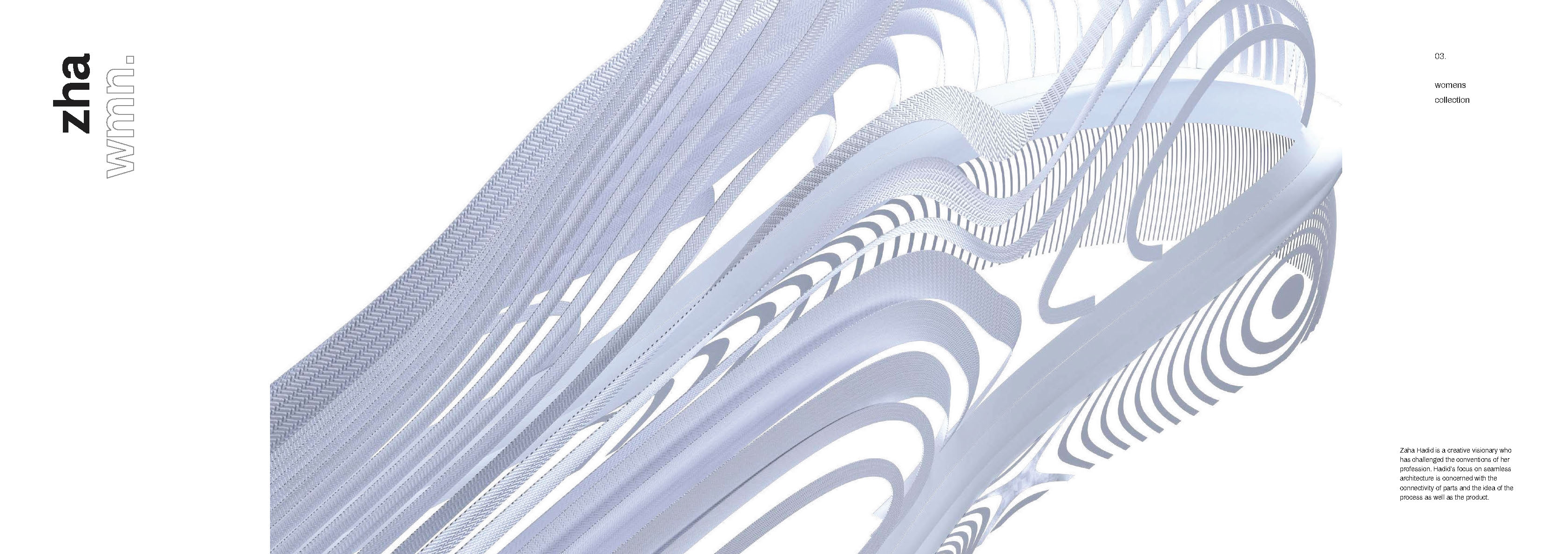 Zaha Hadid is a creative visionary who has challenged the conventions of her profession. Hadid’s focus on seamless architecture is concerned with the connectivity of parts and the idea of the process as well as the product. Having a background in architecture made me think of what the intersection of architecture and footwear design could look like. This is a speculative concept for what lies at the intersection of both creative design industries.