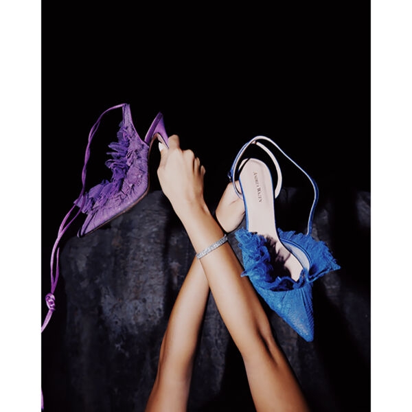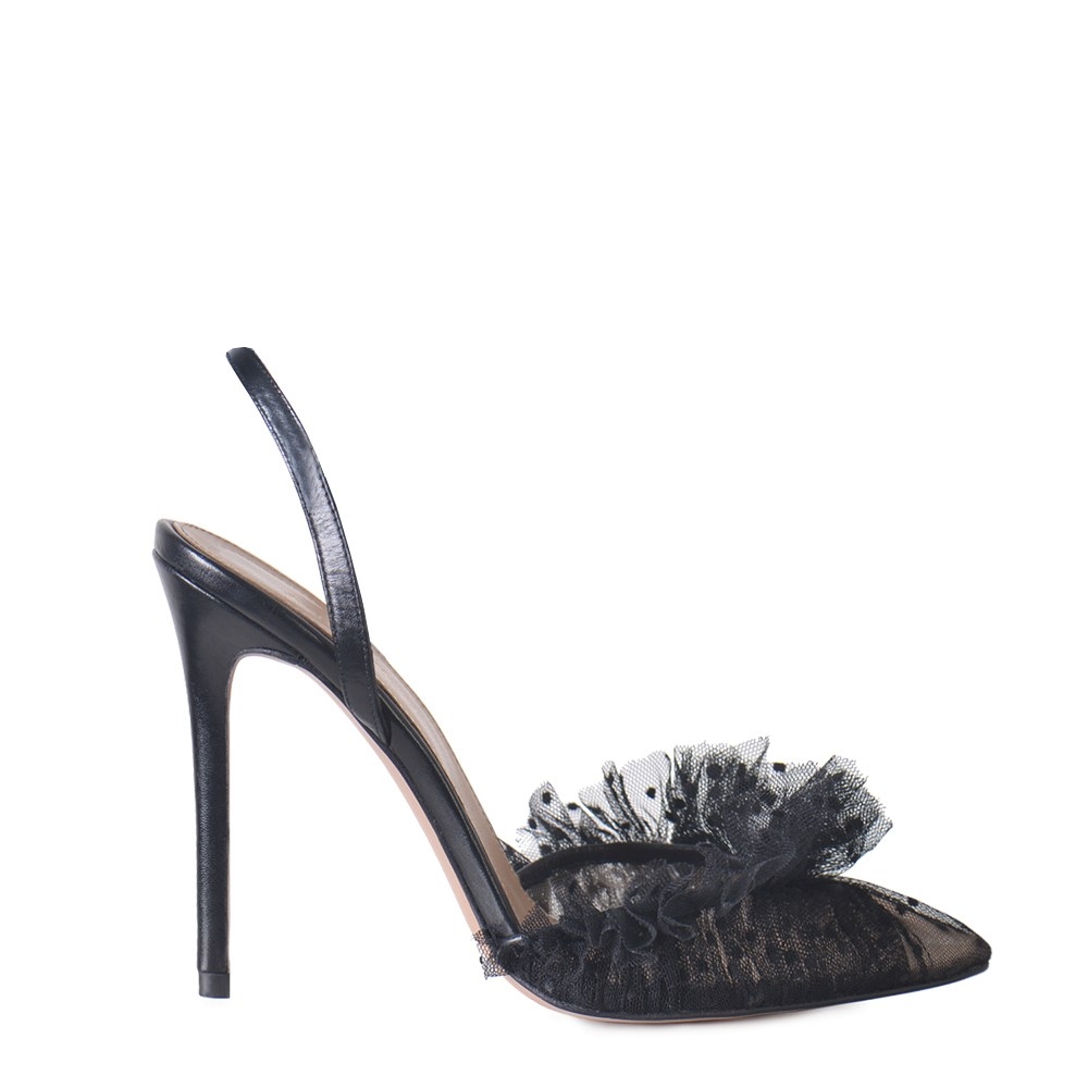 Hand-stitched and delicately sewn, the pair is crafted in romantic a “Point d’Esprit” Black Tulle. FRANCA SLING sits on a high heel, giving your legs a more flattering silhouette! Style them with cropped flared pants, or a lace cocktail dress for a more romantic look.