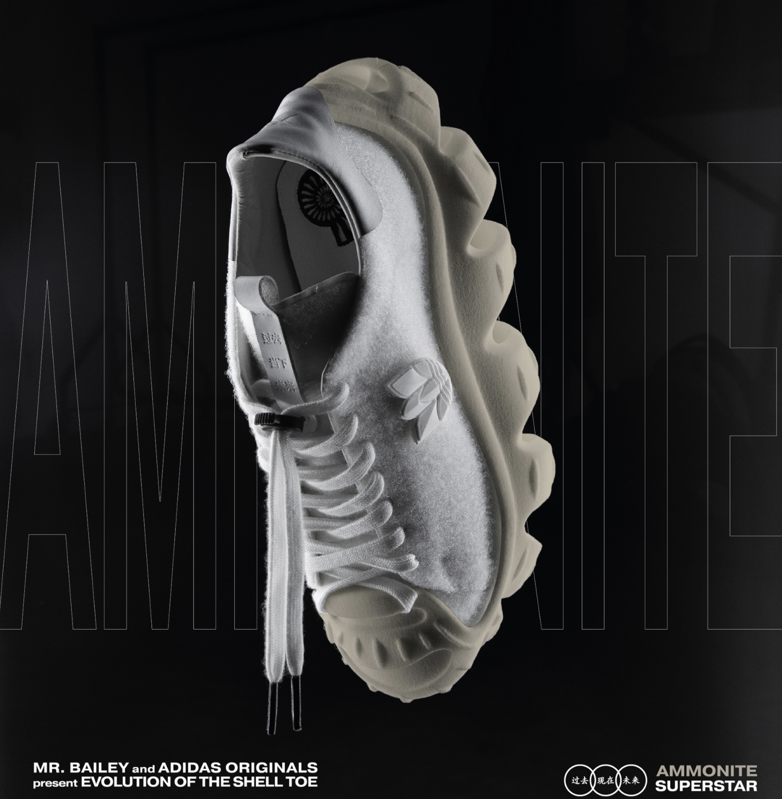The inspiration spawned from Mr. Bailey’s understanding of what the Shell Toe is — it’s the most important and signifying part of the Superstar, and it has similar parallels to the forms of the marine world. With this comparison in mind, the designer went on to deconstruct the sneaker’s design before reimagining it as the “Ammonite Superstar.” The result is a wearable sculpture, where a Shell Toe design at the front seamlessly morphs into becoming a warped sole unit that has segments growing from its body, wrapping around the entire footbed.
