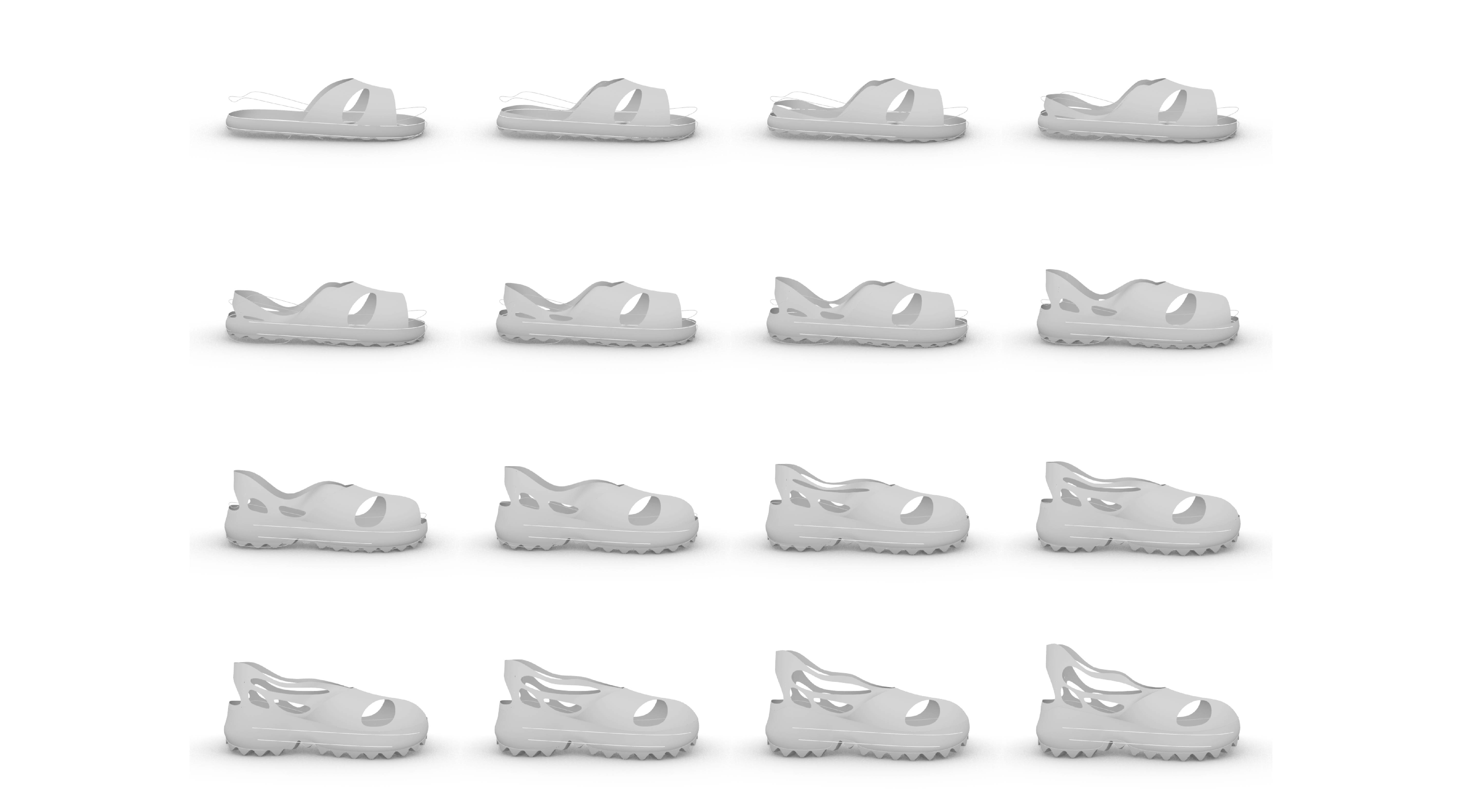 Designed as a virtual engine achieving complex form transformation, the prototyping system is semi-parametric and the look of the shoe is controlled by the “Number Slider” on the interface; seamless and continuous variations are displayed on the screen by sliding through the control bar.