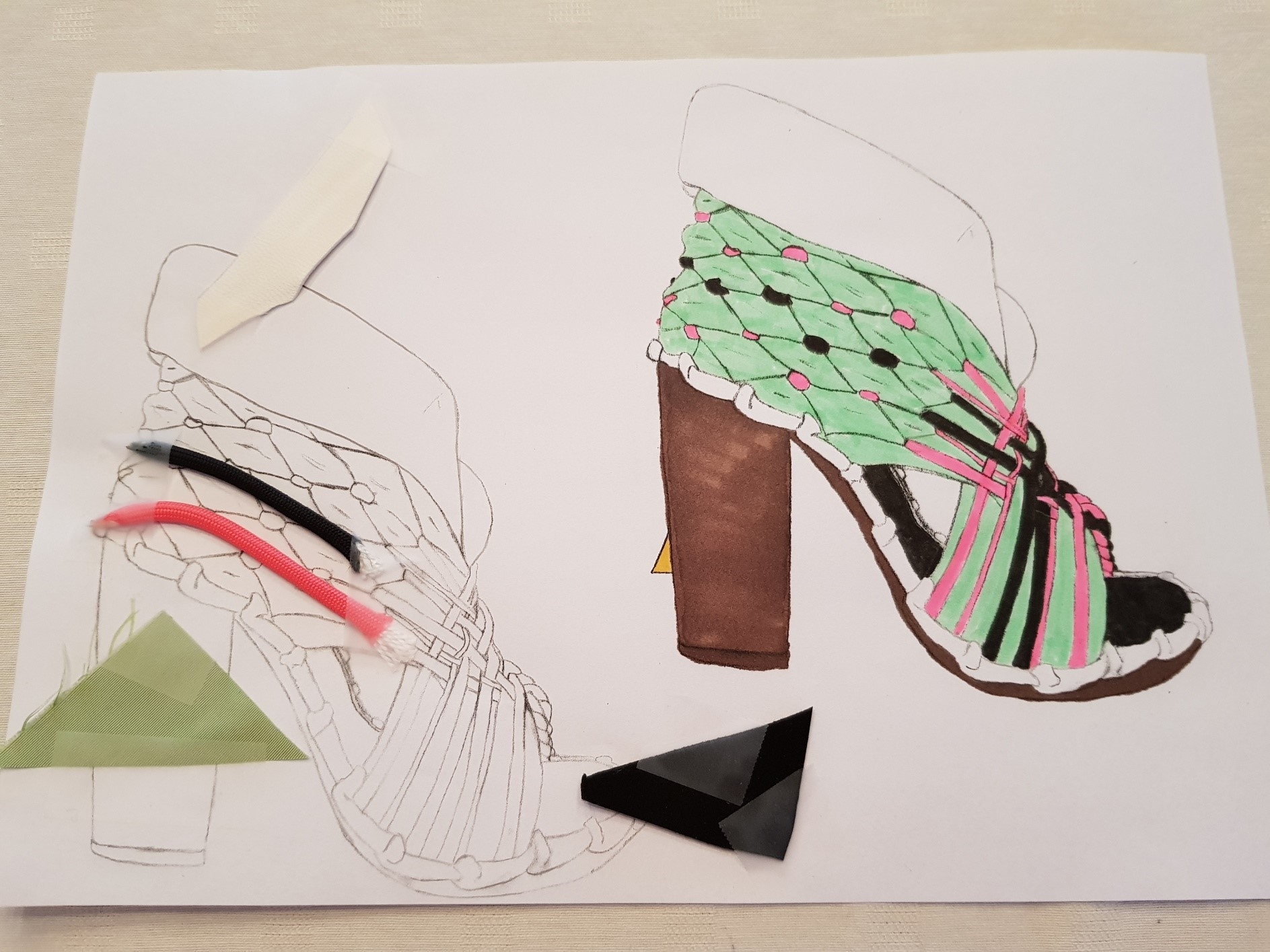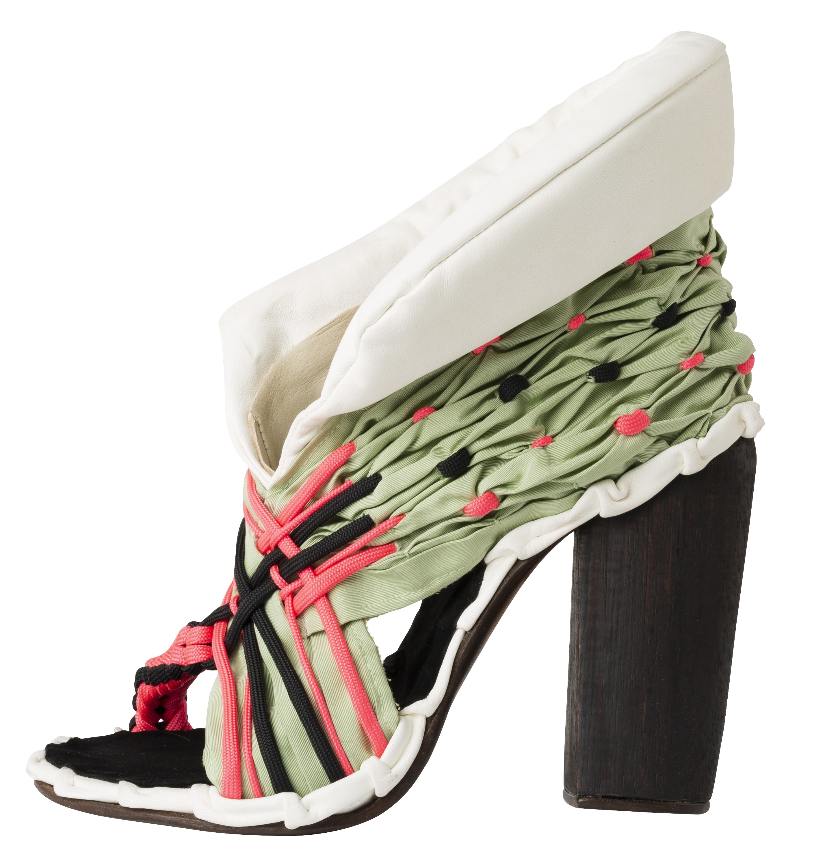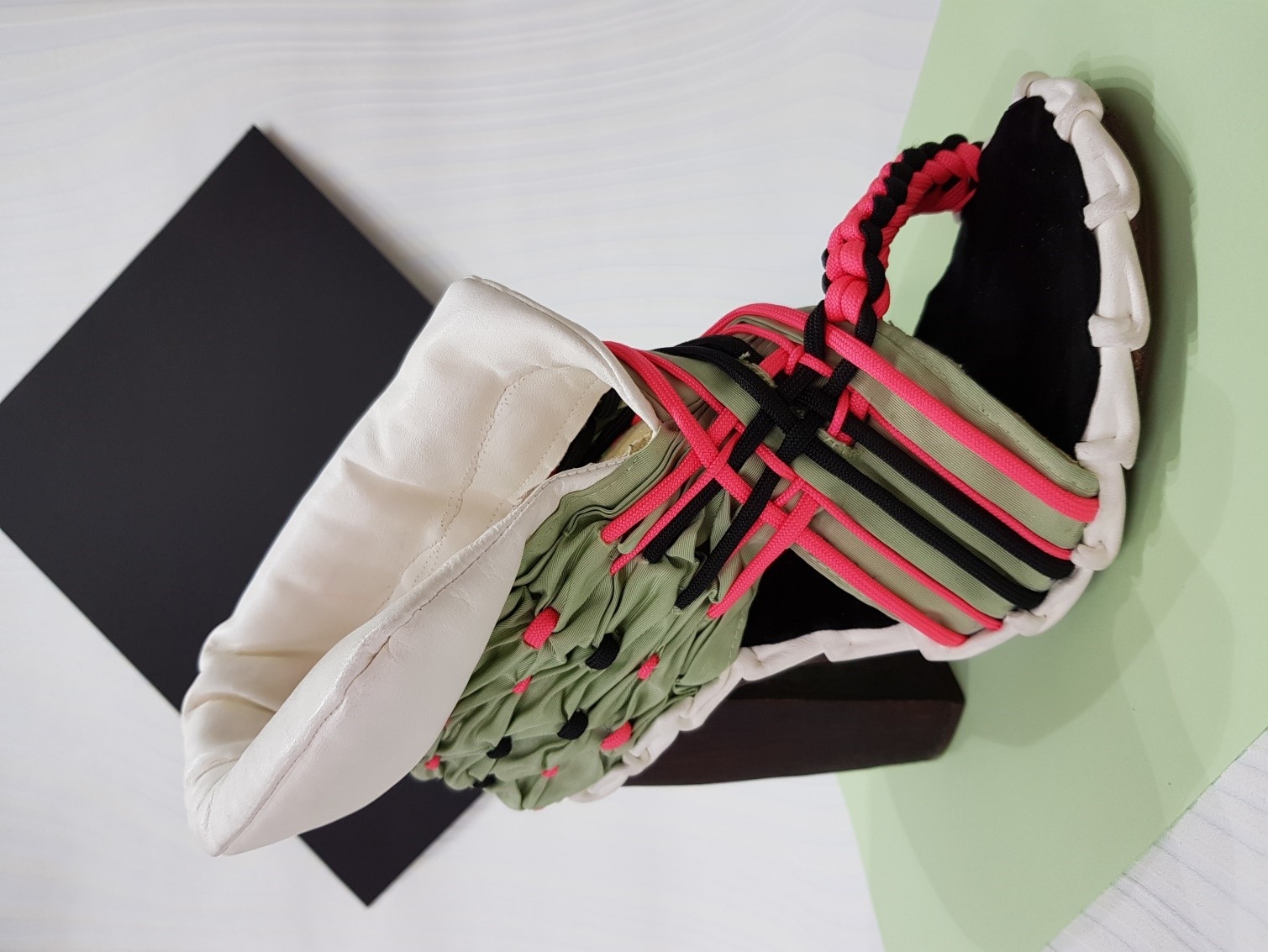 Inspired by the themes of Argentine tango and Victorian fashion. Tango is usually associated with passion and eroticism. Yet the tango has rather different characteristics: embrace, connection, intimacy. The shapes and lines refer to the rotational movements, flashing legs,… in tango. Victorian fashion is known for the elegant dresses and shoes in bright colors, made of expensive materials. The color palette, the smocking, the use of other fabrics such as silk, paracord, ... refer to this. The result is a shoe that is cool and sporty while also being elegant.