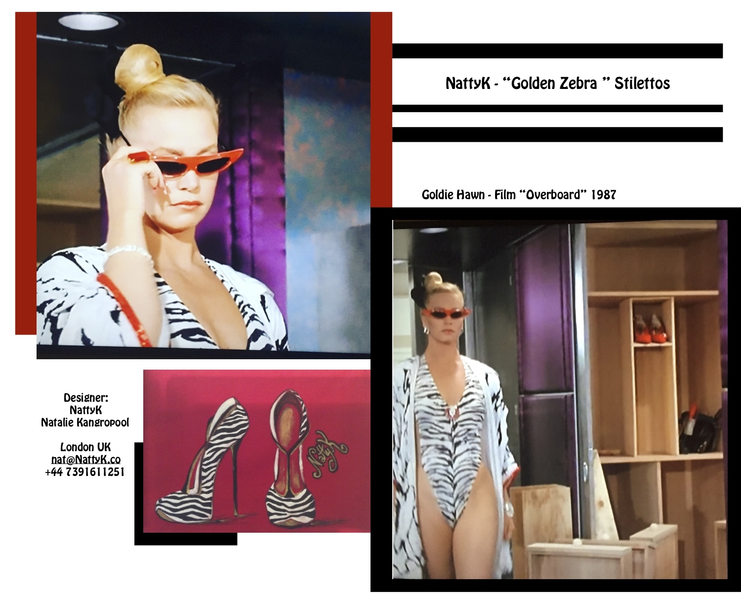 Everyone needs to laugh, and Goldie Hawn in the 80's in the film Overboard was hilarious. The swim costumes on her yacht were the epitome of the 80's rage for animal print. Her zebra swimsuit was epic as where the read lightening bolt sunglasses. My zebra stilettos are an ode to the fabulous 80’s era, but wearable today! Be brave be bold and keep a smile on your face :)