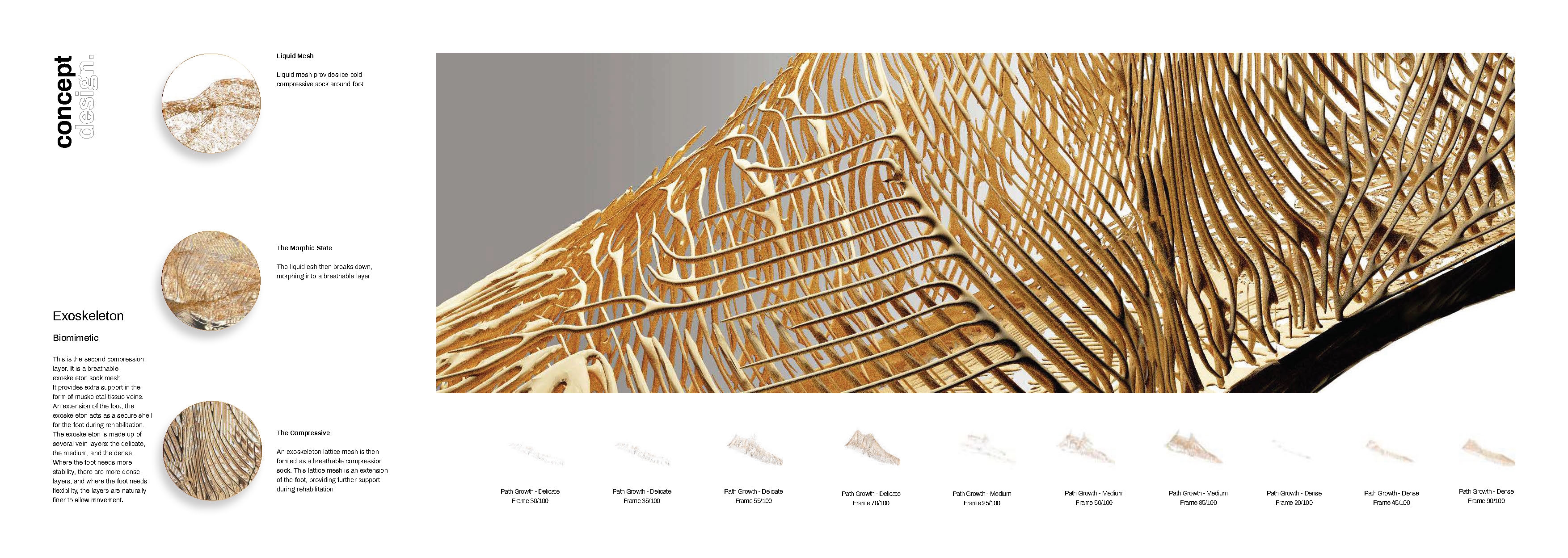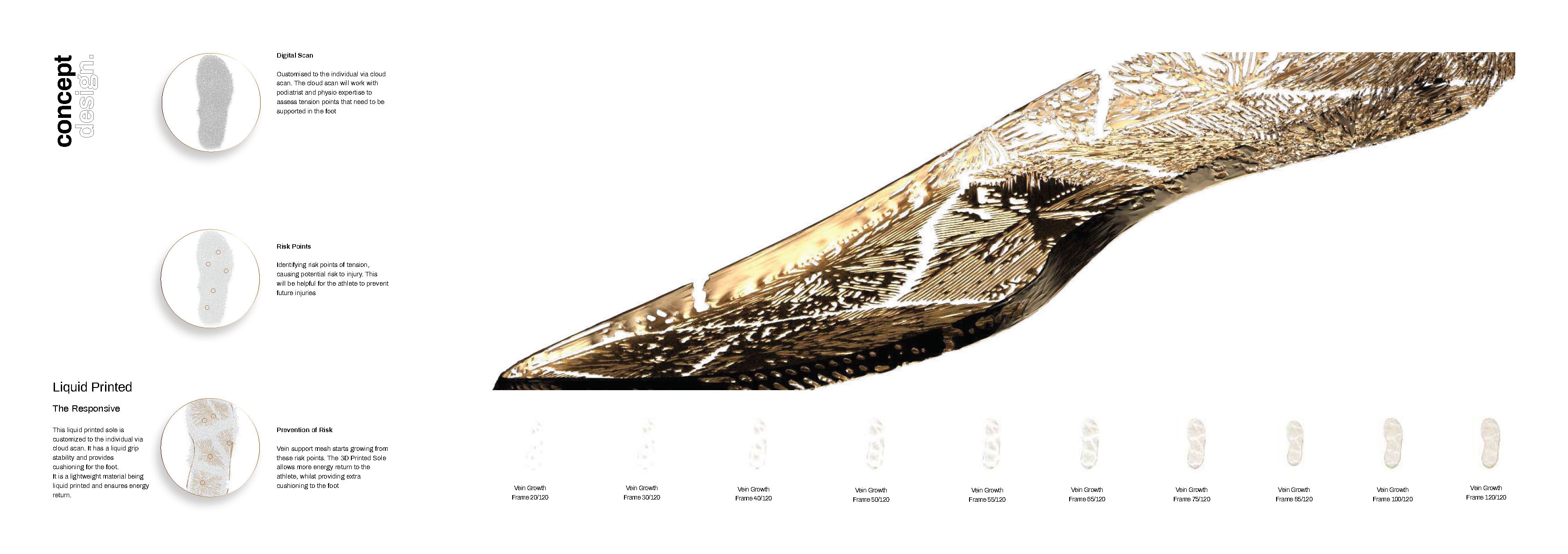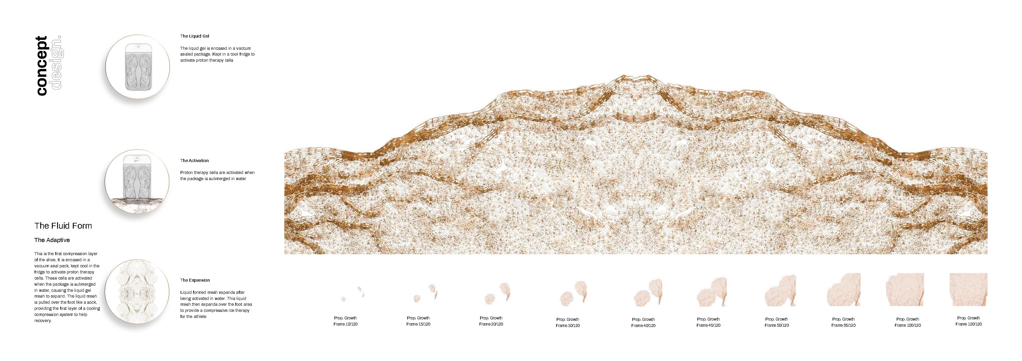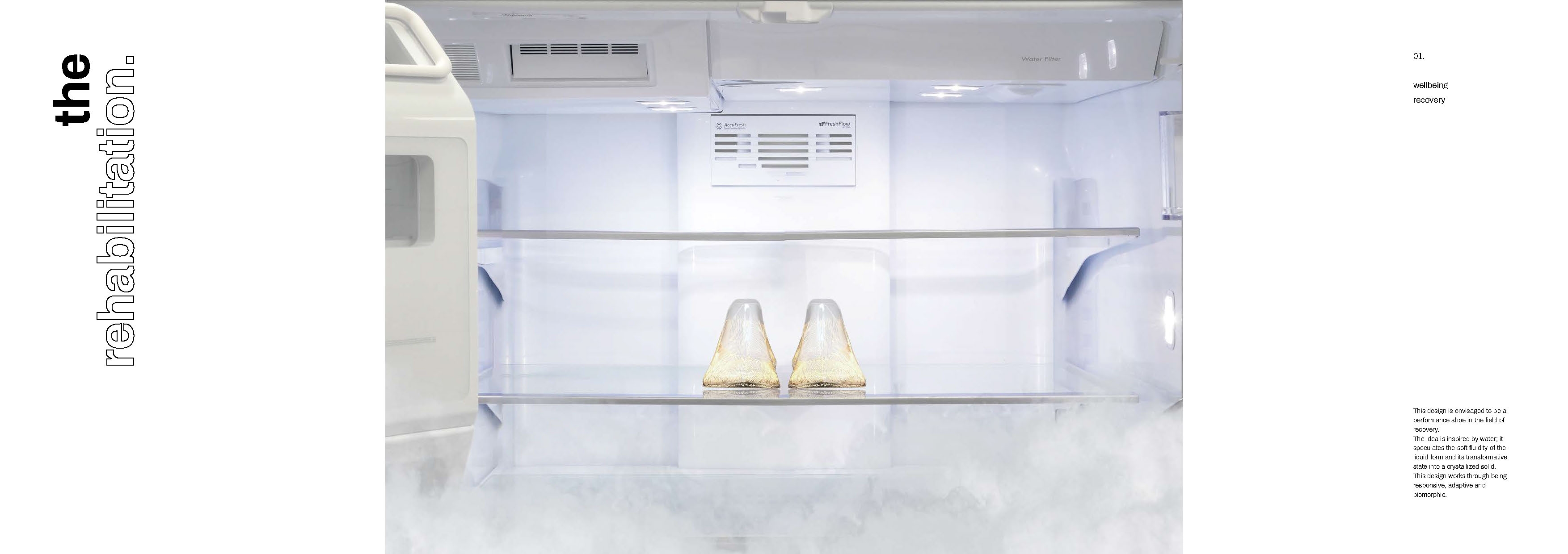 This design is envisaged to be a performance shoe in the field of recovery. The idea is inspired by water; it speculates the soft fluidity of the liquid form and its transformative state into a crystallized solid. This design works through being responsive, adaptive and biomorphic.