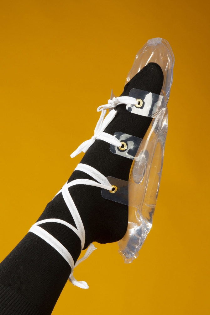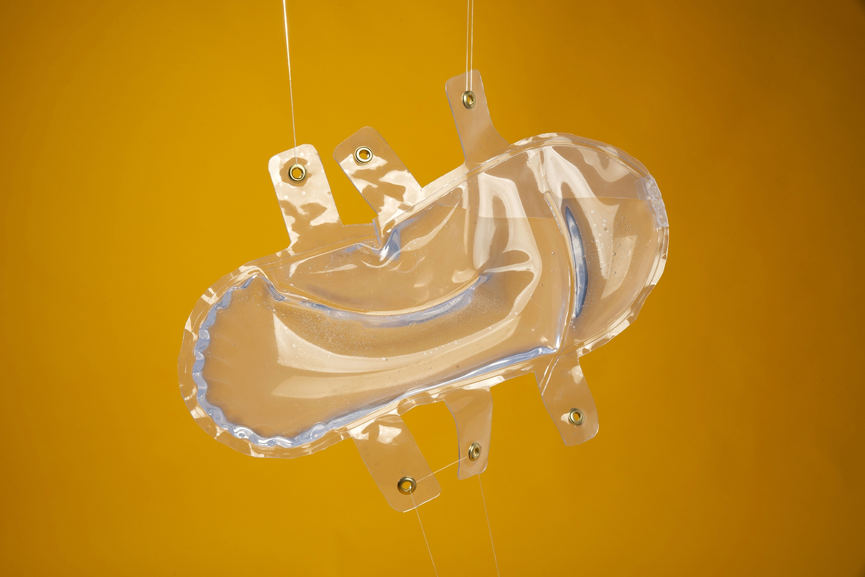 Aqua is footwear designed to enhance your foot awareness by providing an unfamiliar walking experience. Multiple cavities containing water are connected so that while walking, the applied pressure creates a fitted shoe that still allows for your foot muscles to function.