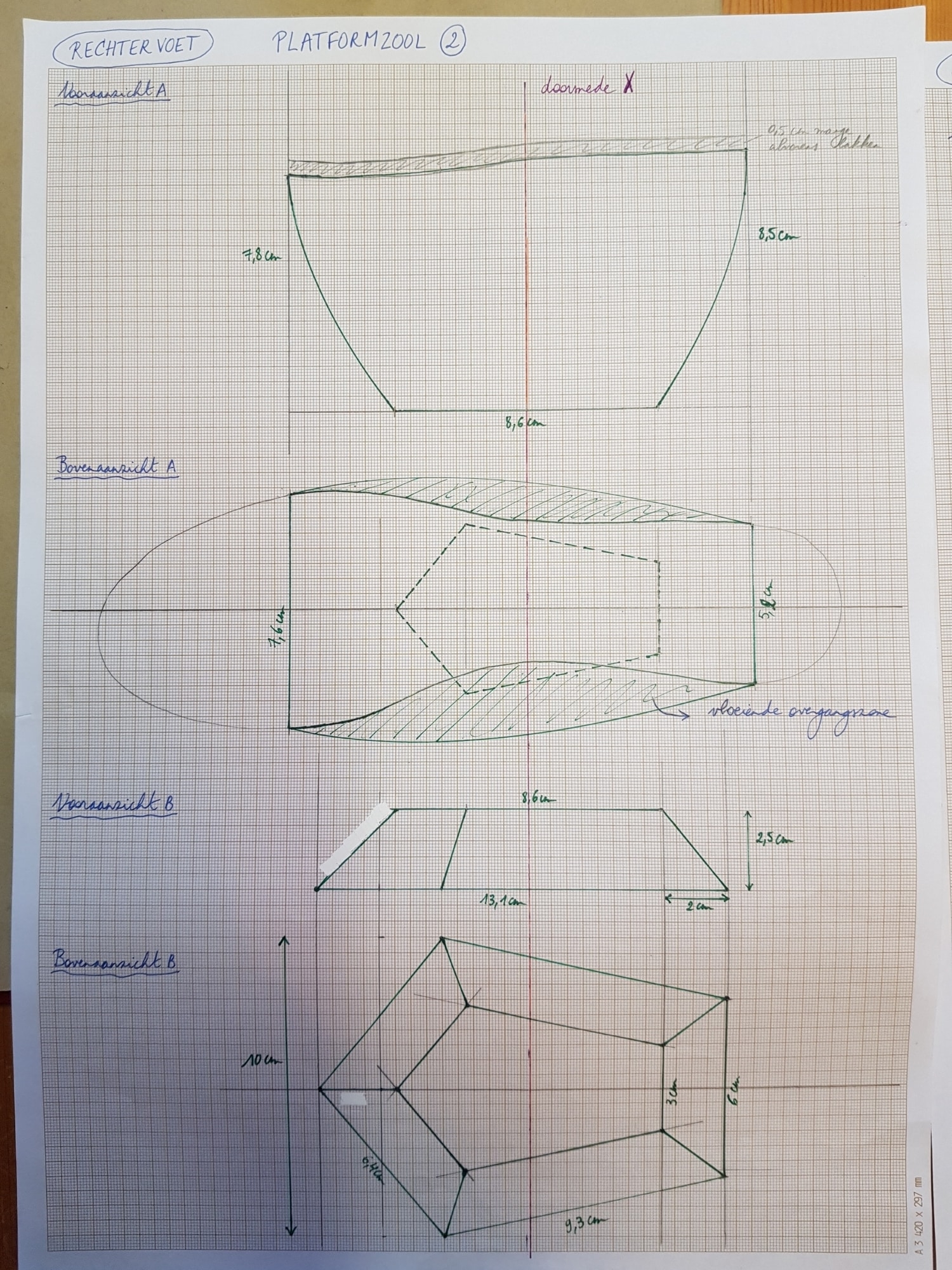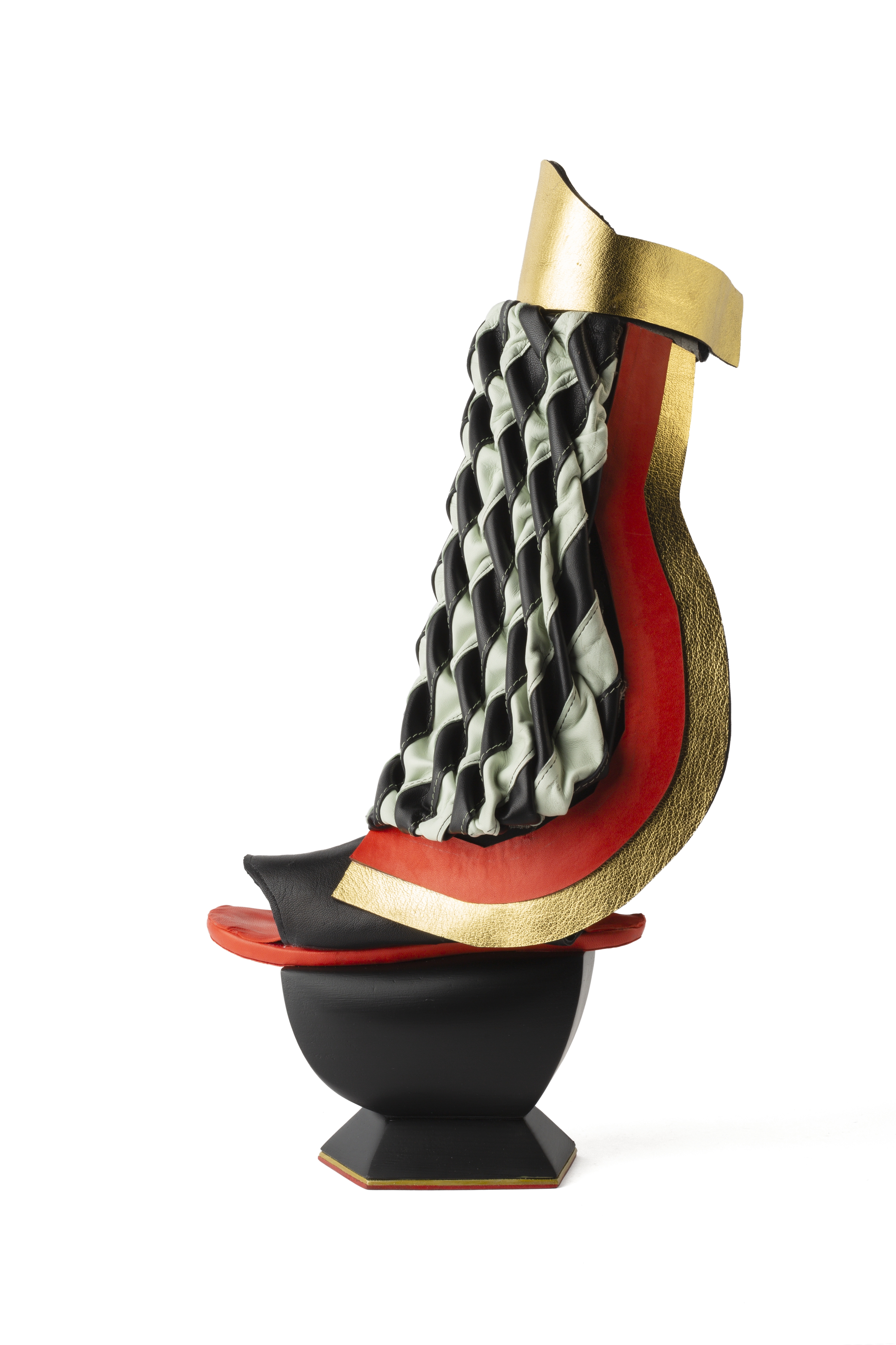 Based on the "China" theme and using "textures" (by Canadian smocking, smyrna and quilting). Chinese history: imperial dynasties including the Qing (Manchu) dynasty, characterized by power, prestige and vastness. The shapes, lines and colors are inspired by the fashion (for the top) and the typical porcelain vases (for the platform sole). Contemporary China: recycling center of plastic waste in the world and the label 'Made in China': associated with cheap counterfeiting, mass production and poor quality. The platform soles were given a cheap touch reminiscent of plastic to reflect this.