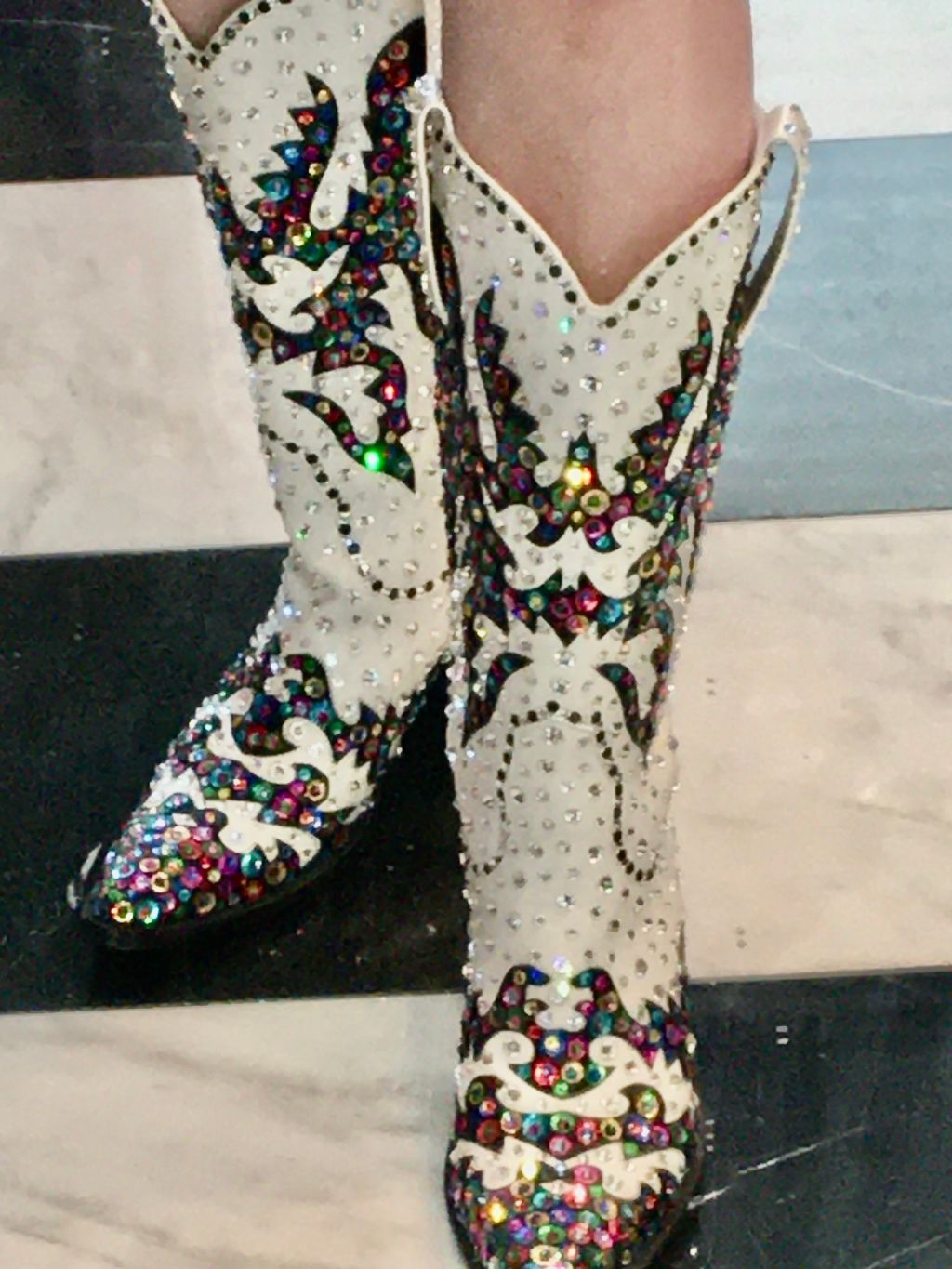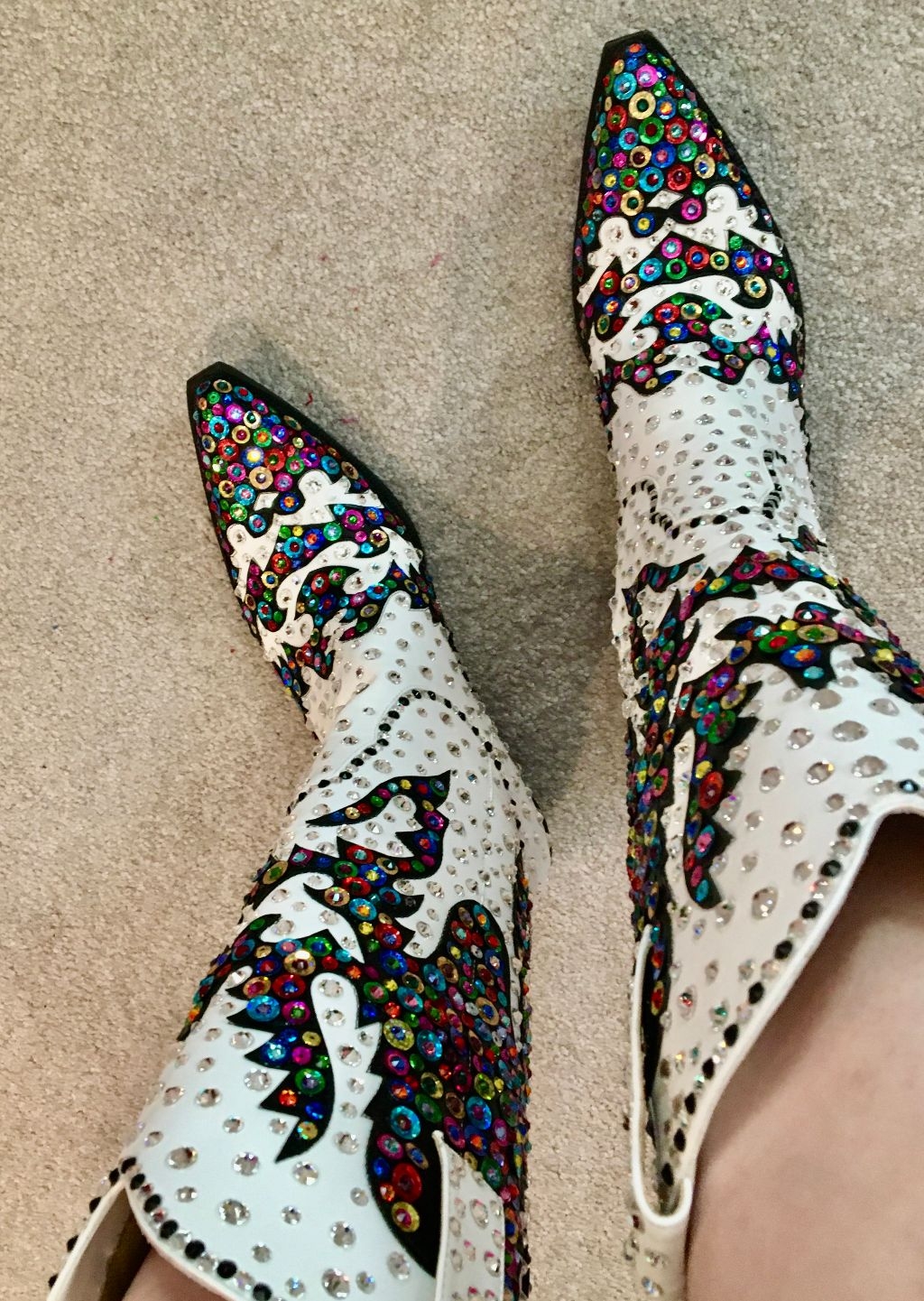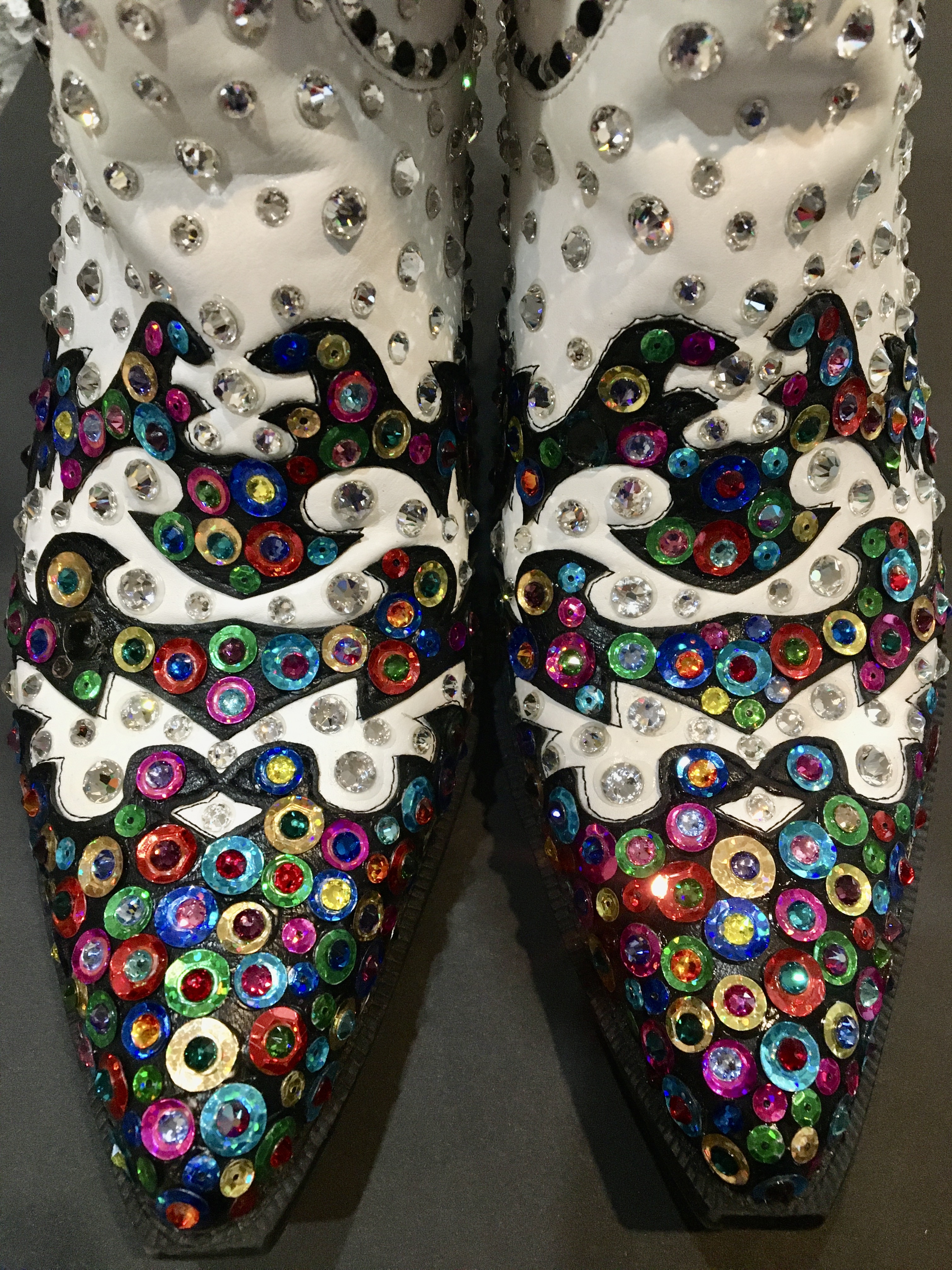 White and black cowboy boots have been transformed by Designer/Artist Kerry Damiano into a kaleidoscope of color and sparkle. On the black areas, each sequin was embellished with a contrasting color Swarovski crystal to create the stunning effect. The seams were outlined with black & clear crystals, and the body covered in varying sizes of clear. It took thousands of Swarovski crystals and nearly 30 hours of intricate placement, but the result is a masterpiece of artistic style!