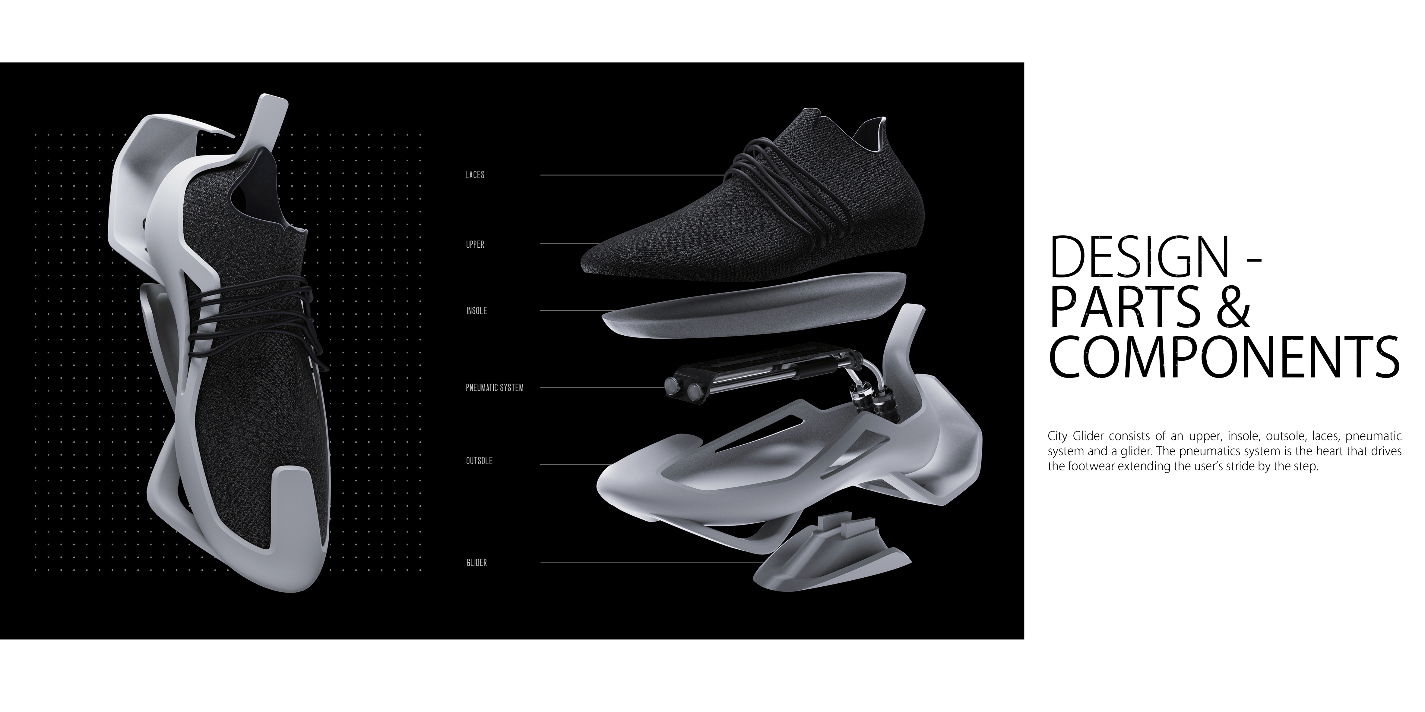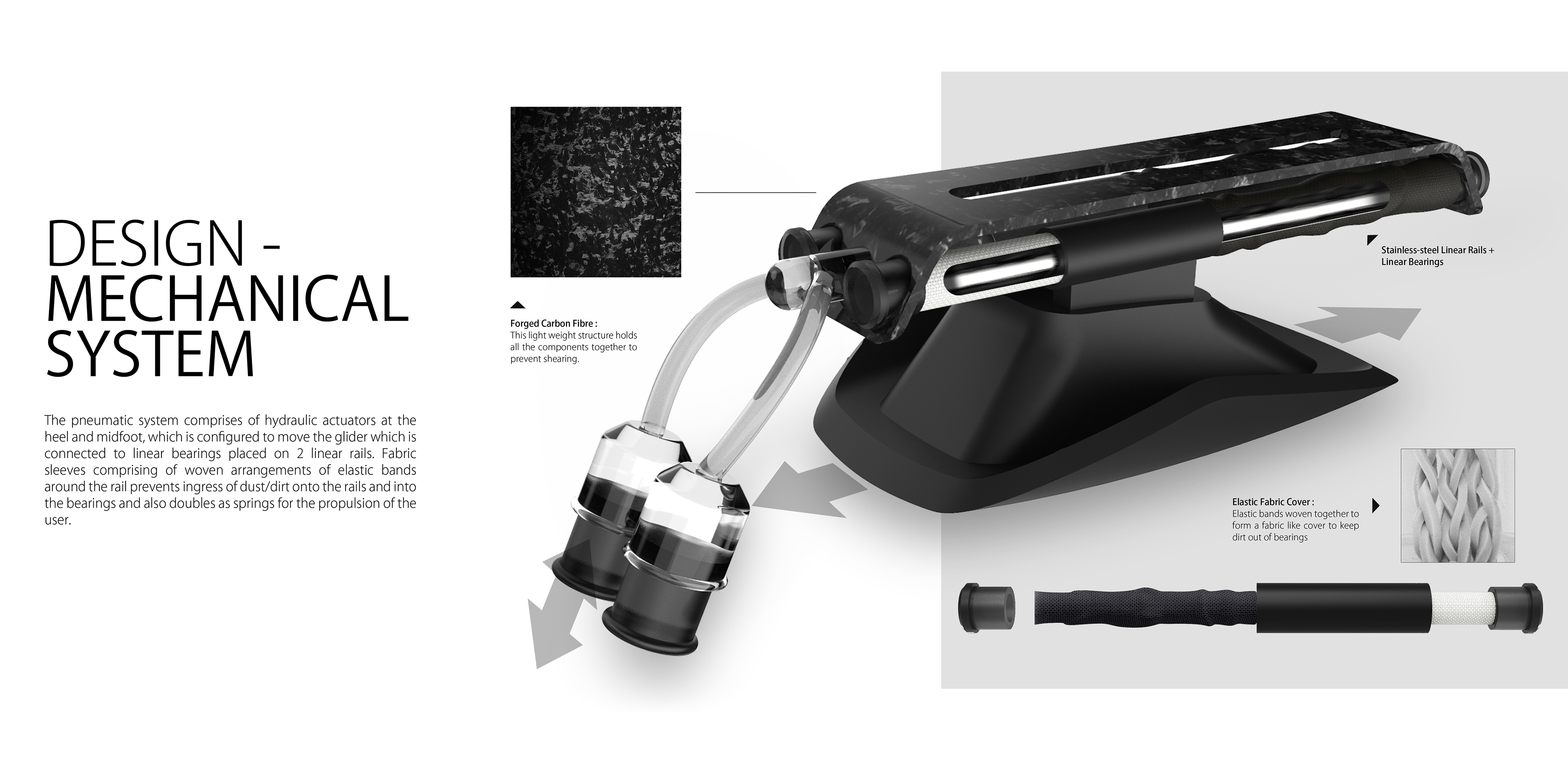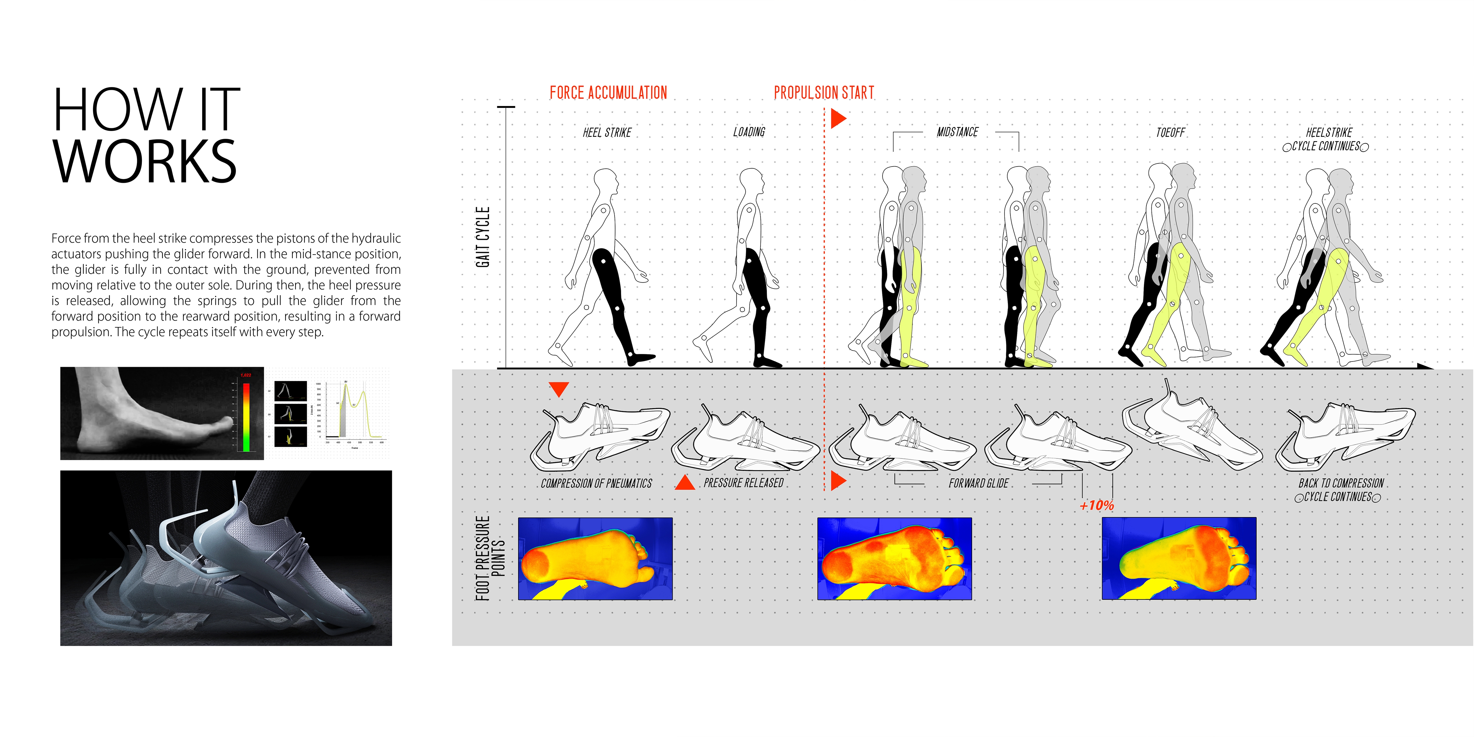 It augments the walking experience by extending our stride and walking threshold. Lightweight, human powered and requiring almost no effort, the pneumatic mechanical system within the footwear harnesses force expended from the heel strike and releases it in the mid-stance position to propel the user forward by up to 11.6%.