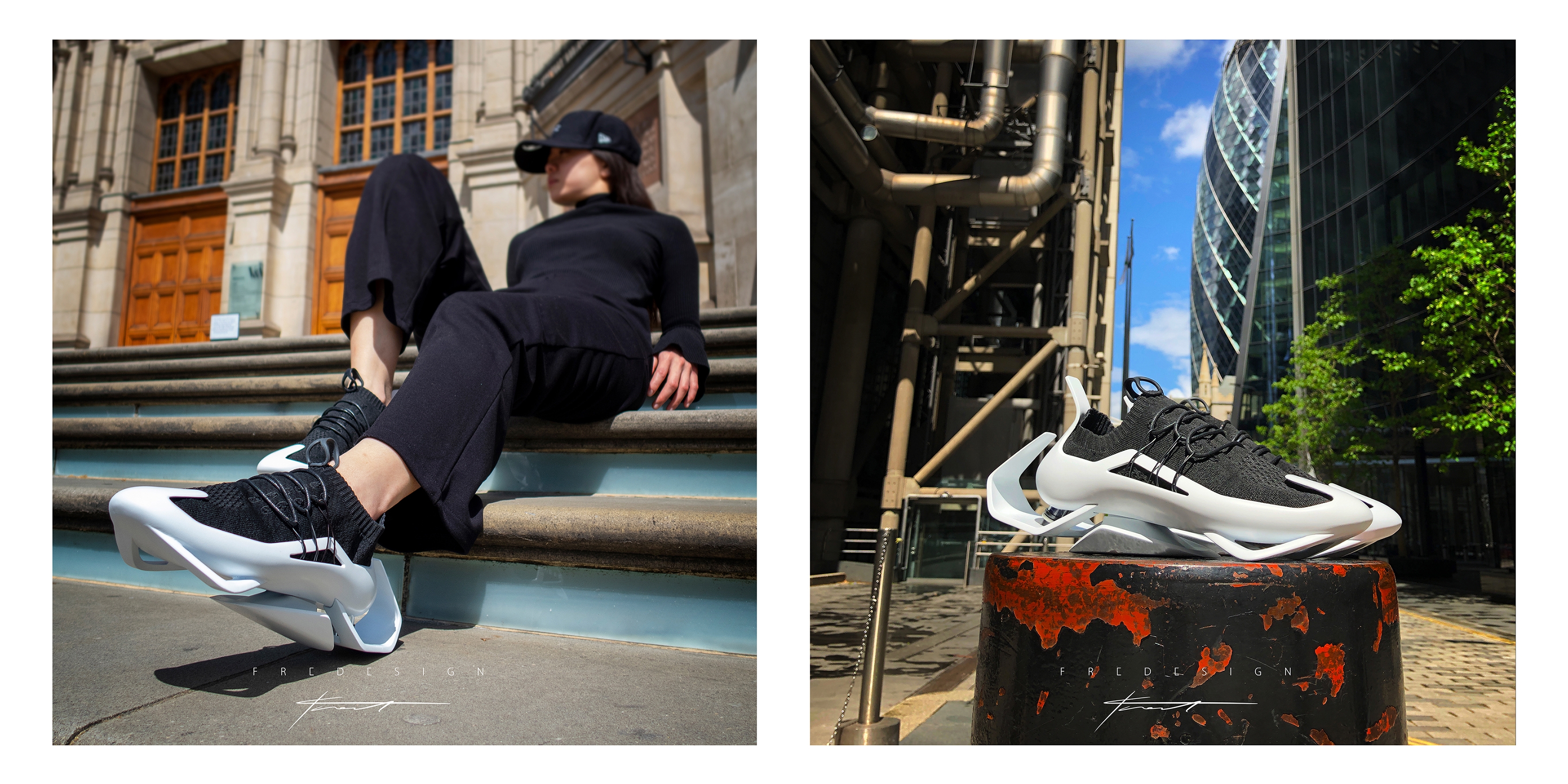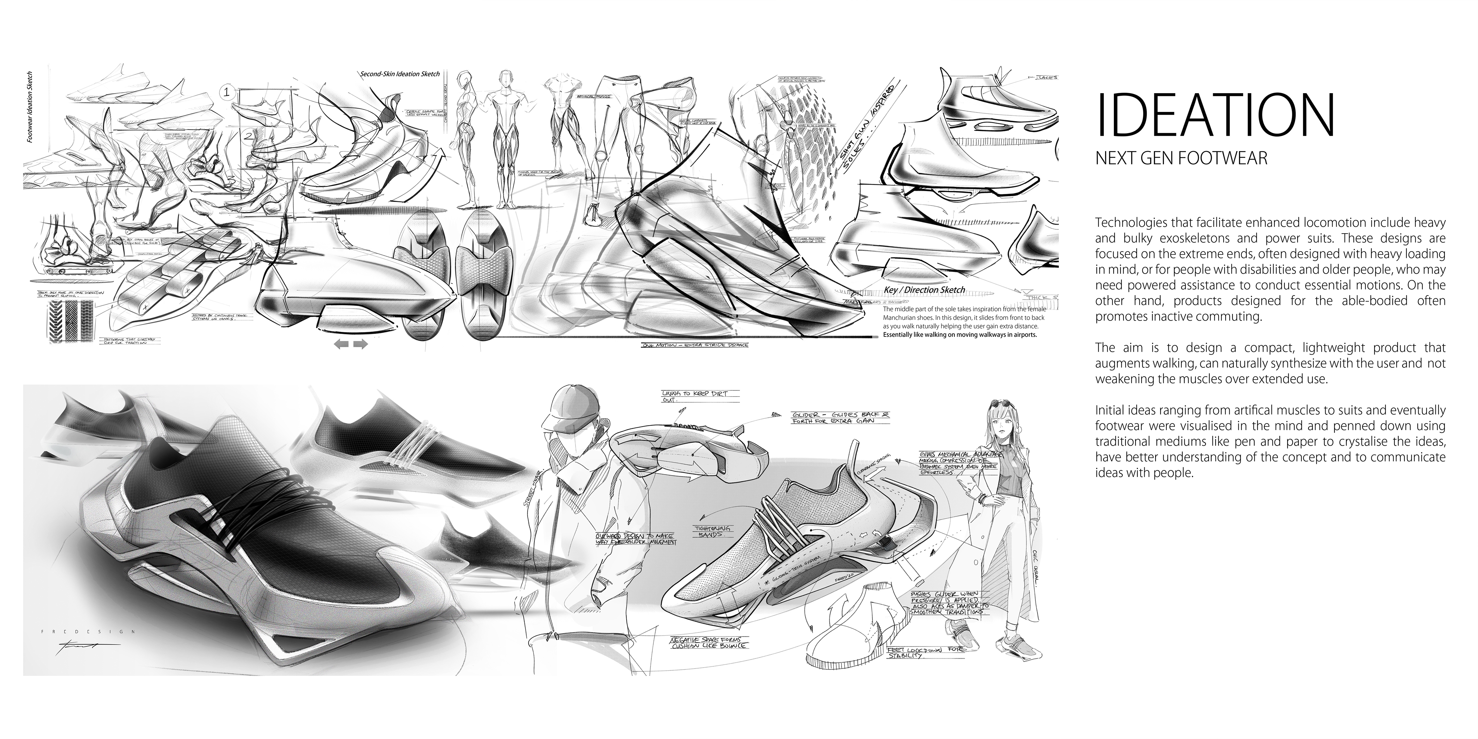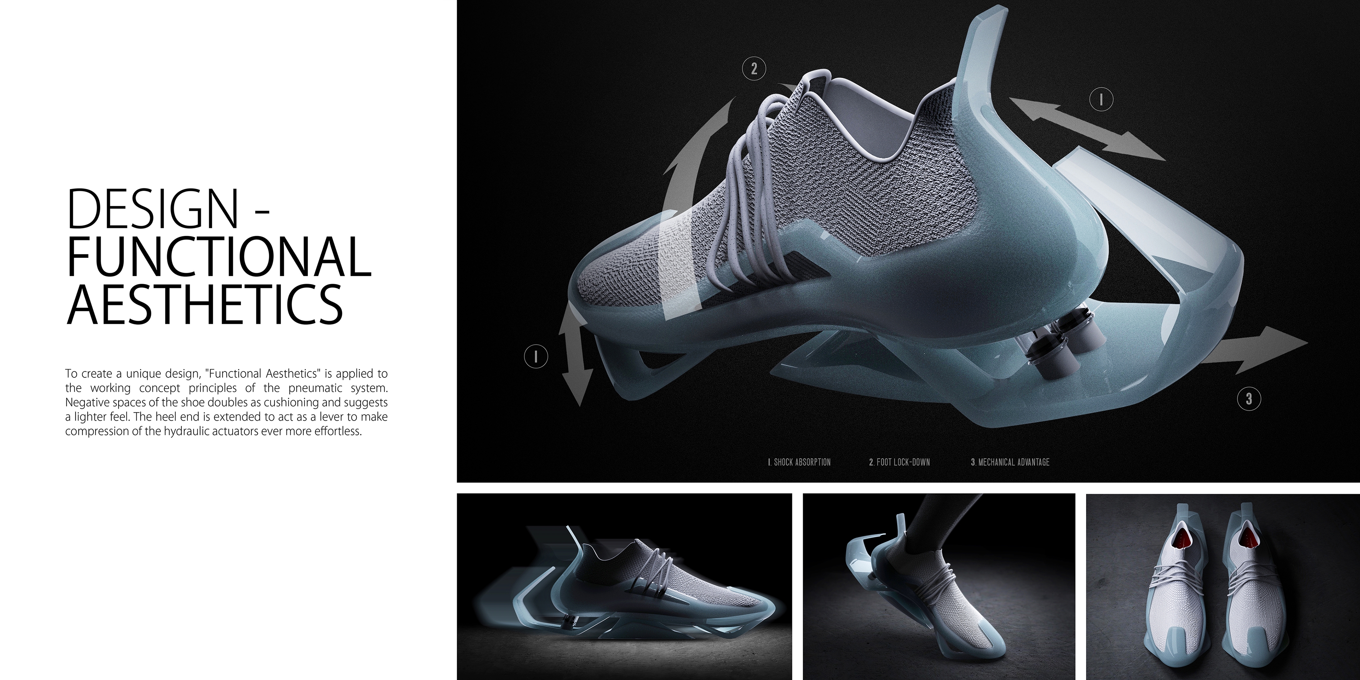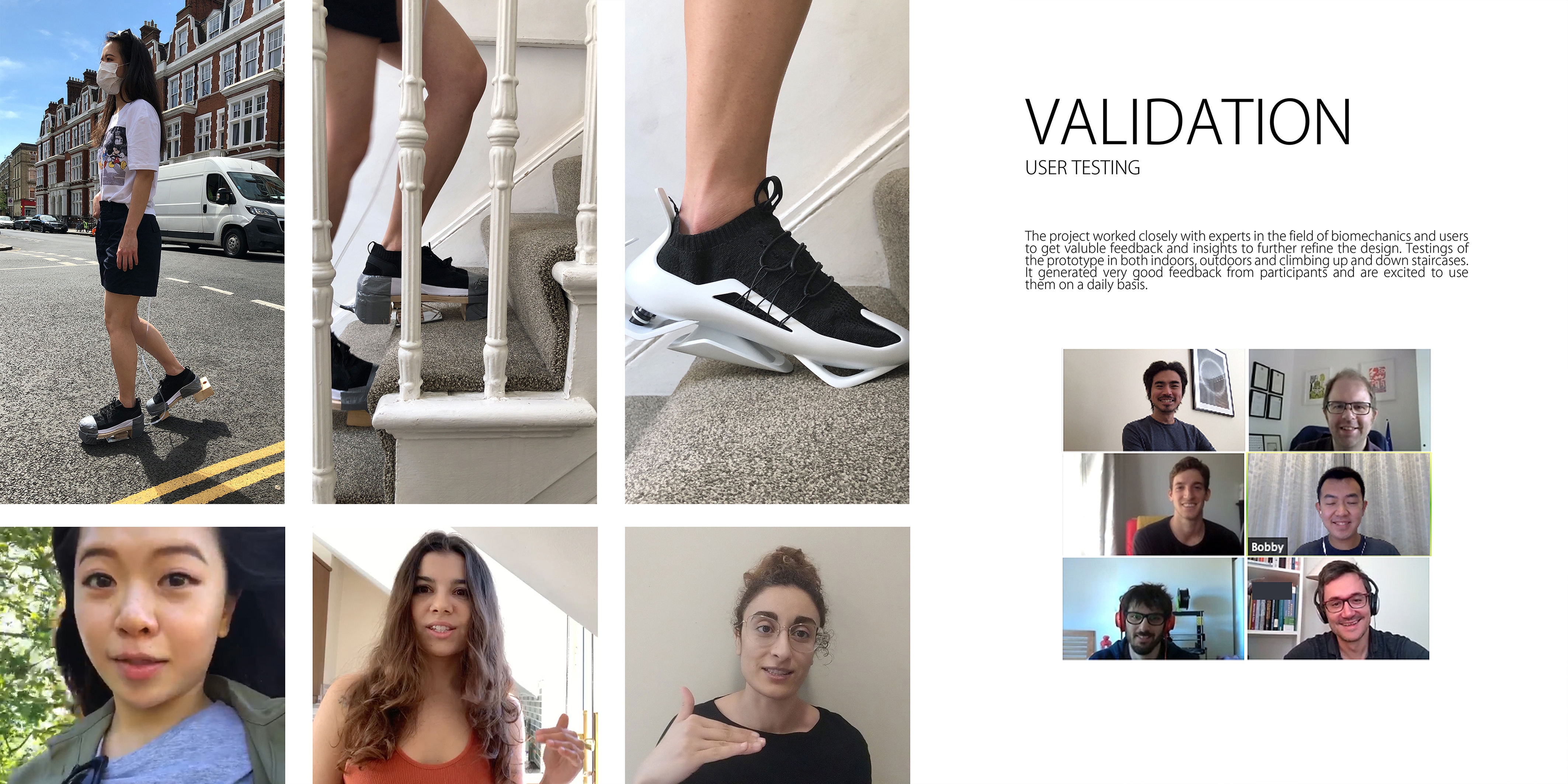 It augments the walking experience by extending our stride and walking threshold. Lightweight, human powered and requiring almost no effort, the pneumatic mechanical system within the footwear harnesses force expended from the heel strike and releases it in the mid-stance position to propel the user forward by up to 11.6%.