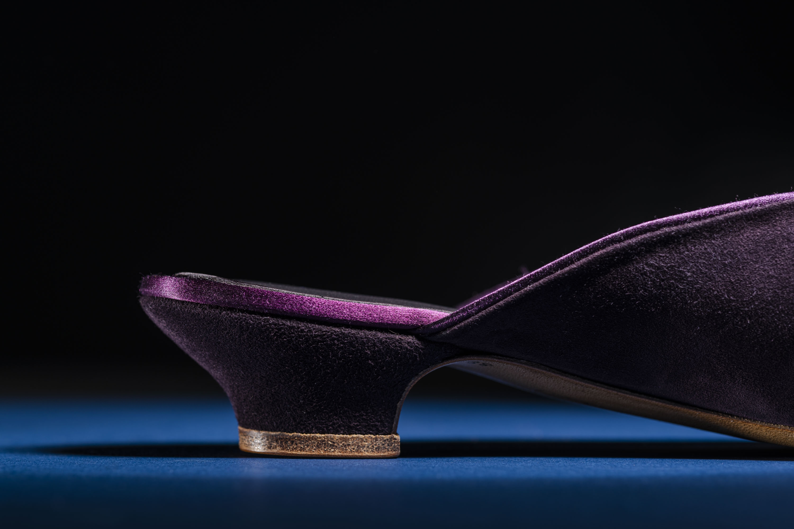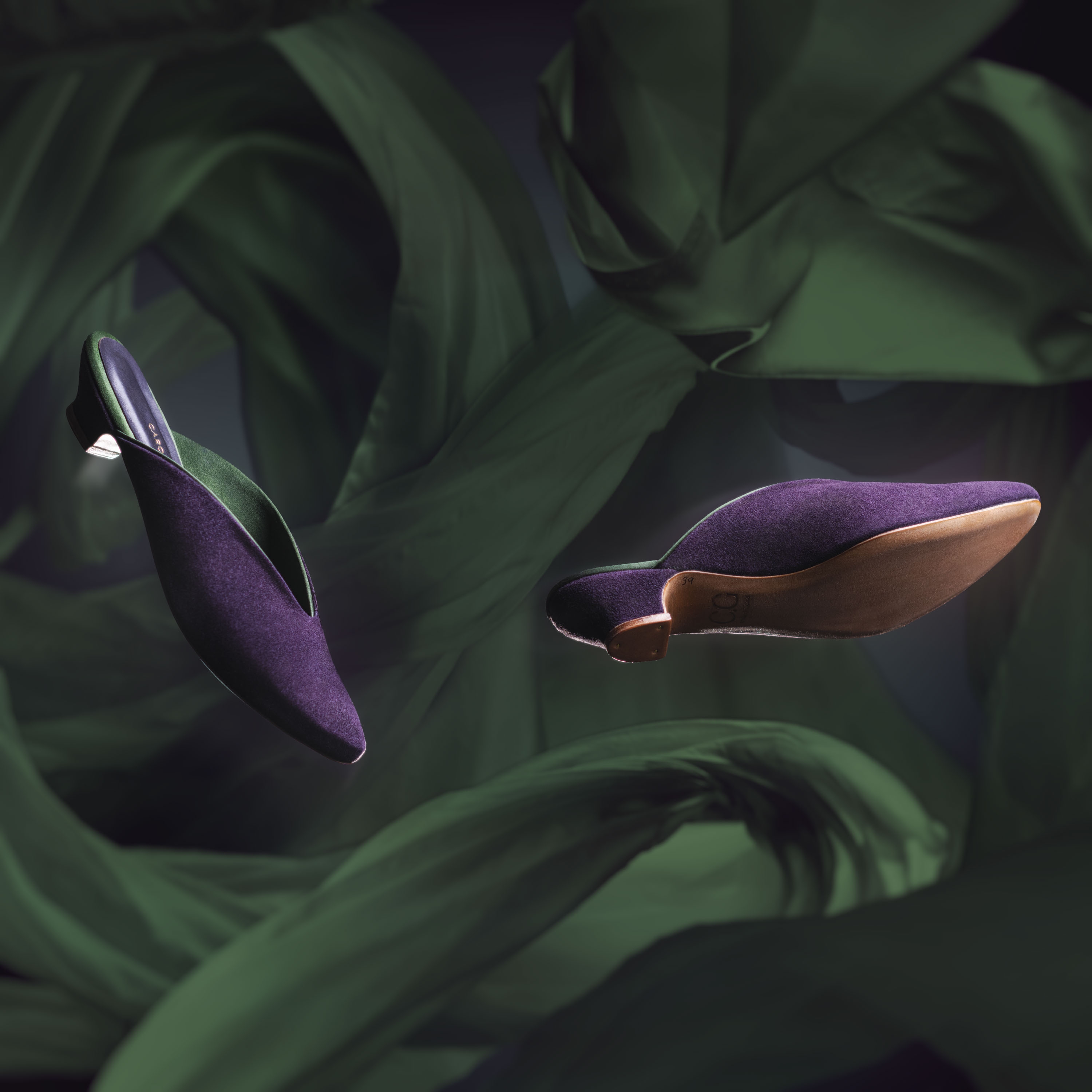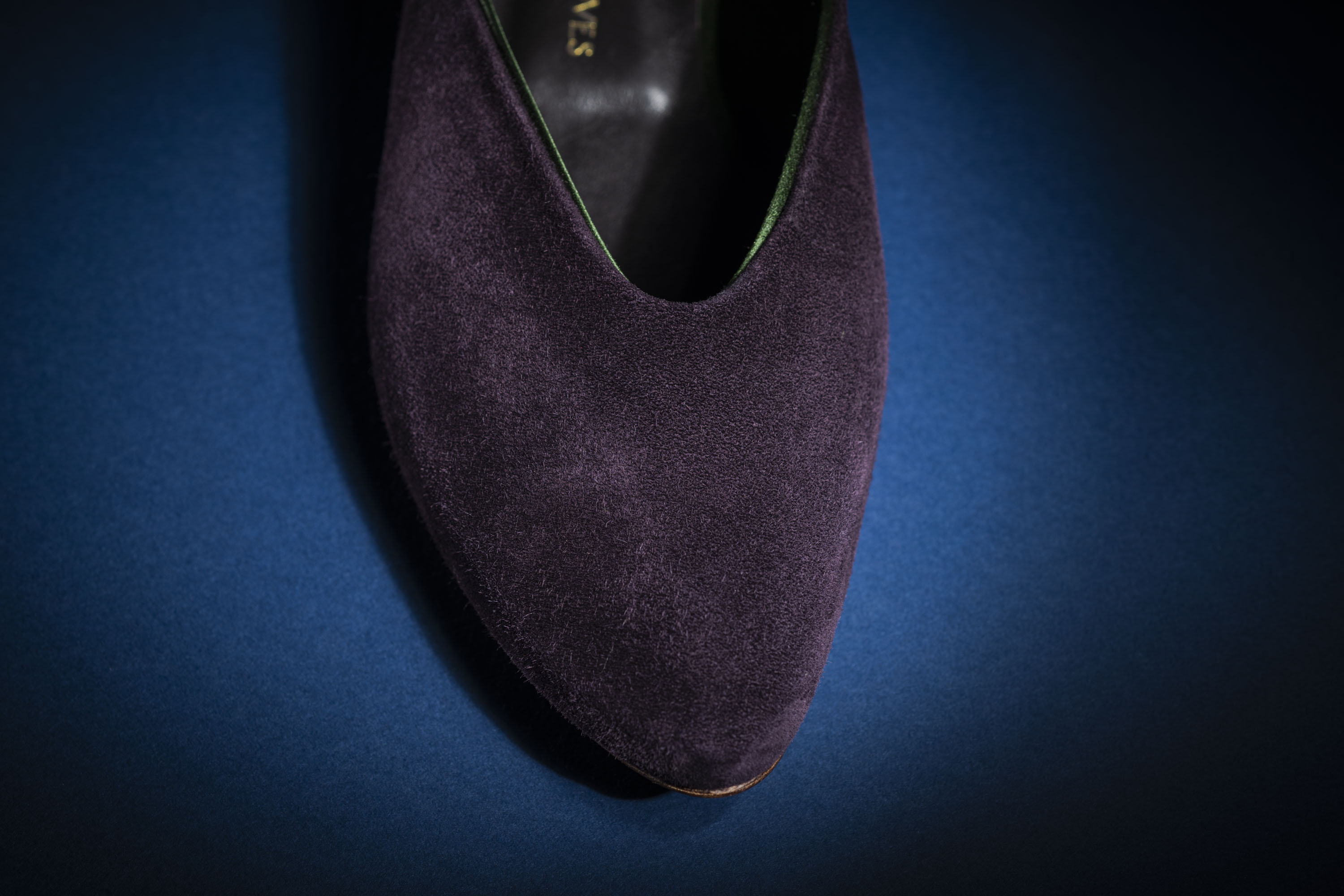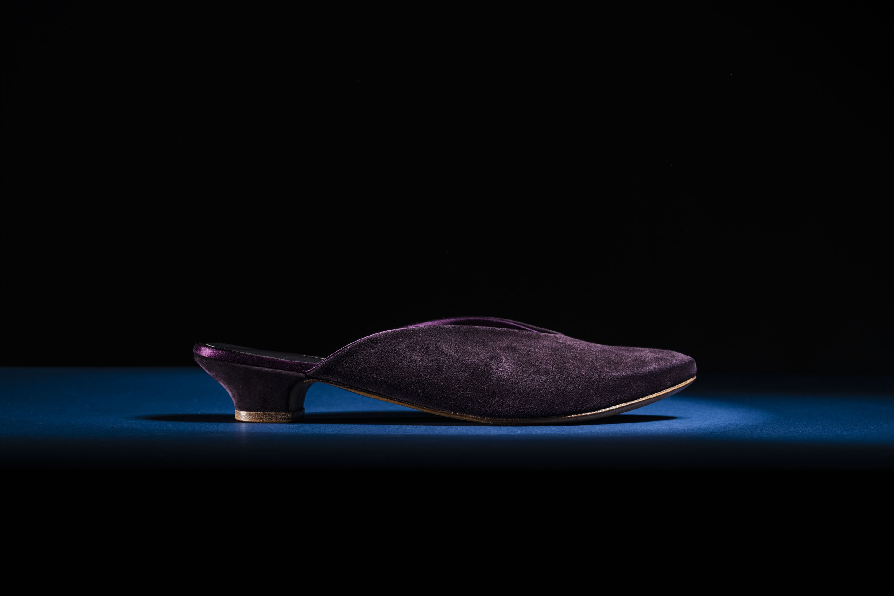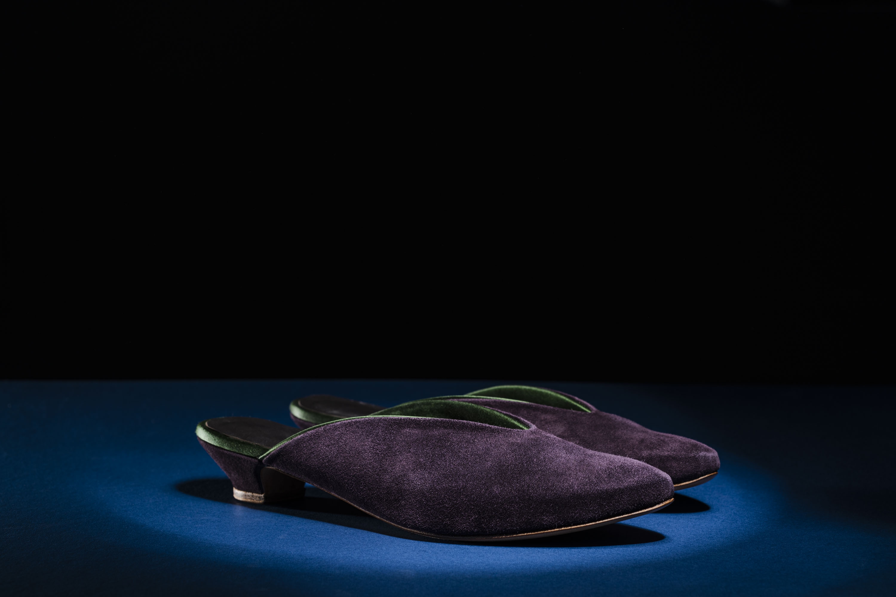 Inspired by the many versions of slippers worn along the Silk Road. Uppers in the softest Italian suede, lined in sumptuous duchess silk. Leather sock linings and covered one-inch wooden heel. Oak bark tanned leather soling, insoling, toe puffs and heel top piece. Shaped, breasted heel. Asymmetric toe shape, in a gently turned-up style, with leather toe puffs moulded by hand. This design is a modern-day interpretation of historical influences from around the world - something luxurious to wear while working from home, or to elevate an evening pant-suit, or to lounge in luxury.