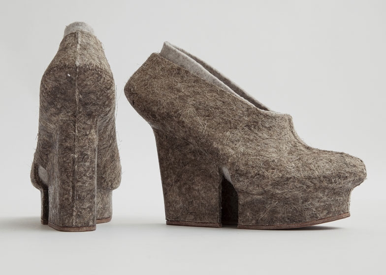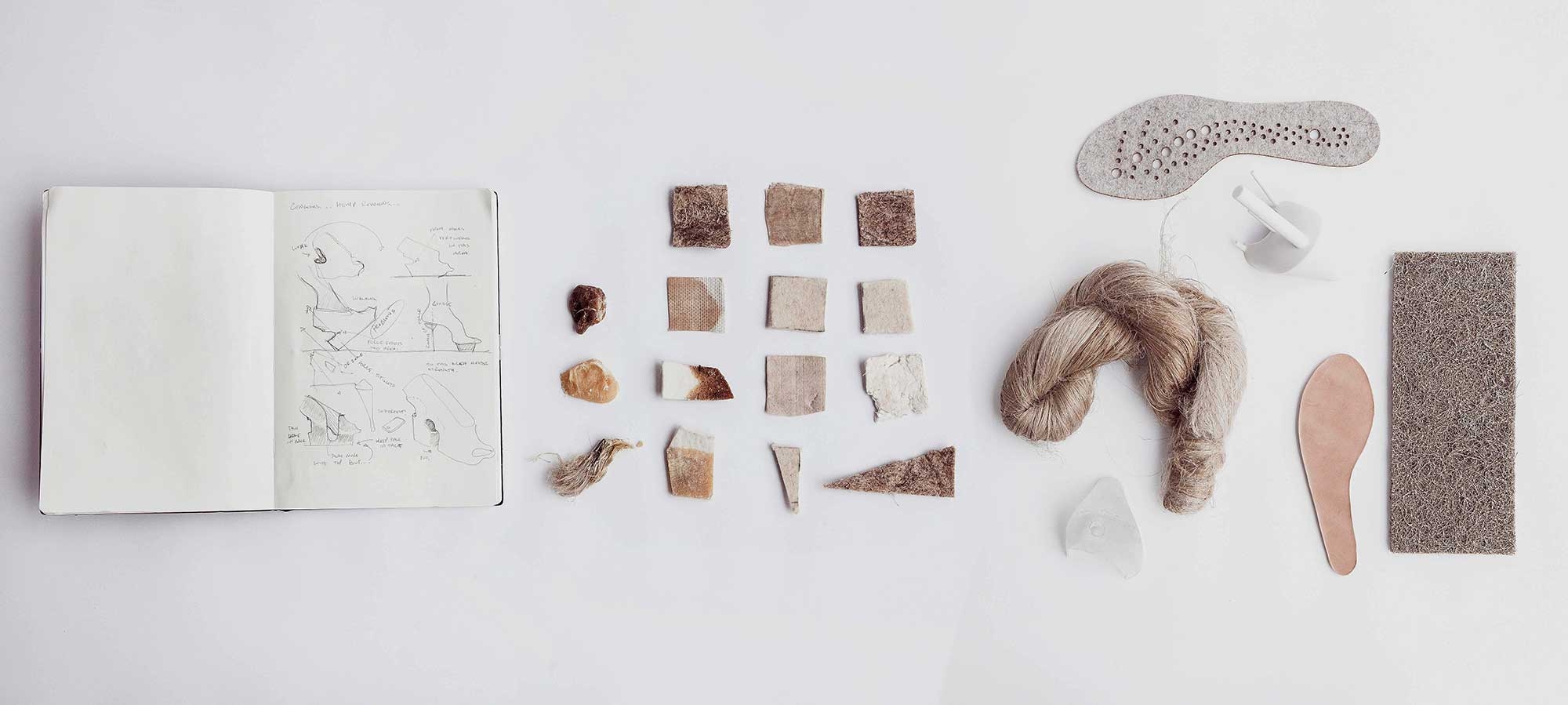 We translate anatomical and emotional perspectives of the body into design for items we wear - from footwear to fashion apparel. We run design thinking workshops with collaborators and wearers, evoking insights to create solutions for critical design and future manufacturing. A collection of varied natural non woven materials were selected and applied to a methodology in a masters educational context.