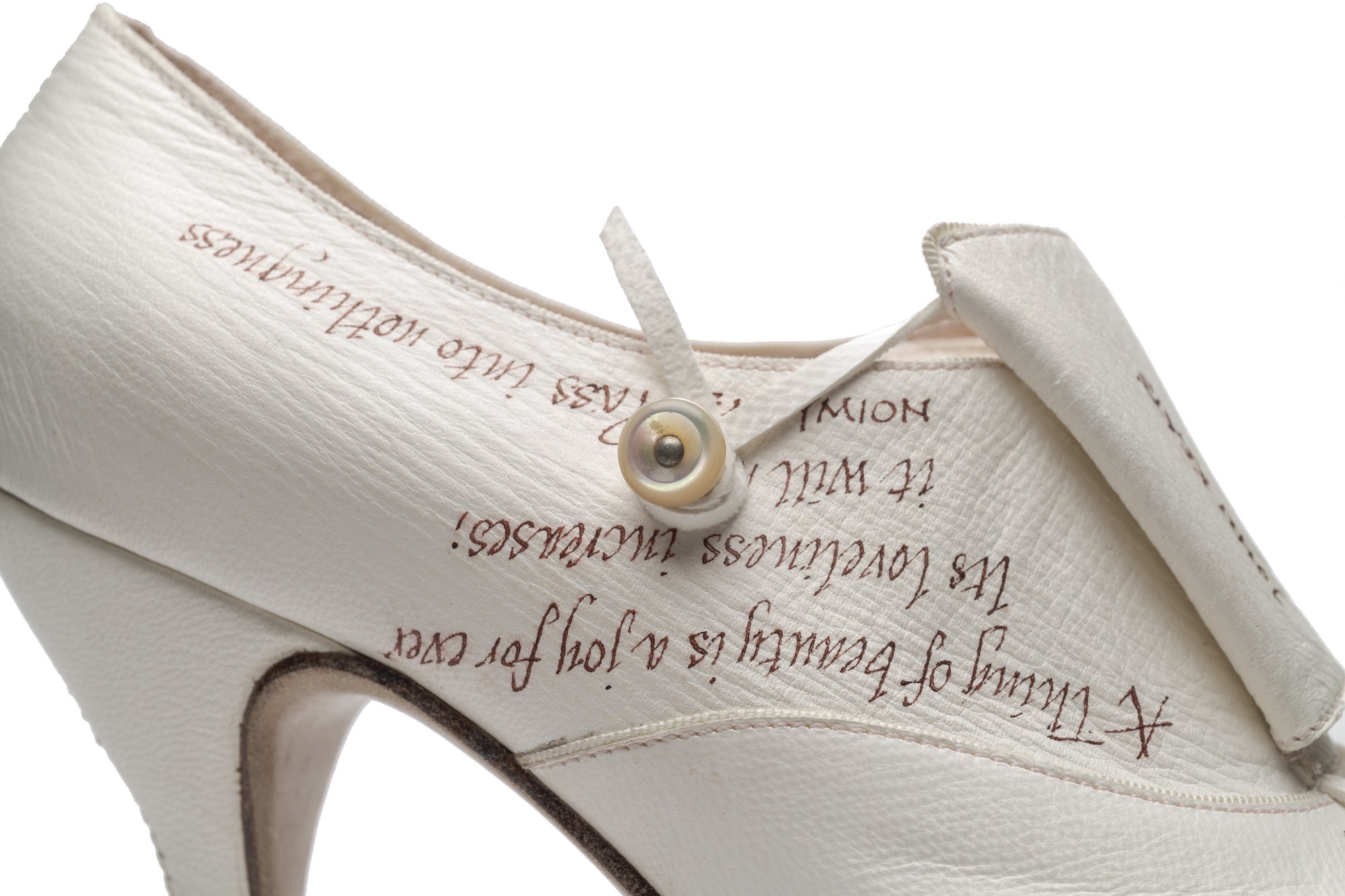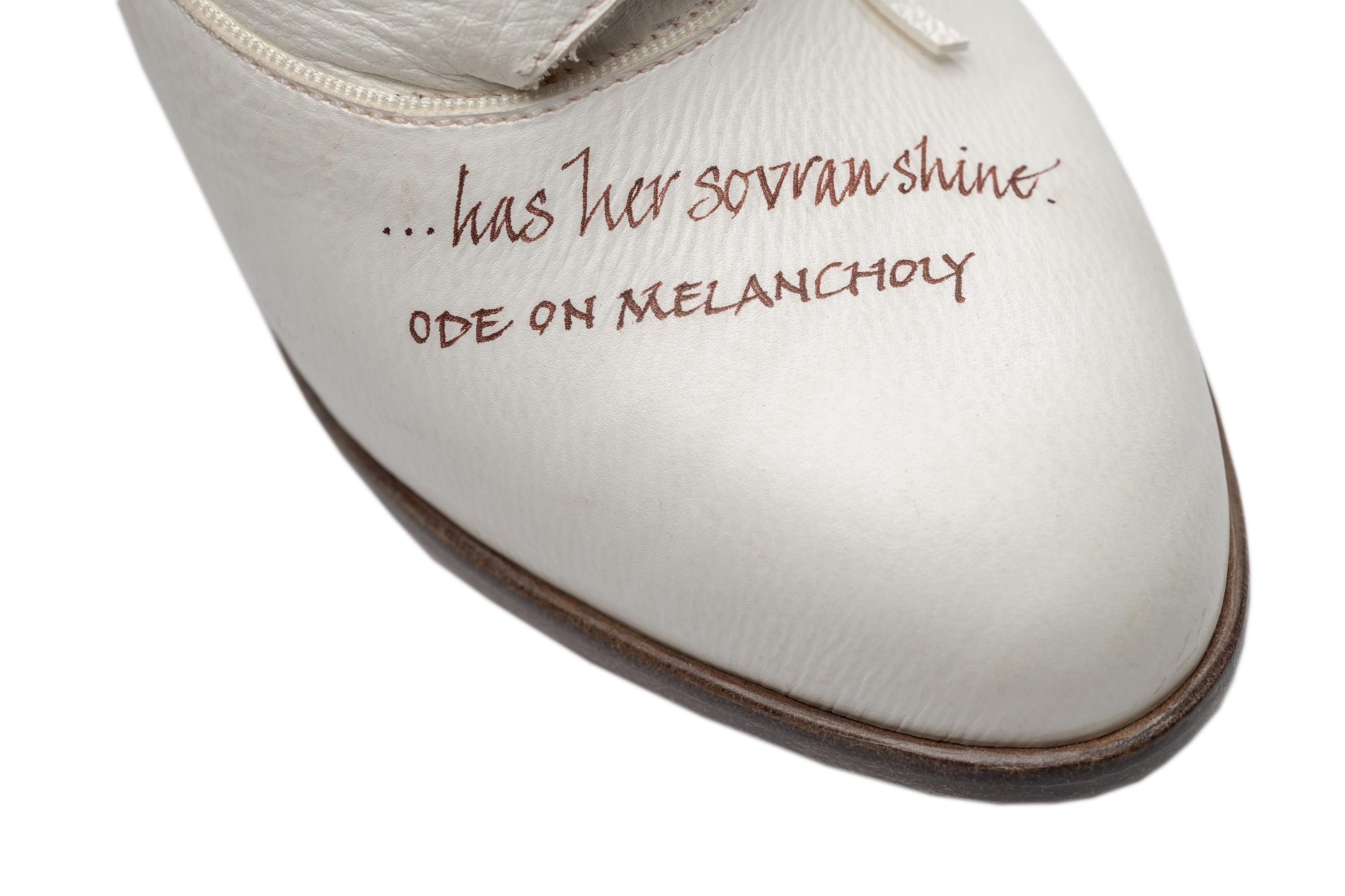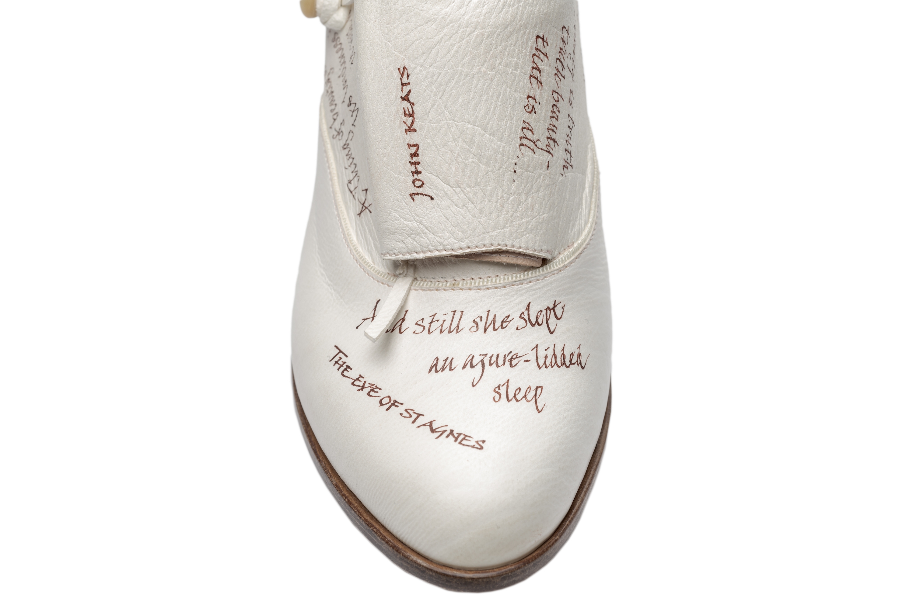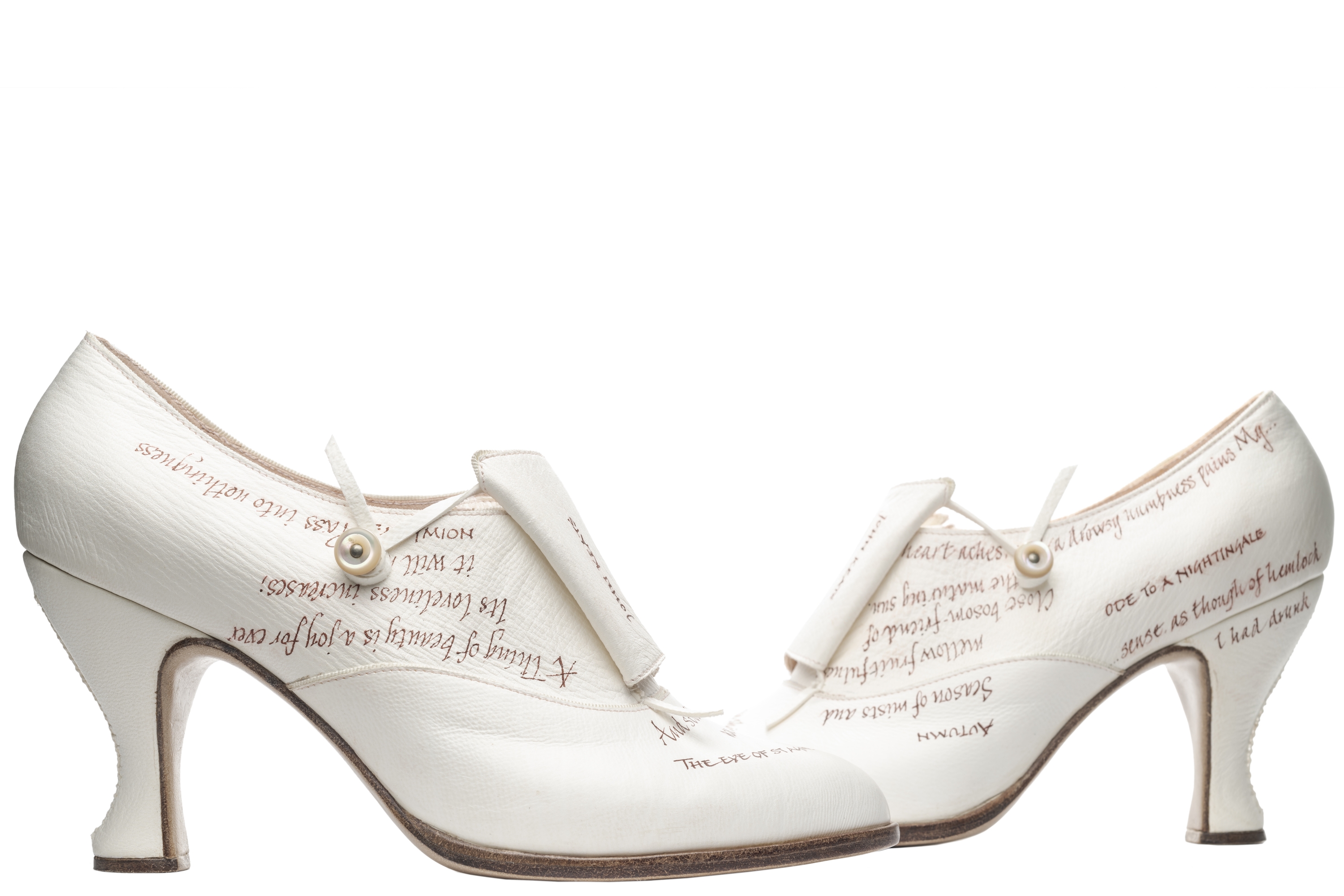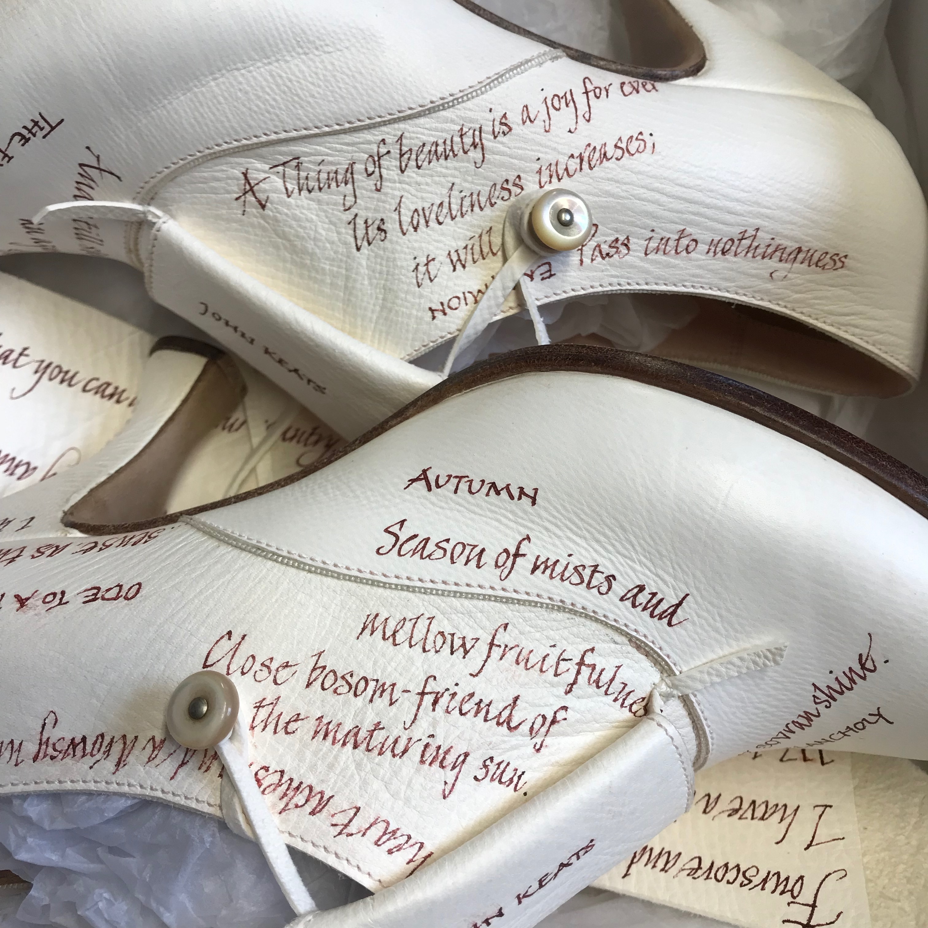 Custom design based on the classic oxford, adapted with a distinctive and innovative bellows tongue and vintage button fastening. Alum-tawed leather upper with hand-scribed calligraphy featuring the client's favourite lines from the poetry of John Keats. Hand-stitched details. Natural linings. Oak bark tanned leather soling, insoling and stiffeners. 3-inch leather-covered wooden Coq heel. Breasted sole. This shoe brings together elements of art, poetry and craftsmanship only found in bespoke work. Several inks and leathers were tested during the design development. Completely handmade.