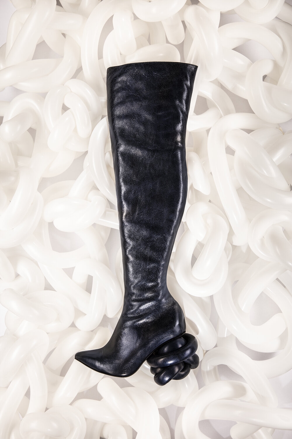 Our sleek and supple Infinity thigh high boots sit mid way on the thigh, and feature our signature knotted heel. A hidden metal frame gives the heel stability, and the striking, squidgy knot coils around it. TABITHA RINGWOOD is a bespoke footwear designer. Her shoes explore the sense of touch through a variety of recycled materials and textures, encouraging engagement in order to allow for constant evolution of the relationship between the wearer and what is worn. With an unprecedented look and feel, her tactile shoes are the result of a complex, entirely handcrafted manufacturing process.