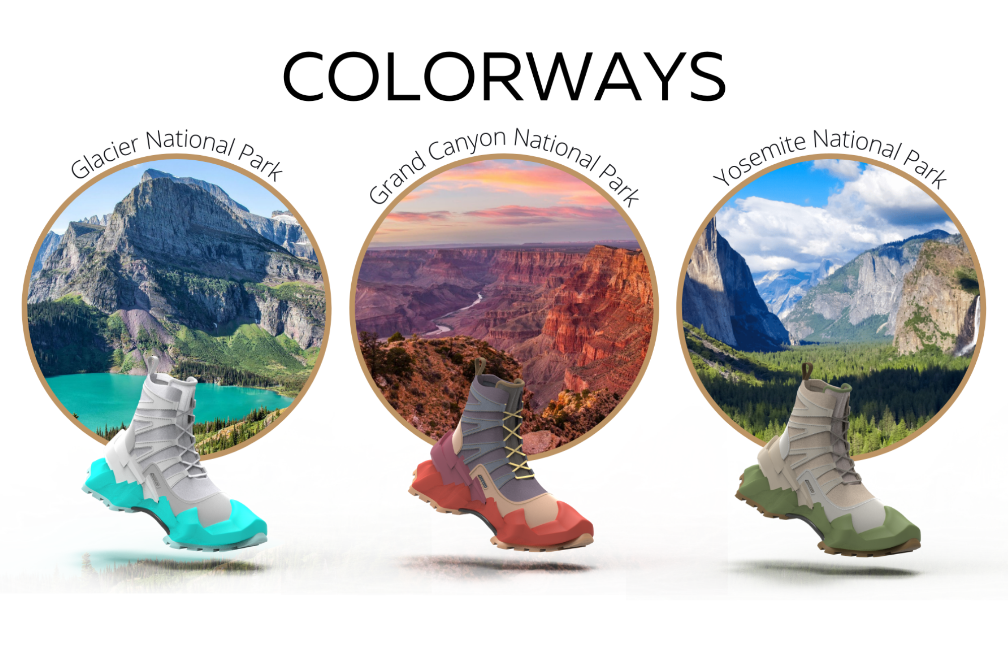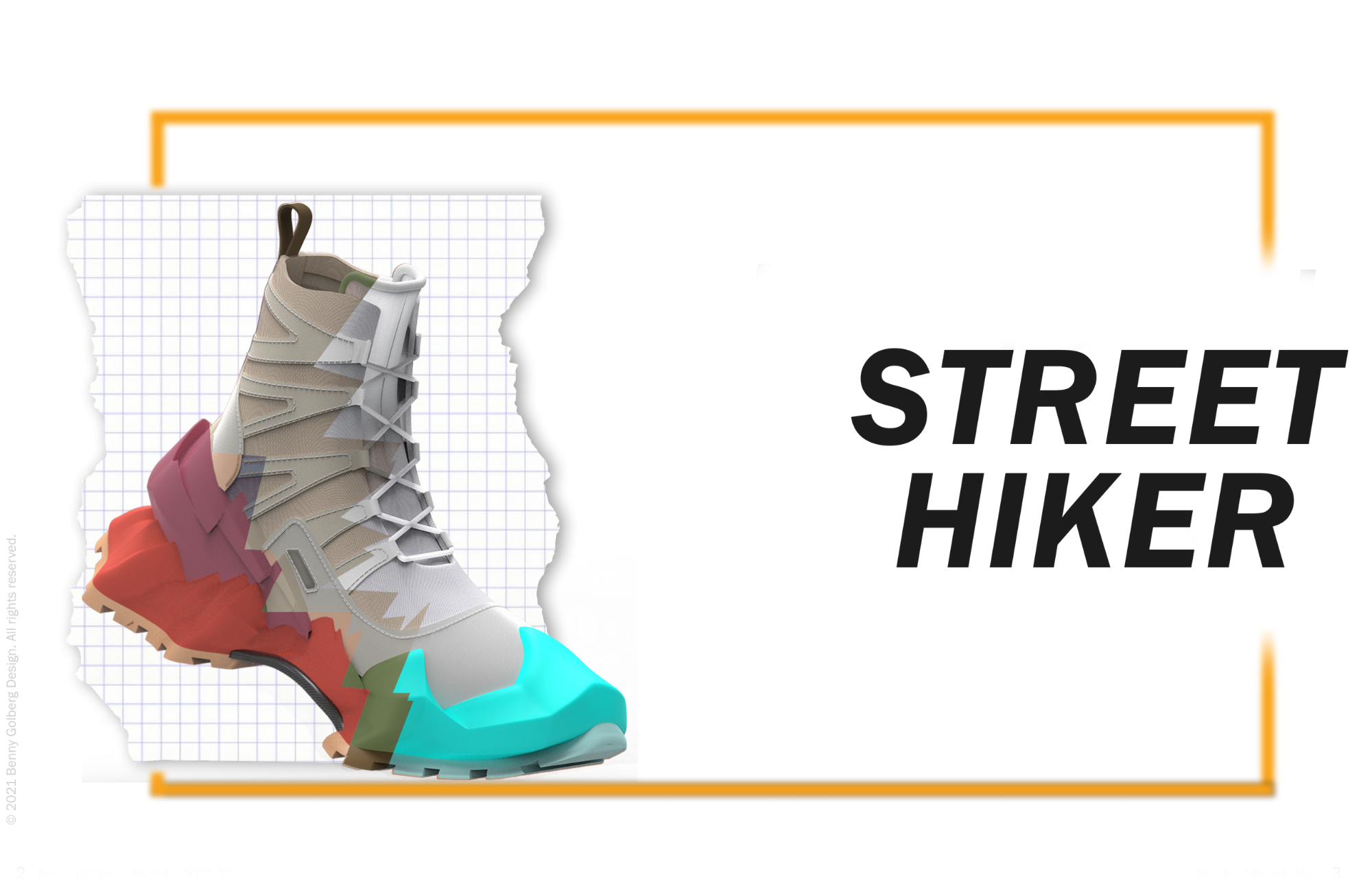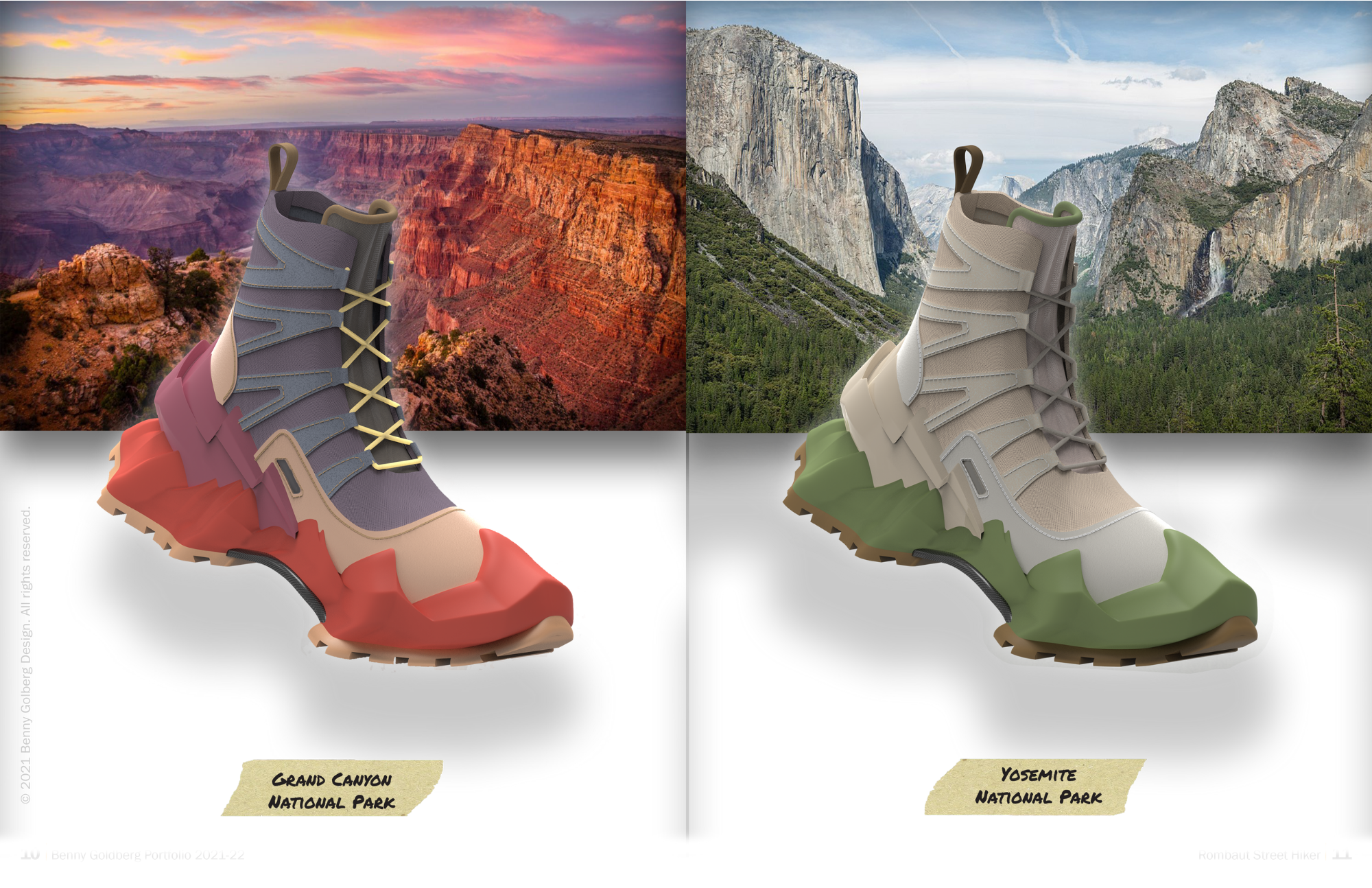 The boot features a mountain range-inspired midsole and heel cup to express the idea of bringing the mountains to the streets. The boot incorporates a mesh upper with suede paneling, rope laces, a heel pull tab, and a carbon fiber shank. The Street Hiker colorways are based upon National Parks, pushing the concept of bringing nature's beauty to the urban streets.