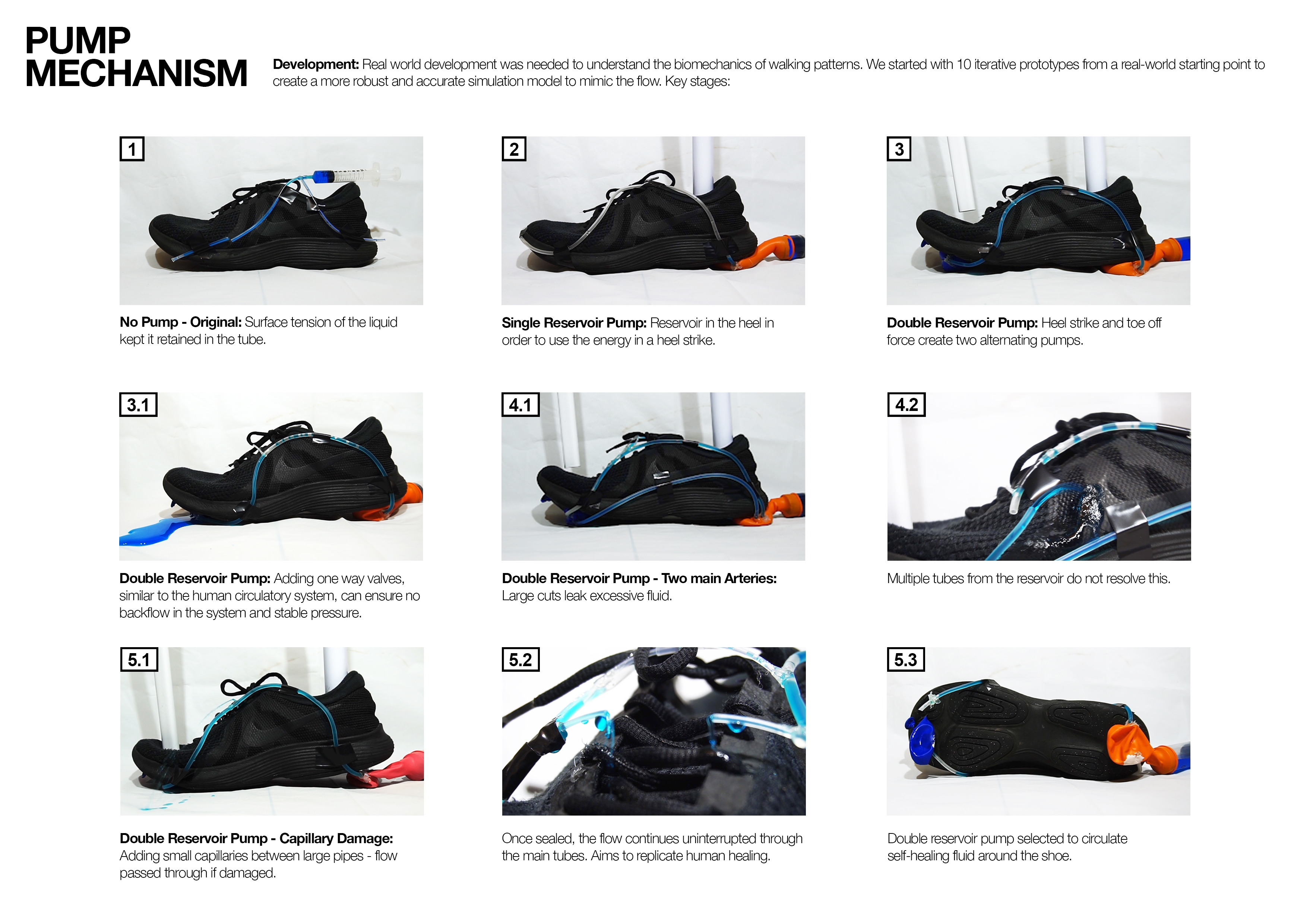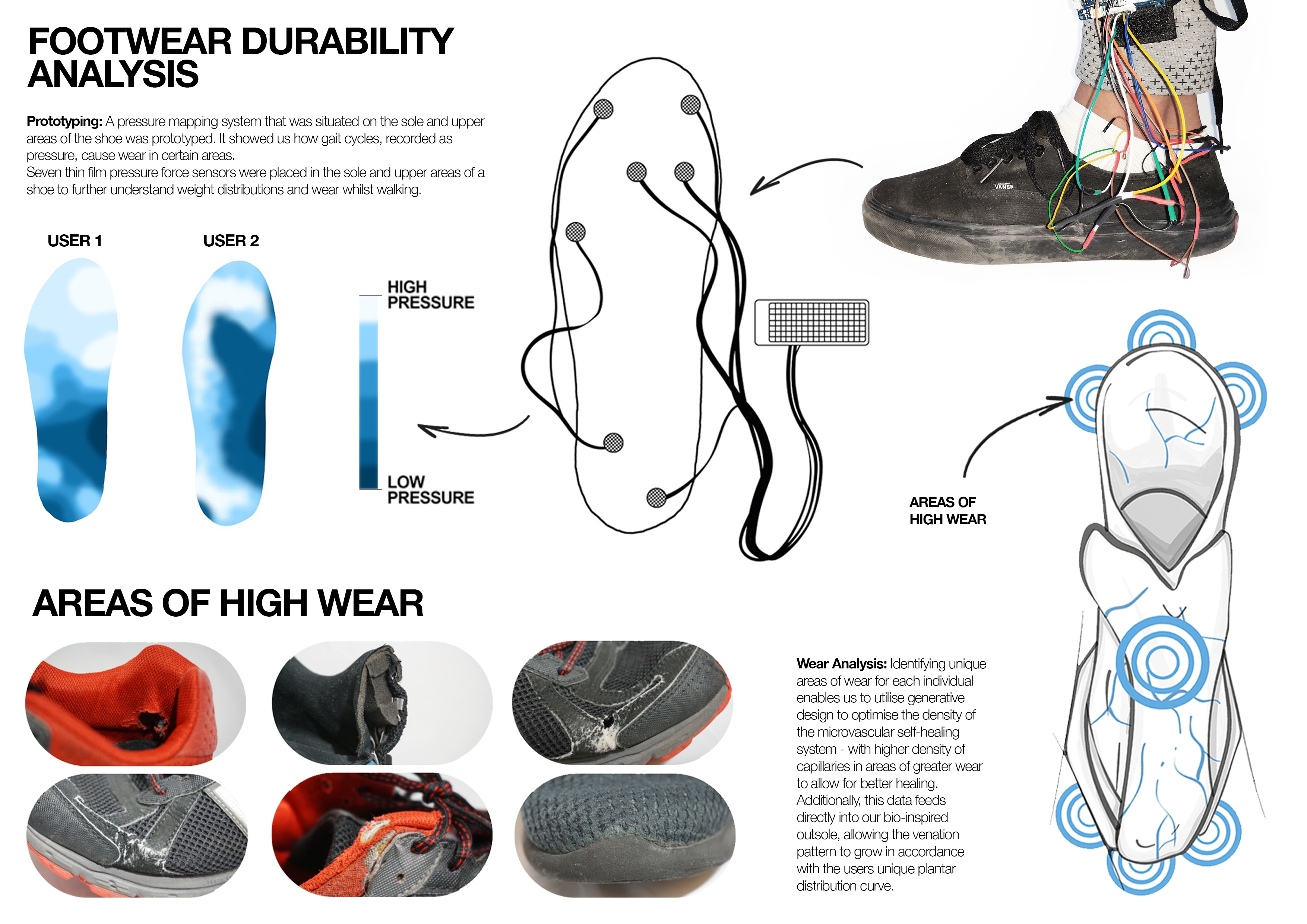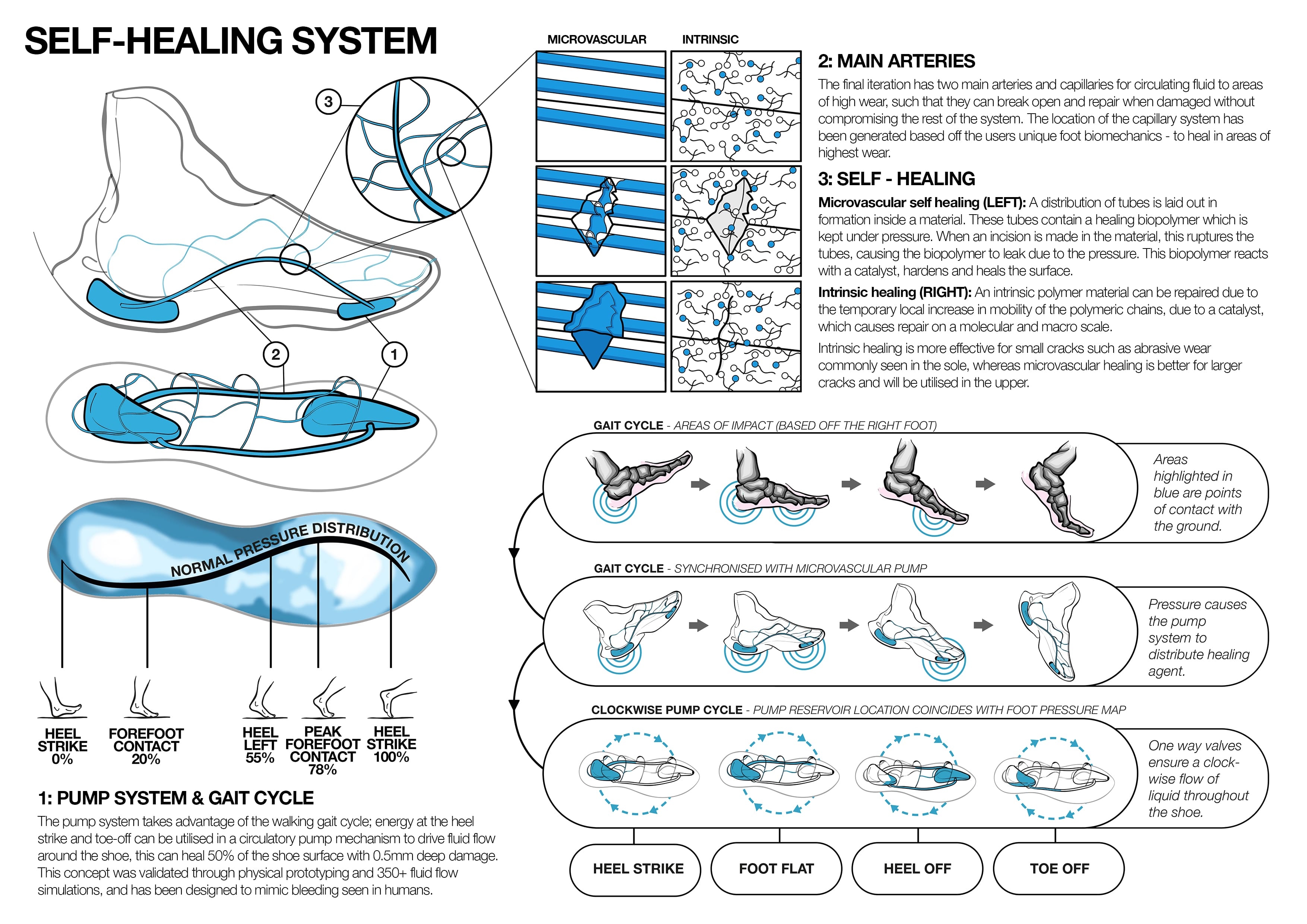 Fashion is decoupled from the physical shoe as users can change styles with AR skins enabled by RFID. The base shoe is optimised for comfort and sustainability. 50% of its total surface area can be regenerated through a user specific microvascular healing structure, made via 3D printing. Biopolymer healing fluid is circulated by a biomechanic synced pump.