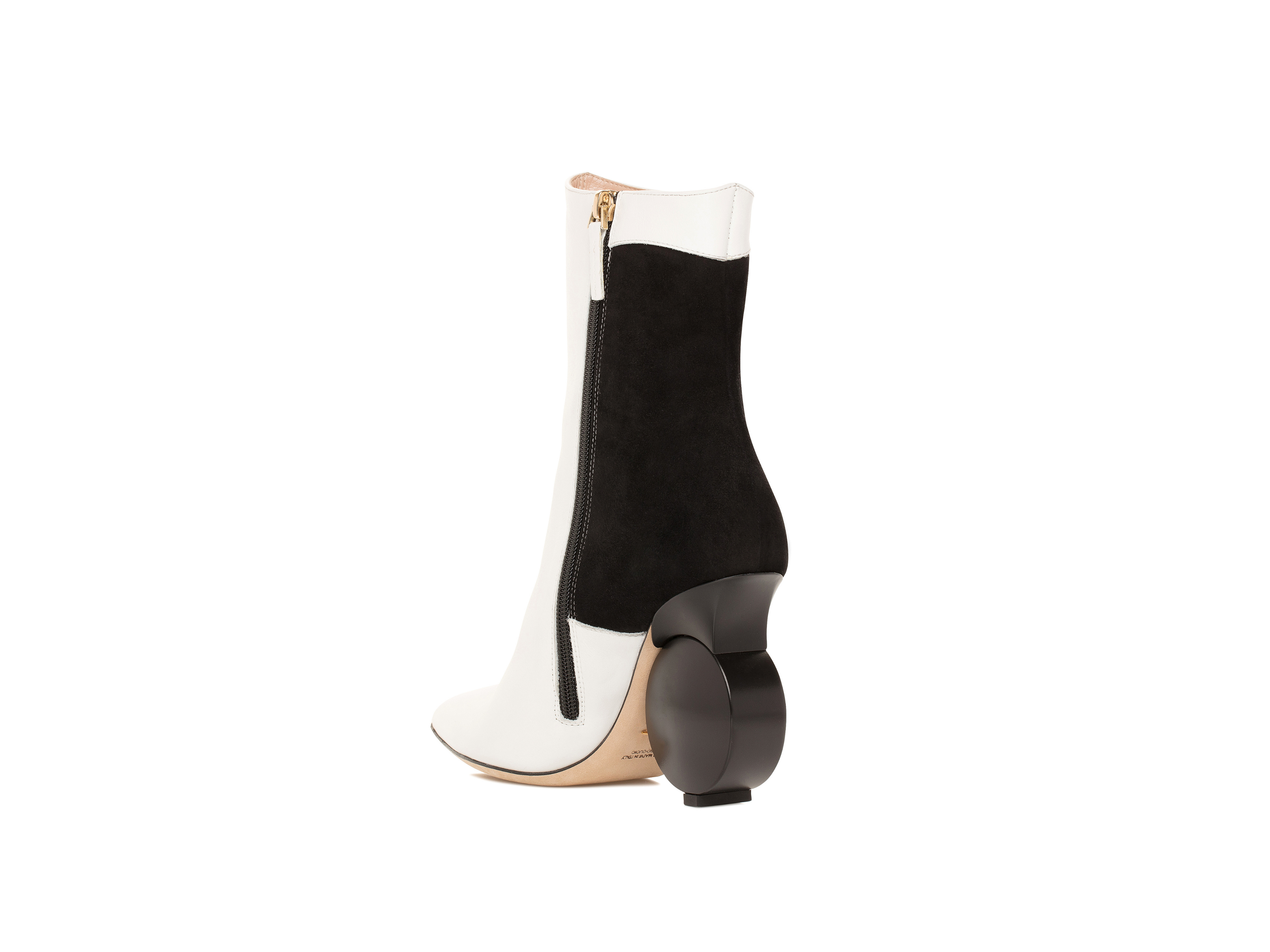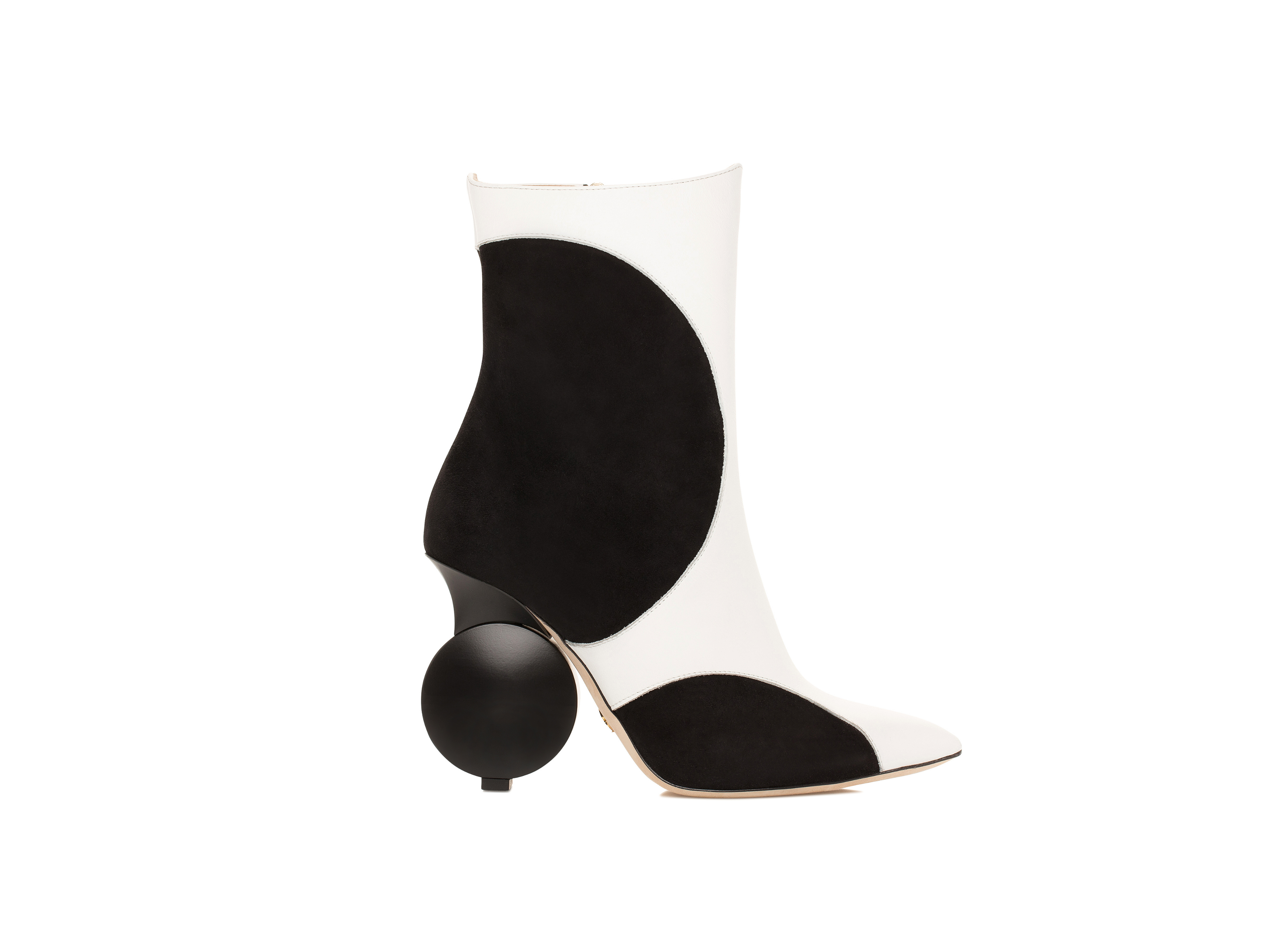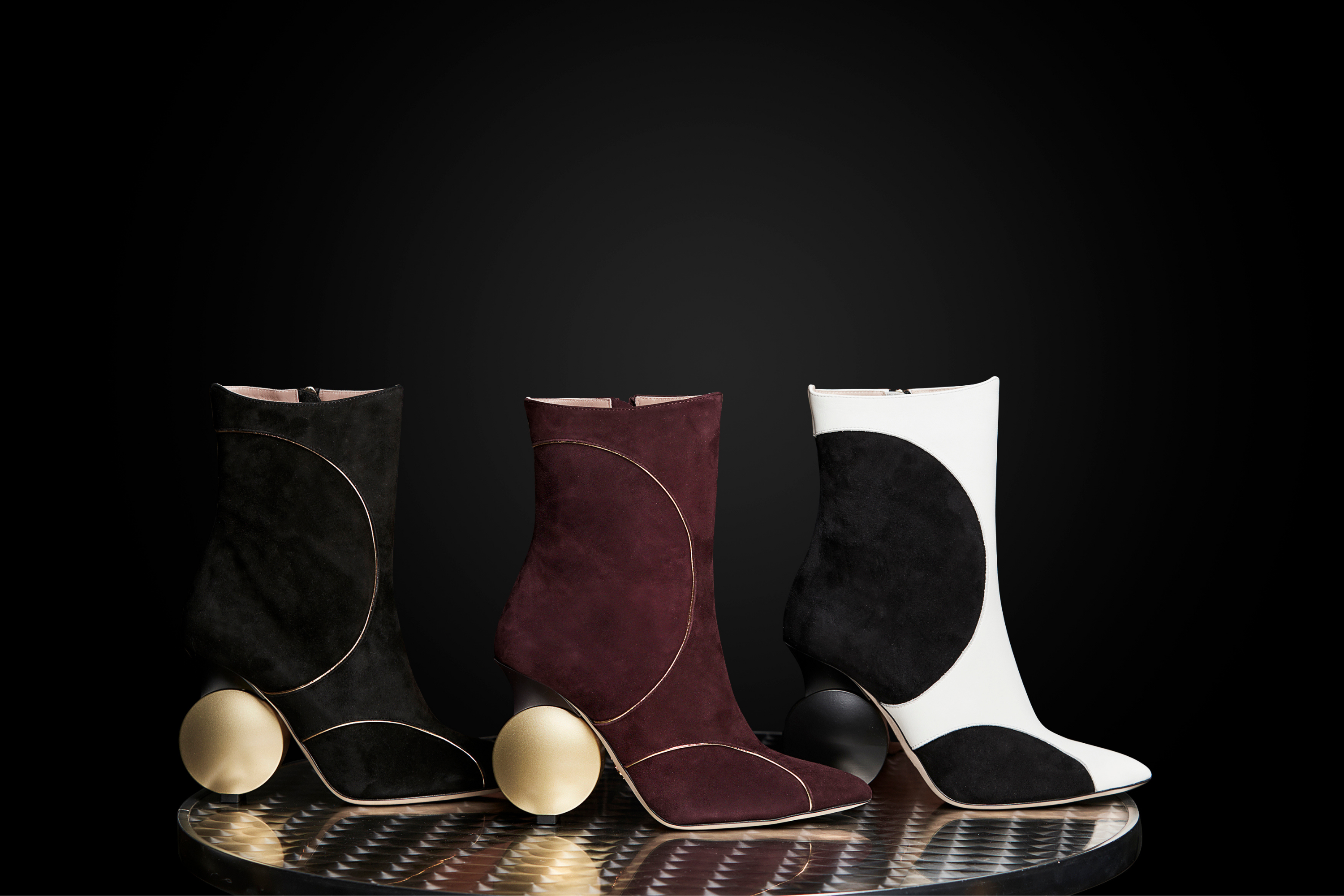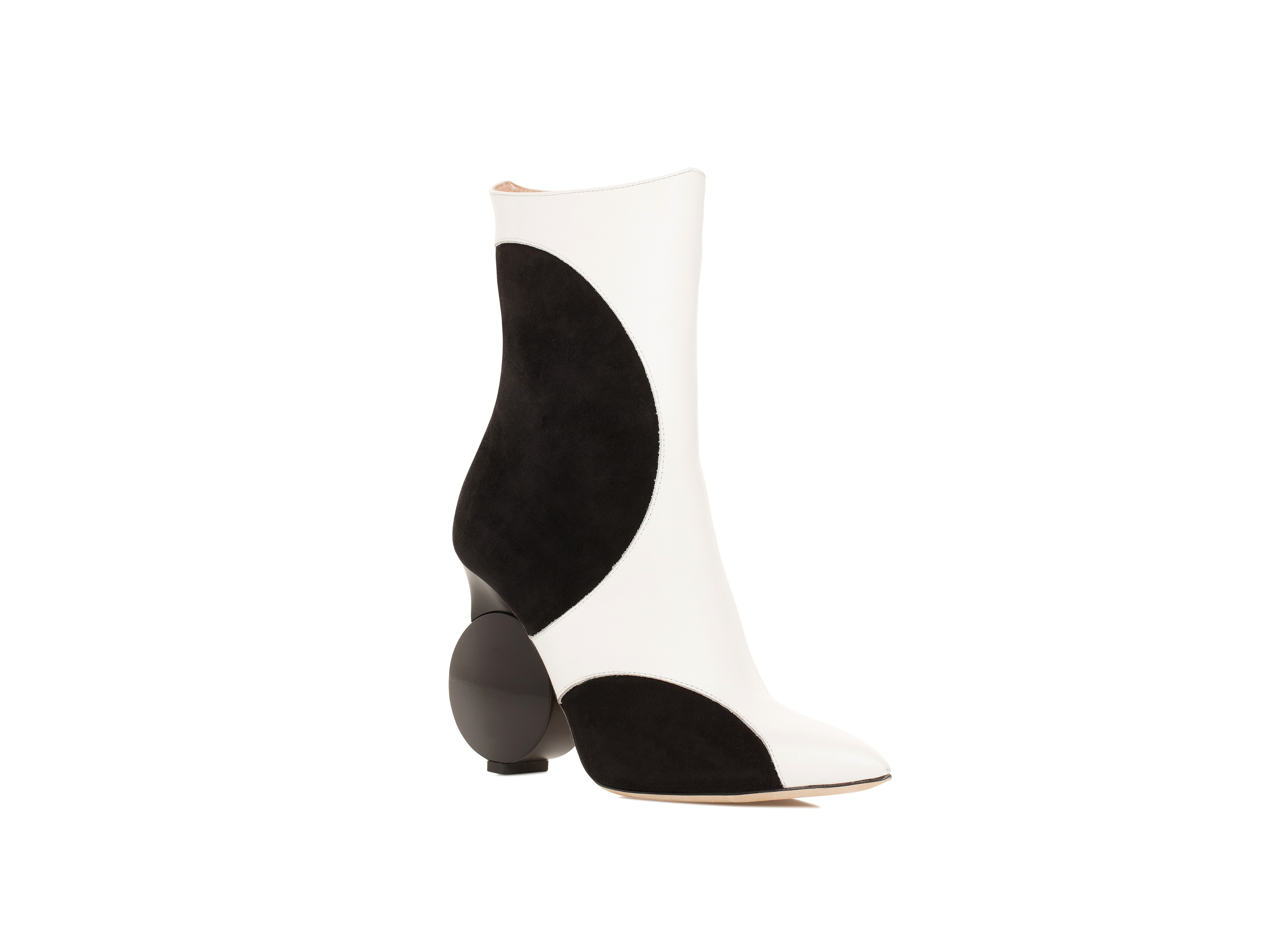 The Julee boot was named after Julee Wilson, Beauty Director of Cosmopolitan Magazine. It was inspired by the eclipse of the sun and the idea that spheres represent motion, vitality, wholeness, completion, and perfection. The contrast between black and white illustrates that the beginning and the end of cycles are always repeating.
