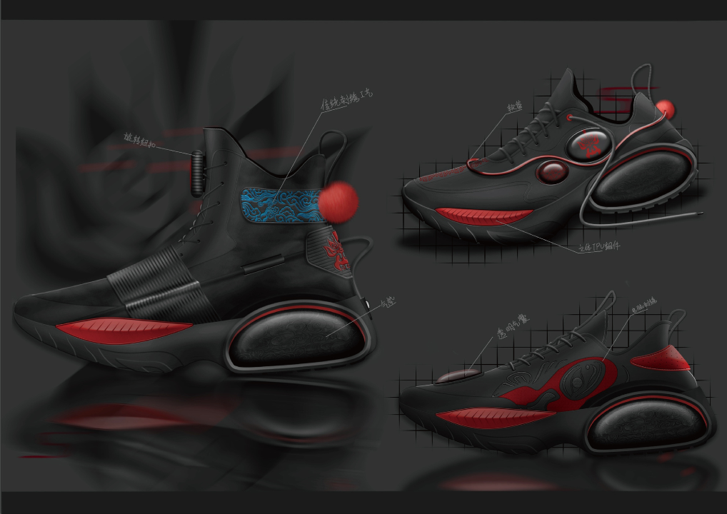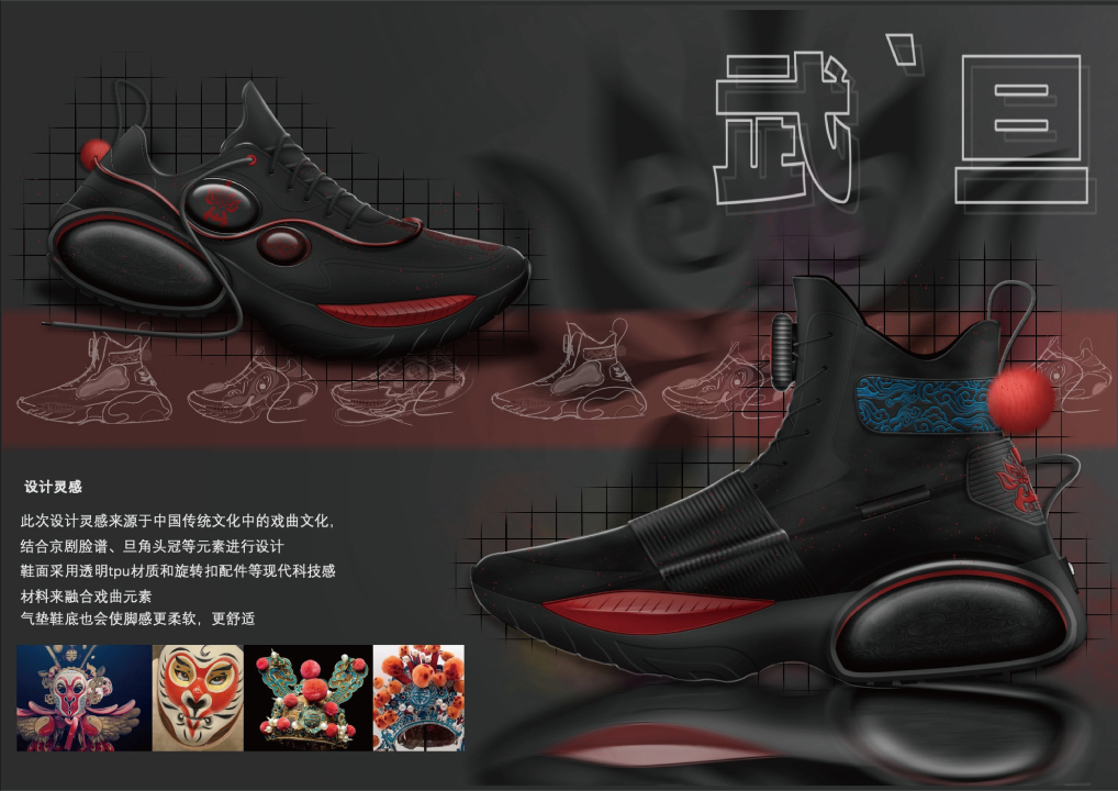 The inspiration for this design comes from the opera culture in traditional Chinese culture, combined with elements such as Peking opera facial makeup and dan jiao head crowns. The vamp uses modern technological materials such as transparent tpu material and rotating buckle accessories to integrate opera elements.