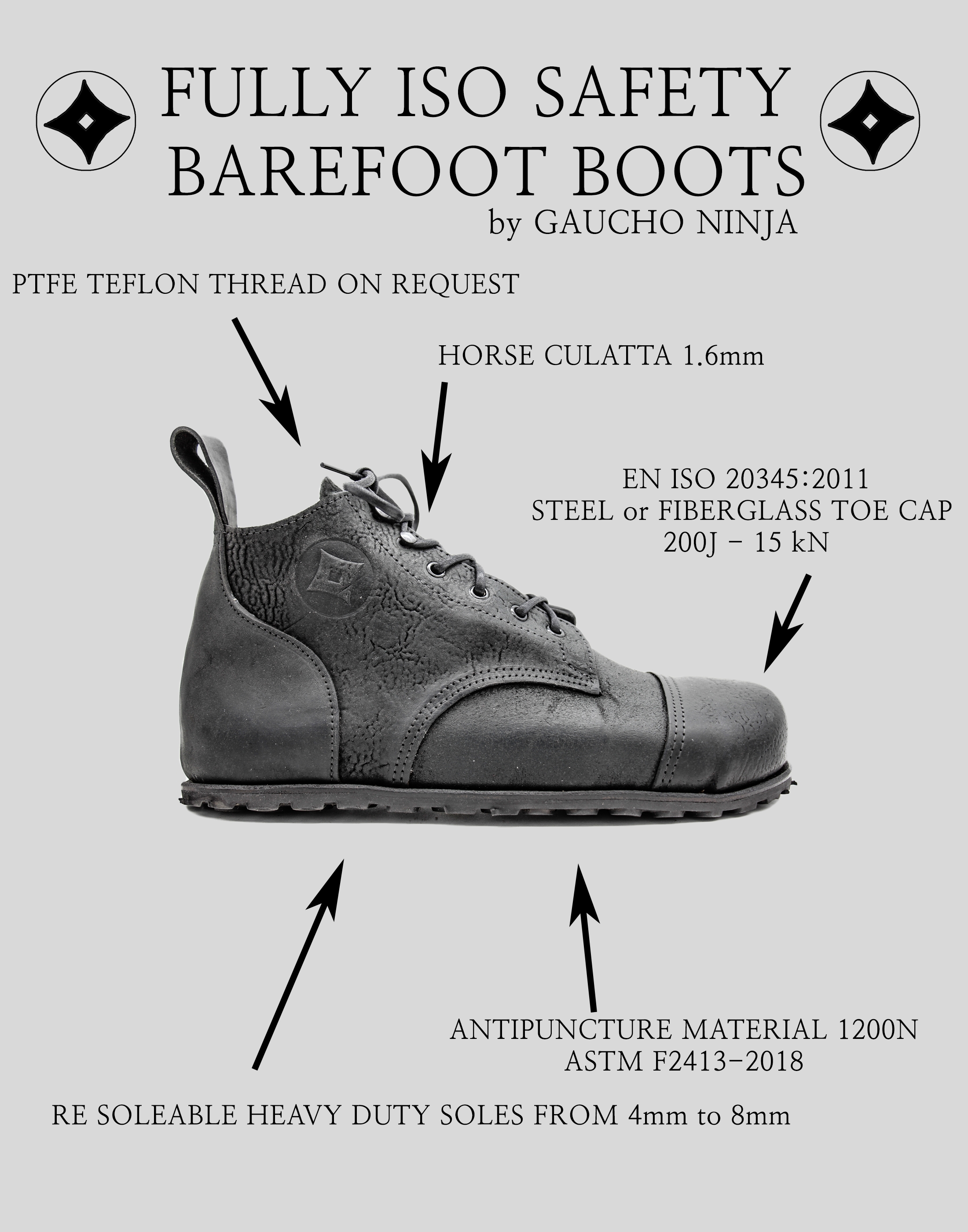 Featuring veg tan reversed horse culatta, wide splay fully ISO steel or fiberglass toe caps (200J) and flexible antipuncture insoles (1200N) with the optional waterproof and anti cut linings, PTFE thread.
