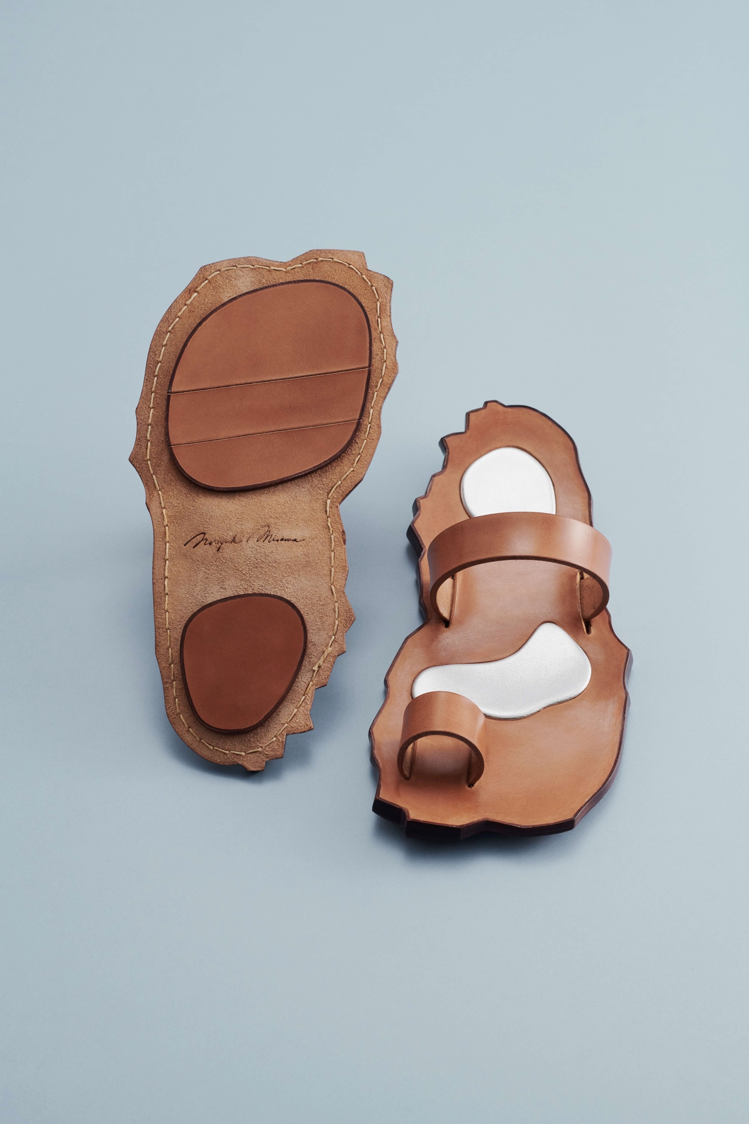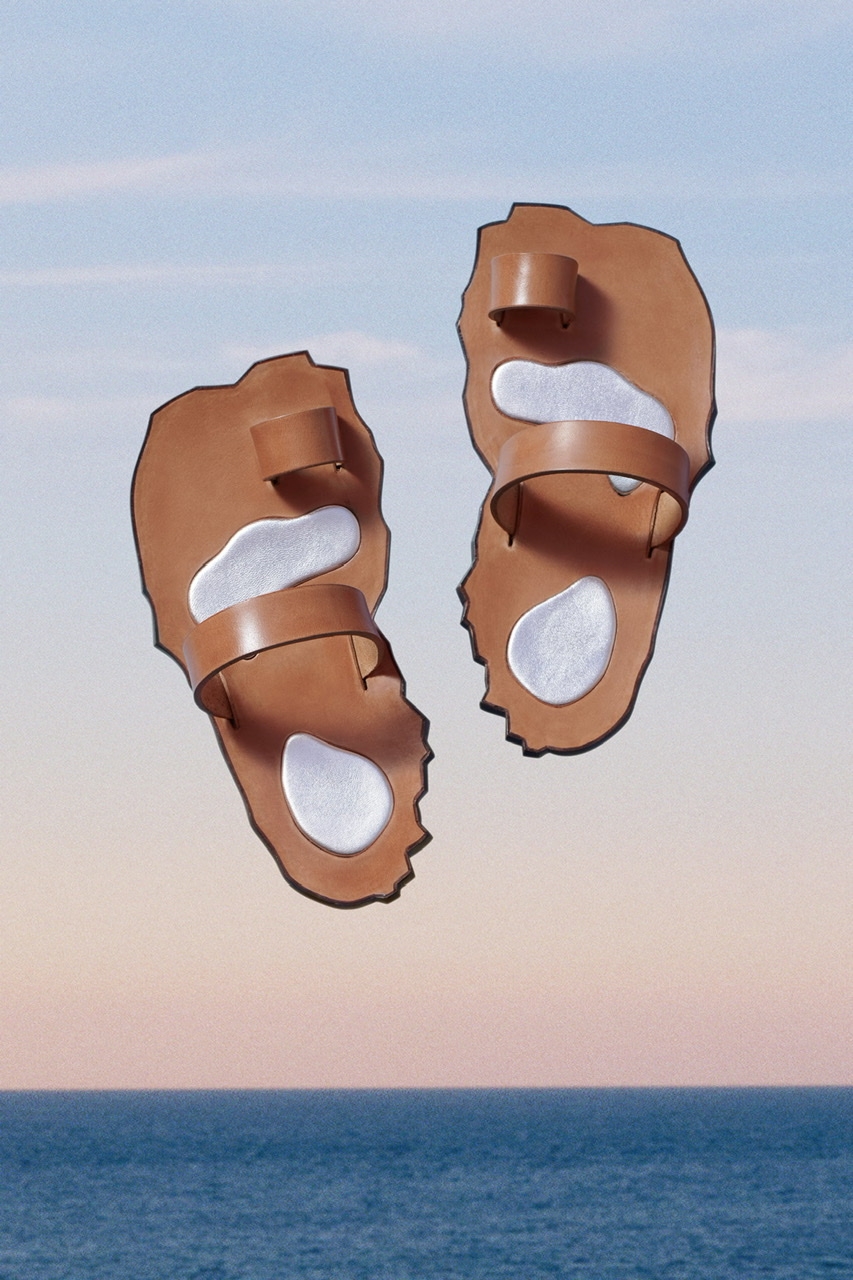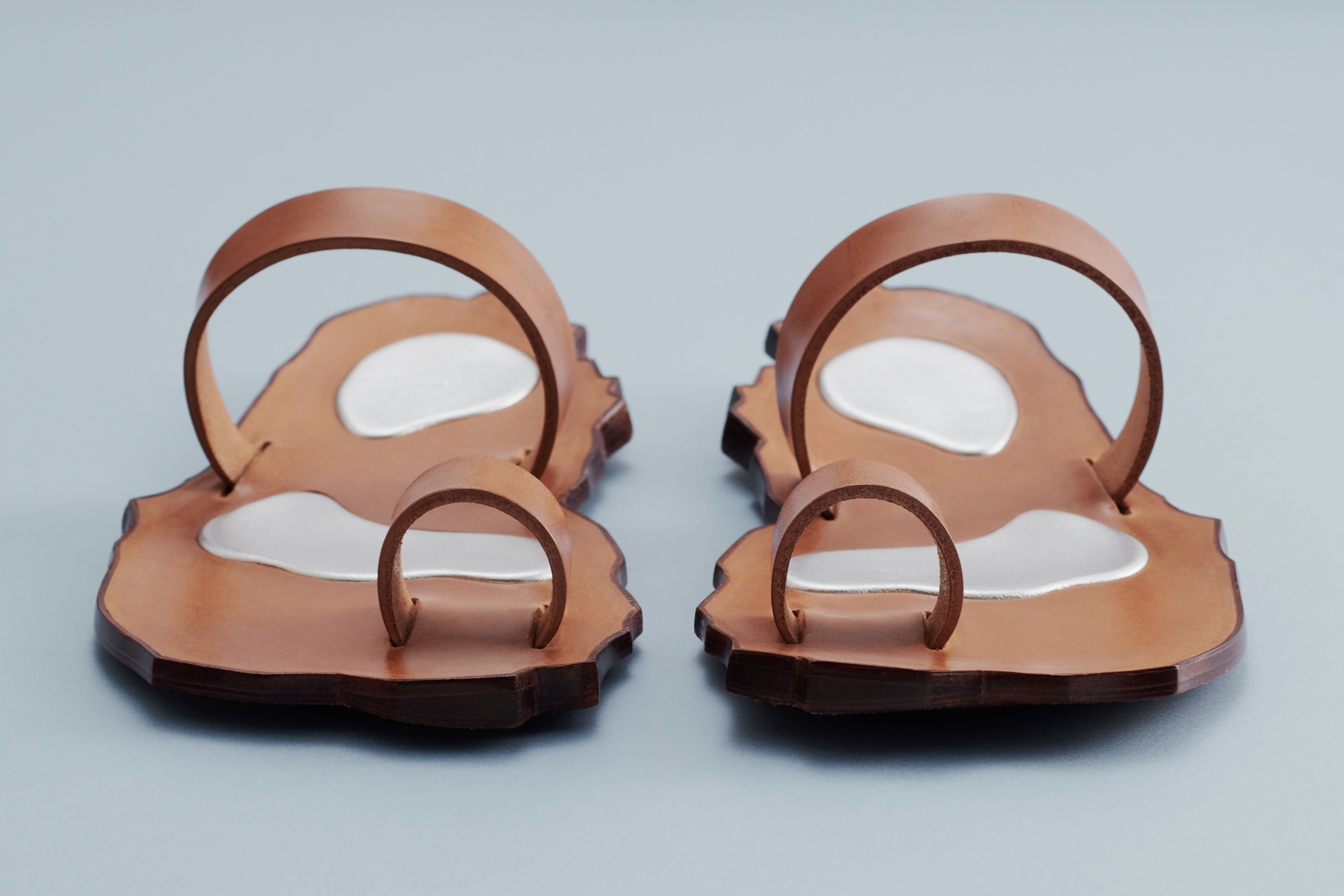 "Magritte's Stone" is a surrealistic sandal that floats in the air, a wearable work of art based on Rene Magritte’s "metaphysical painting" and Isamu Noguchi’s sculpture abstracts. The sole, with an intricate cross-section of rugged texture, contains silver foil leather ala Noguchi. Its shape distributes the anatomical plantar pressure of walking. It naturally produces a force that pulls downward, like the rippling sea at the bottom of Magritte's " The Castle of the Pyrenees," and accentuates the floating essence of the shoe as a whole.