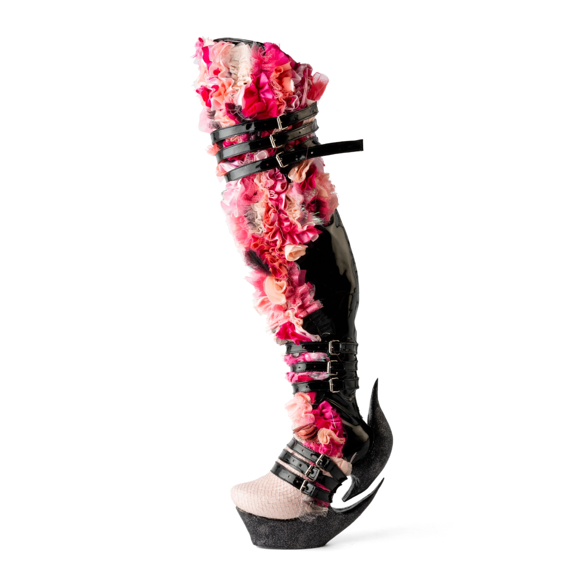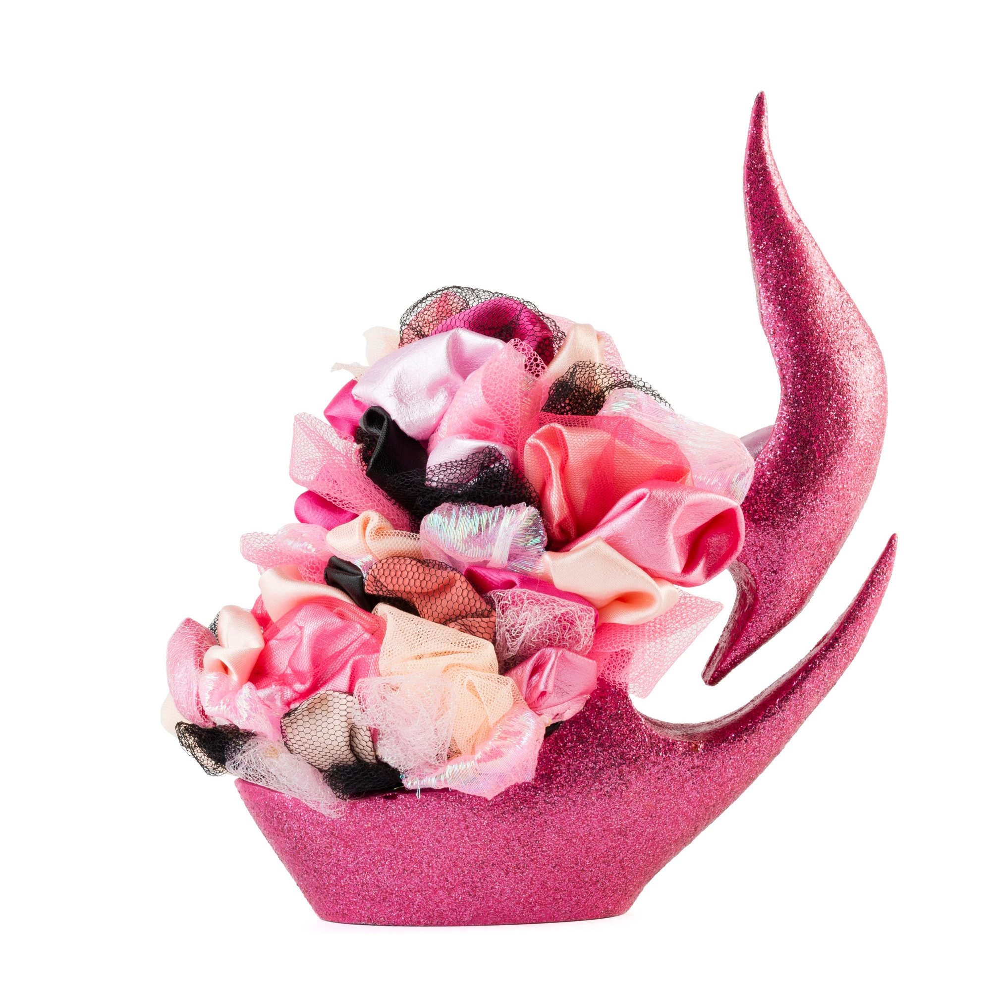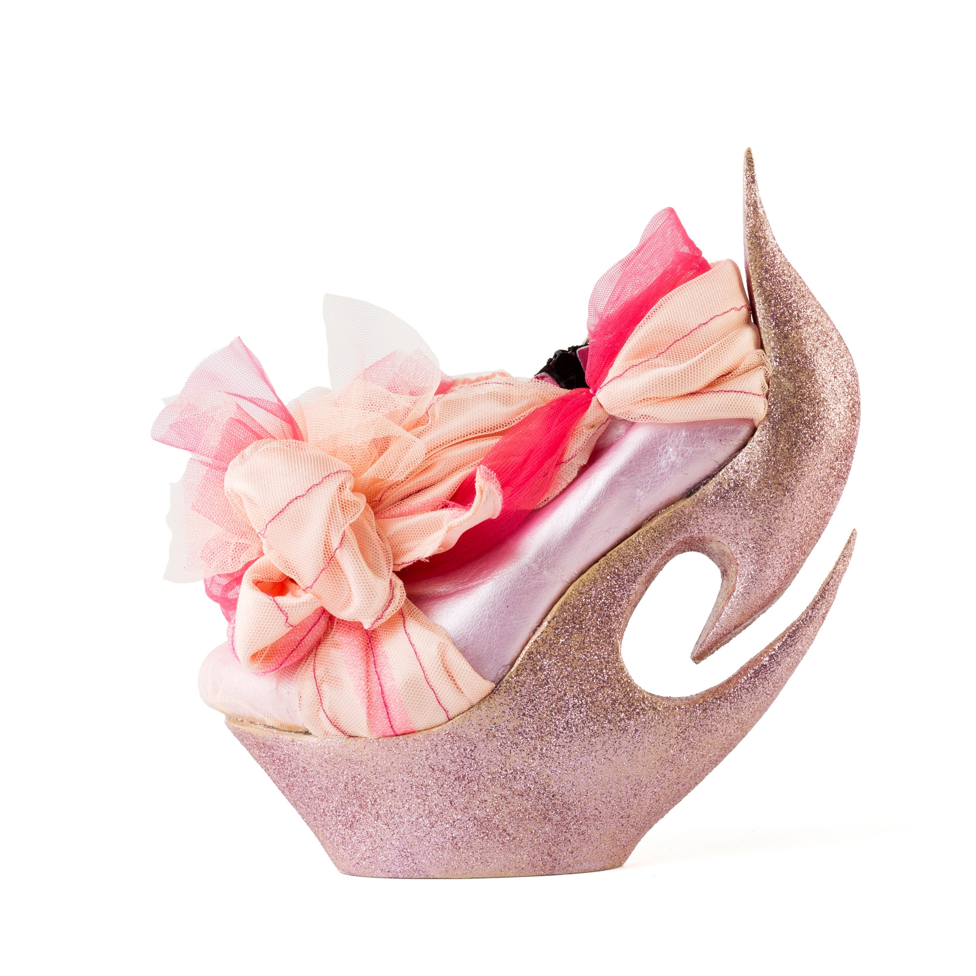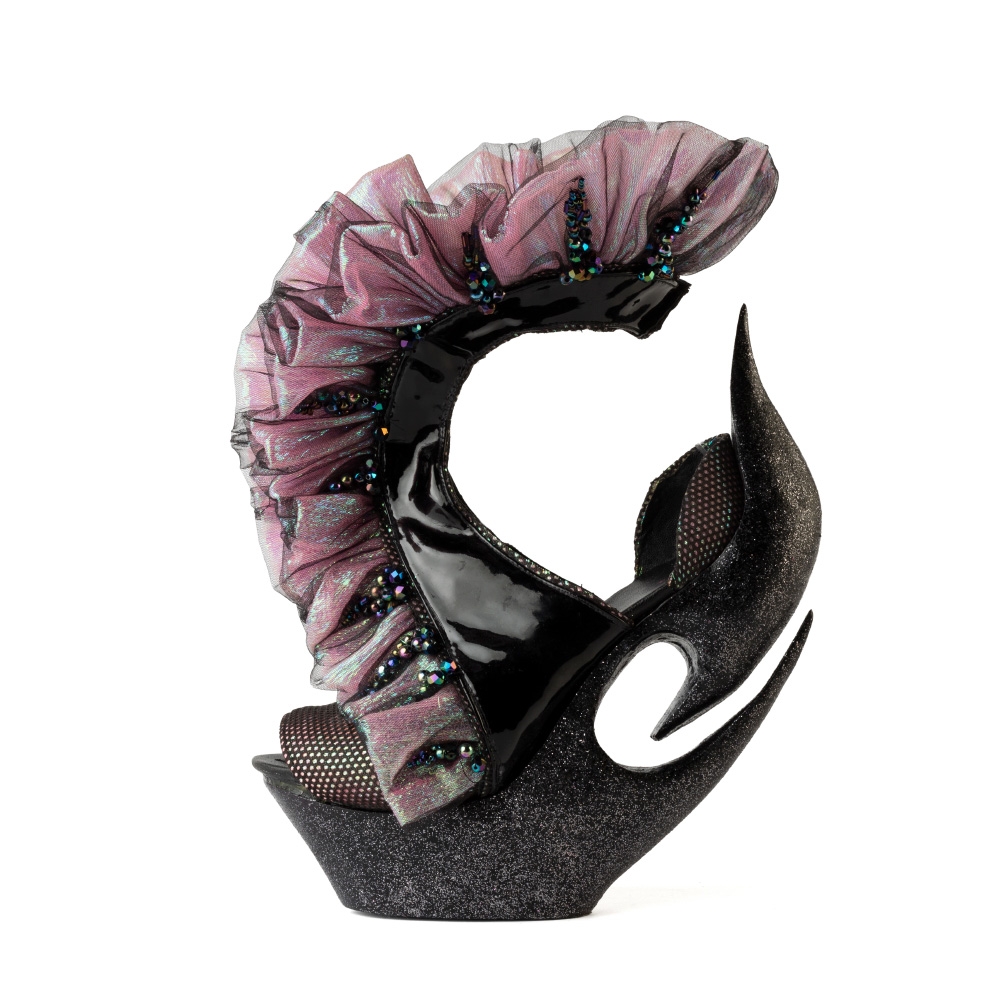 The SPLIT collection represents both sides within myself. Femininity combined with a dark edge. This is best seen in the heel which contains both hard edges and soft round curves. The epoxy heel is entirely made by hand from sanded plaster before poured into a mold. The upper materials are a mixture between soft tule, leather, pearls and beads.