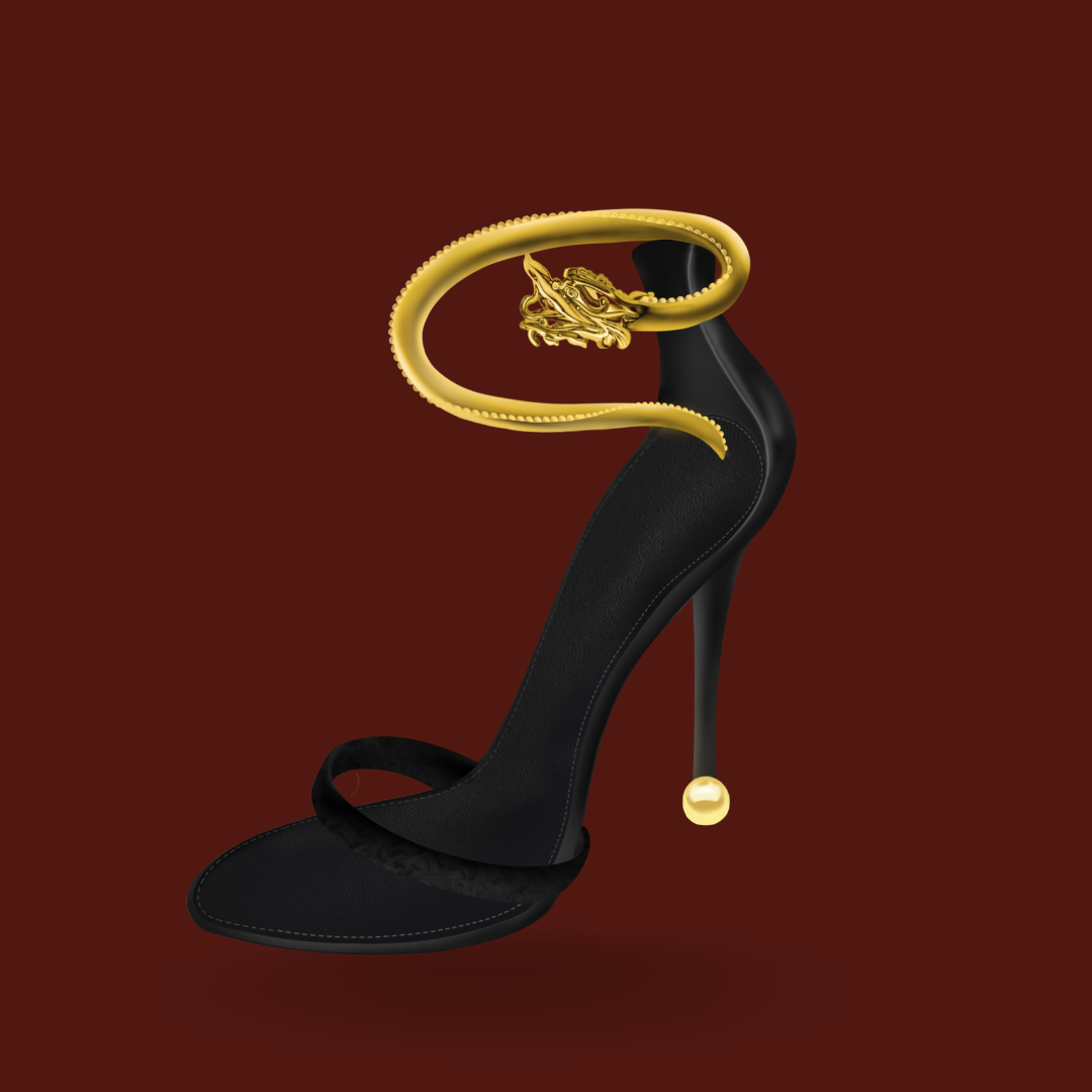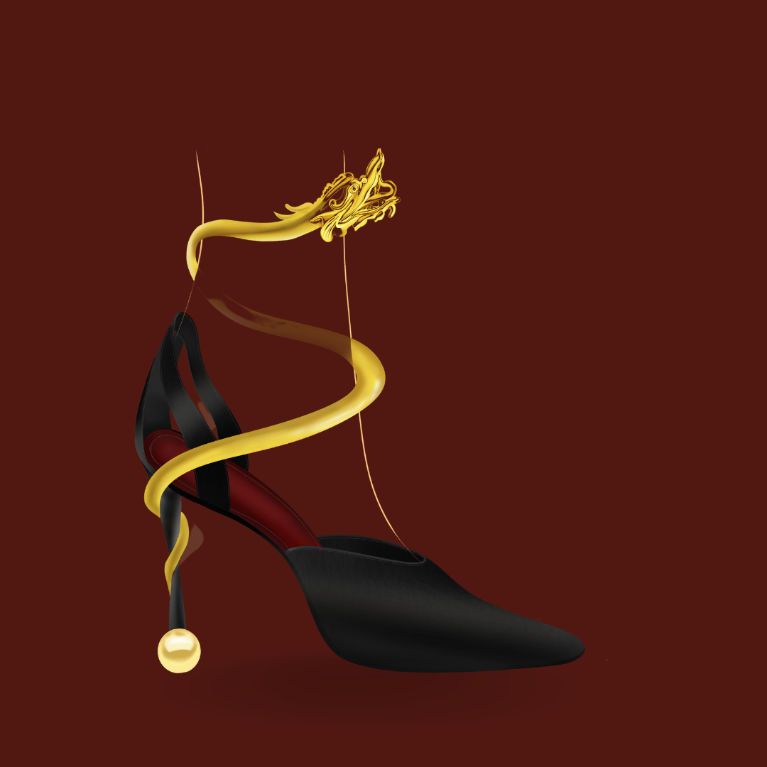 The inspiration comes from the planetary diagram "Double Dragon Playing with Pearls" in Chinese astronomy. The fireballs evolved from the moon, implying the pursuit of a better life. Since the Han Dynasty, double dragons playing with beads have become an auspicious and festive decorative pattern. The whole set of designs is mainly composed of a dragon body and round beads, which are displayed in three different forms. They are all women's shoes, intended to combine the dragon's body soaring through the clouds and flying in the fog with the lines of women's bodies.