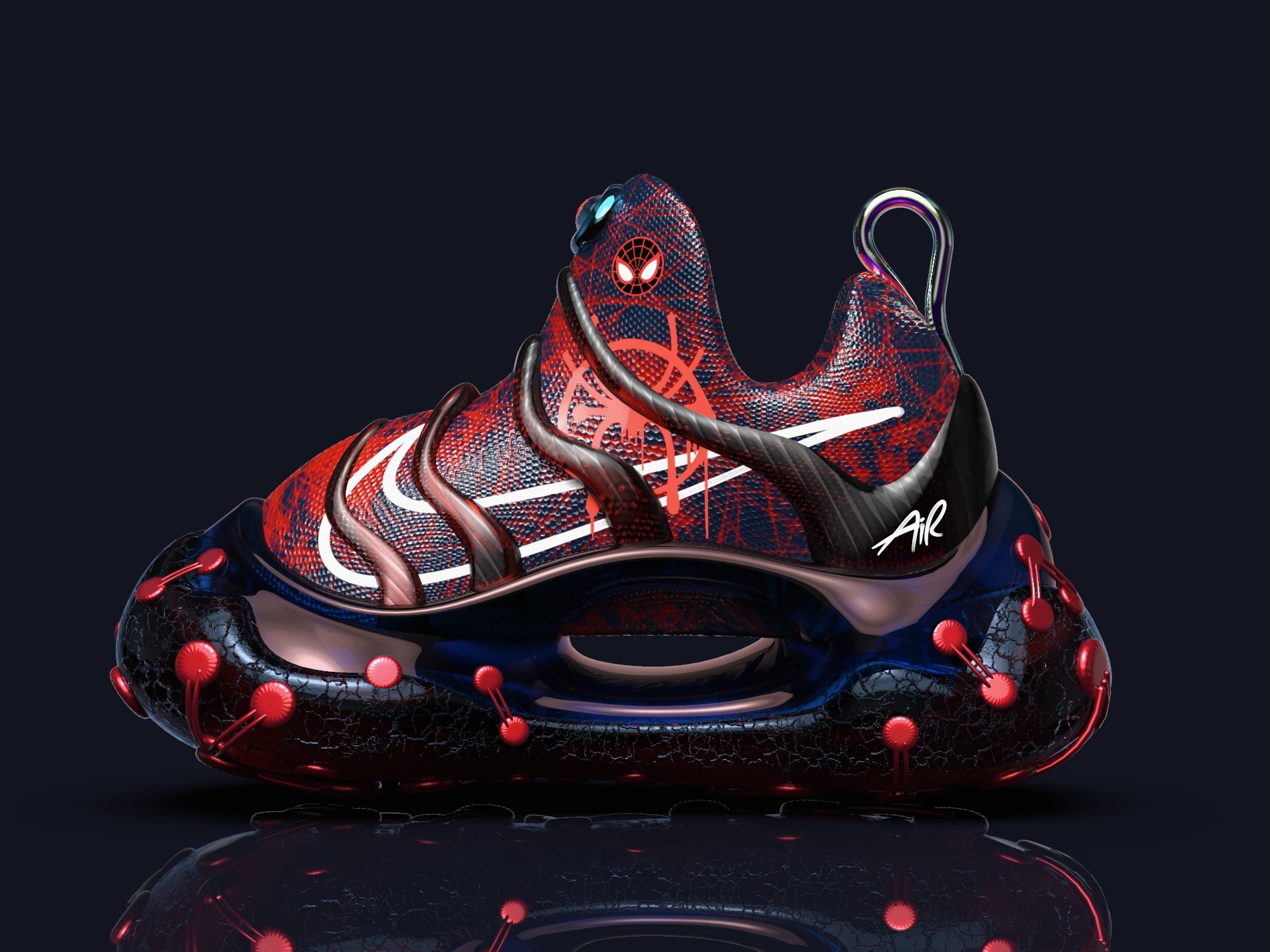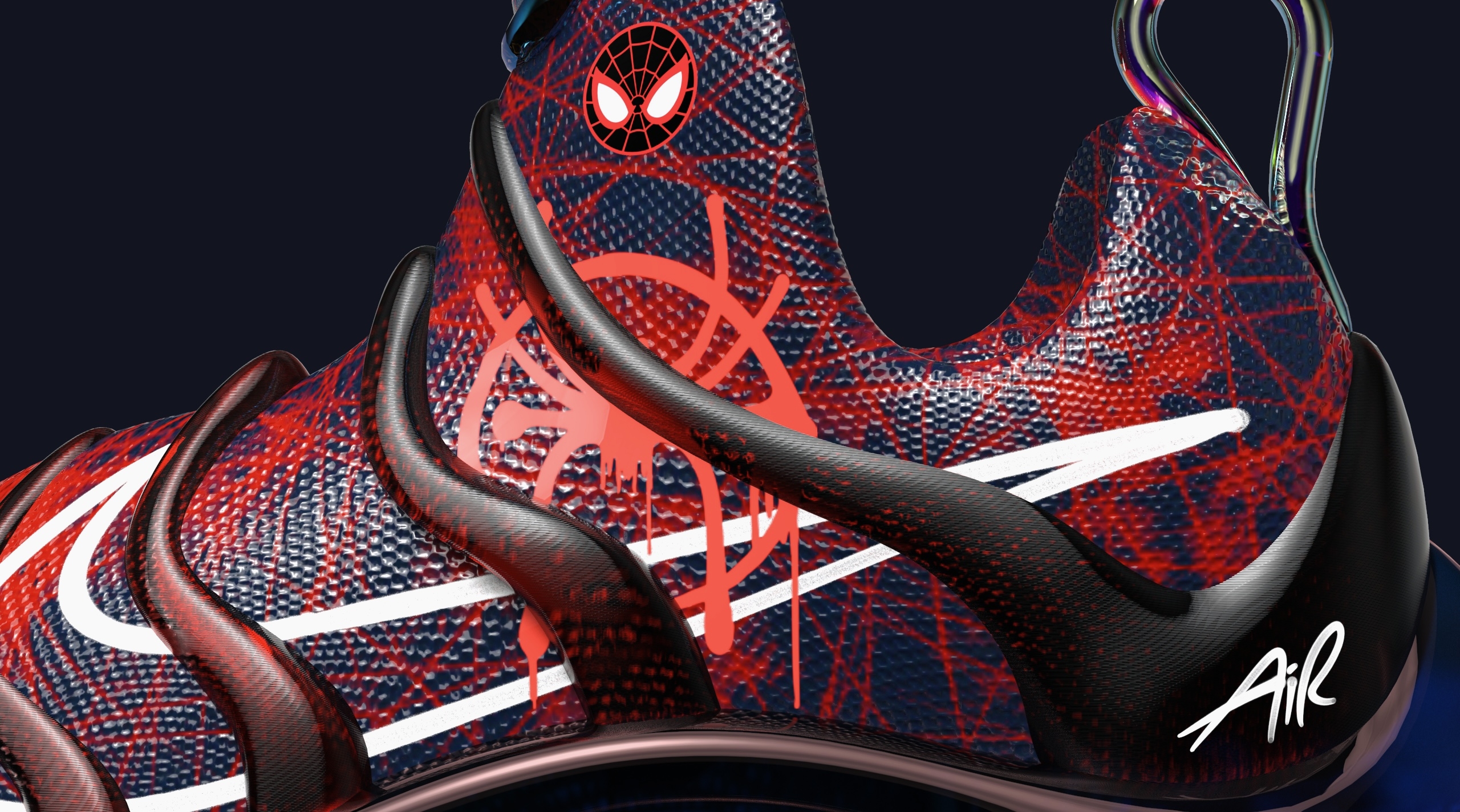 The inspiration is from design languages of NIKE IPSA and NIKE DYNAMO FREE. And creating a collaboration with spider man. Try to use interesting textures, graphics, and details to enhance the theme and attract more kids.