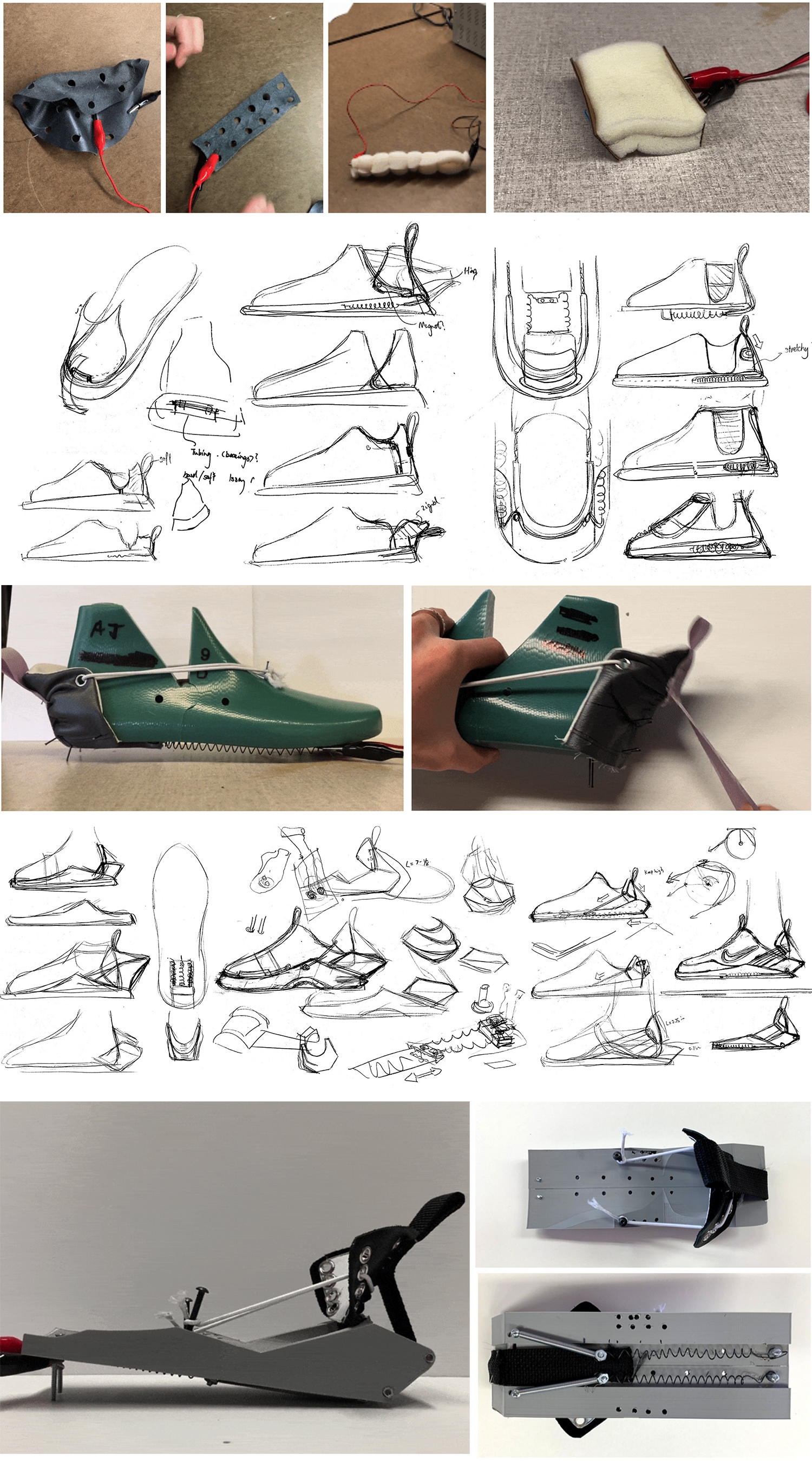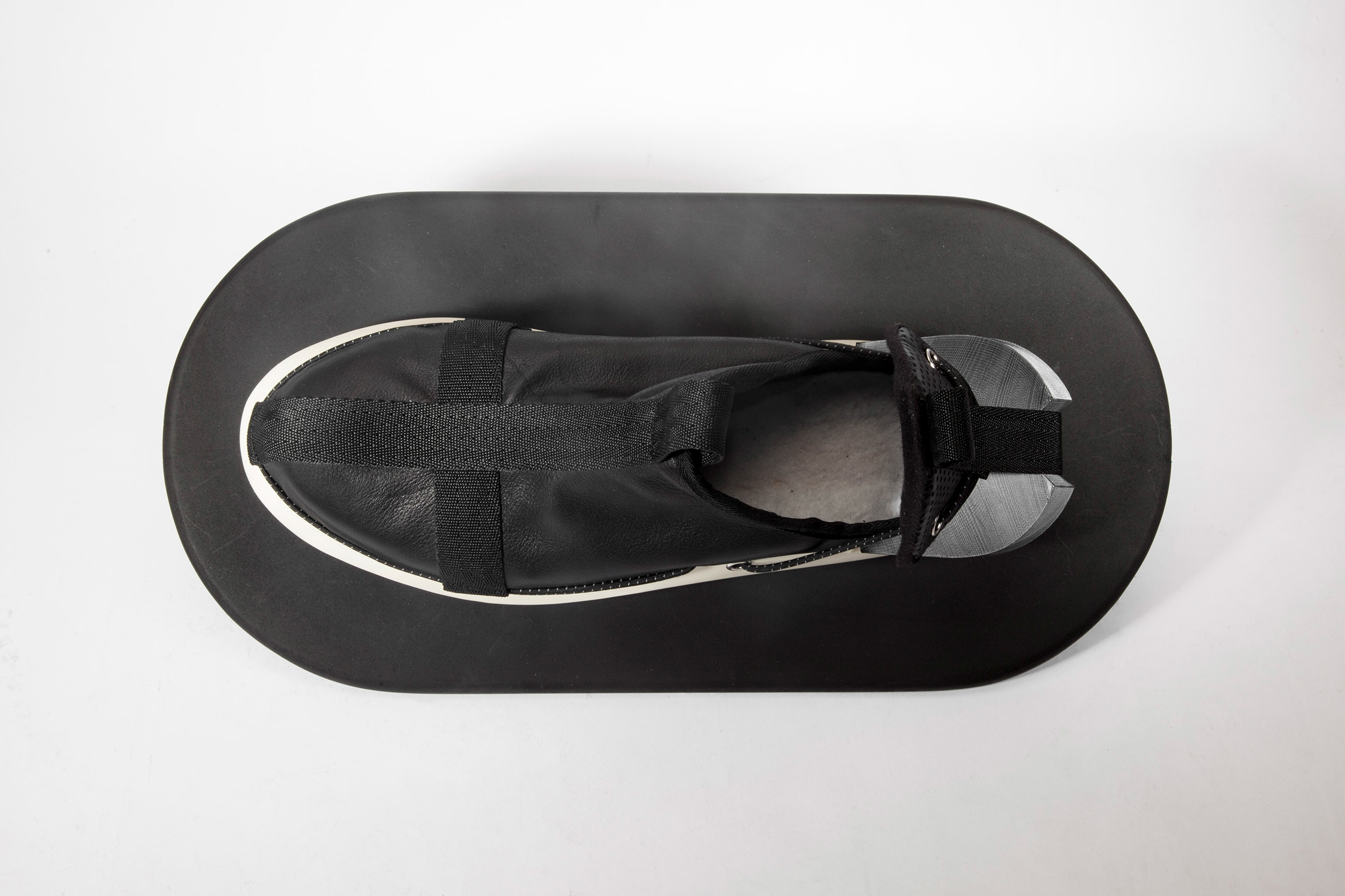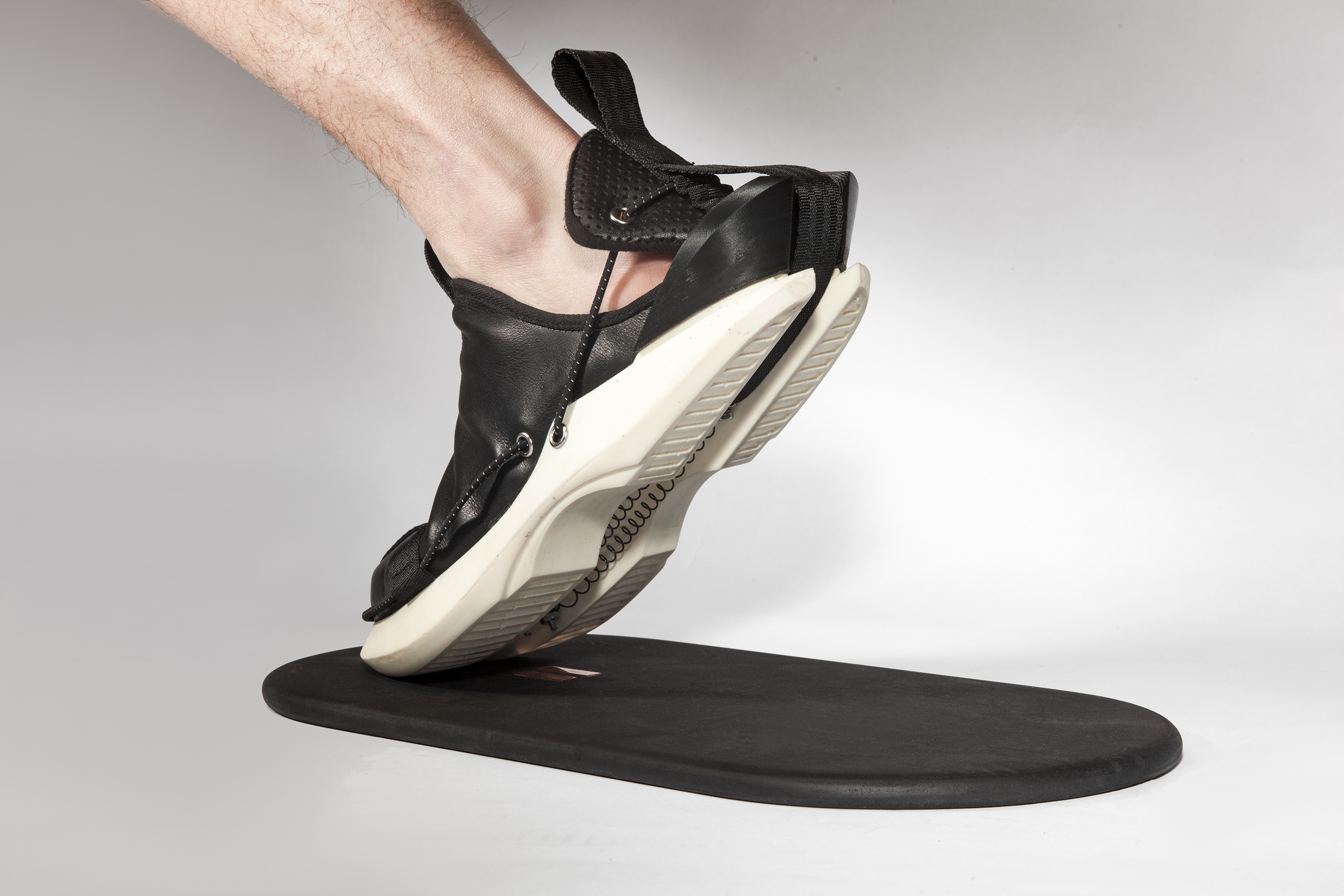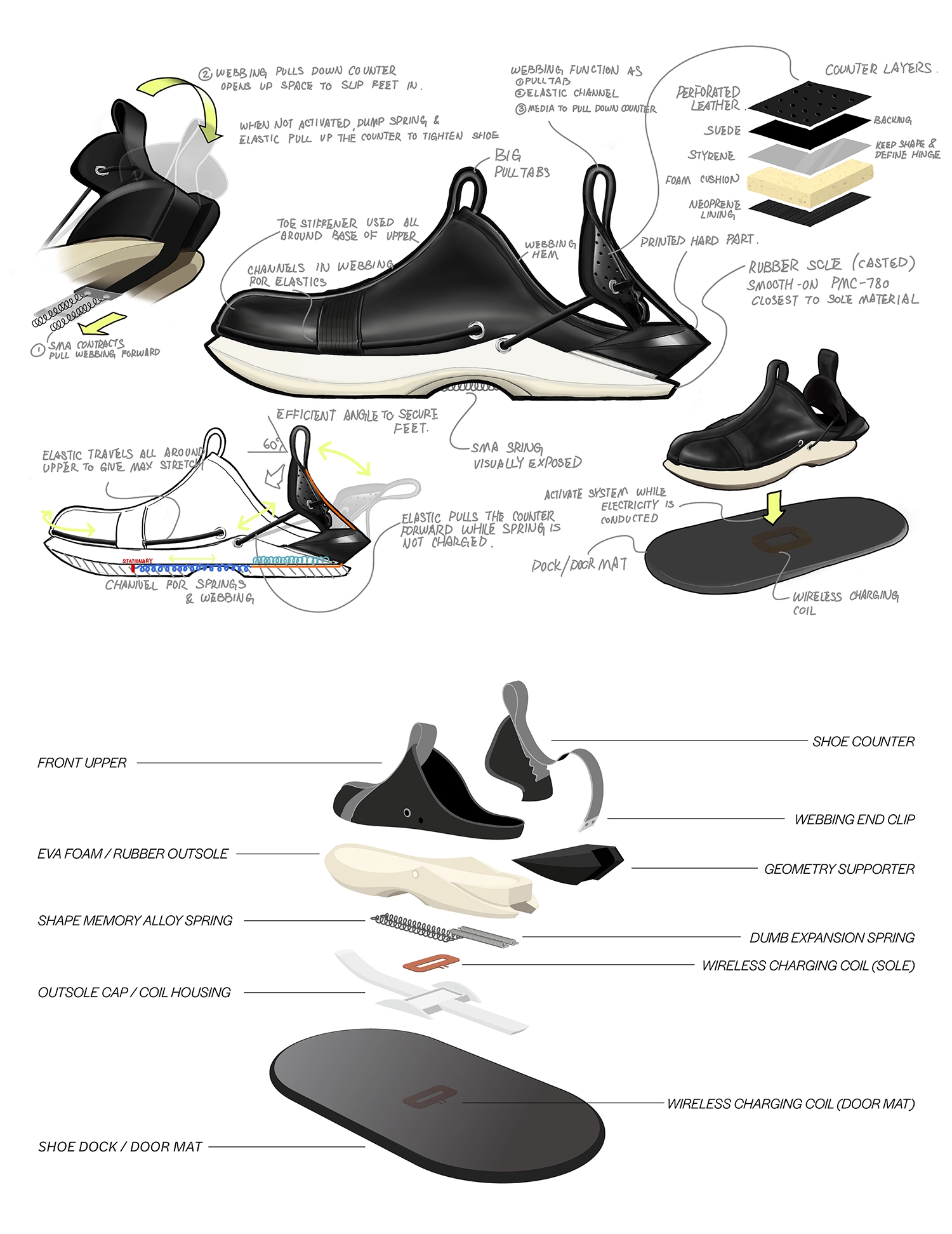 A charging mat activates DOOR, pulling down the heel counter with heated SMA springs to ensure ease of foot entry and exit, whereas stepping out of the mat cools down the SMA springs to allow counterforce to perform closure.