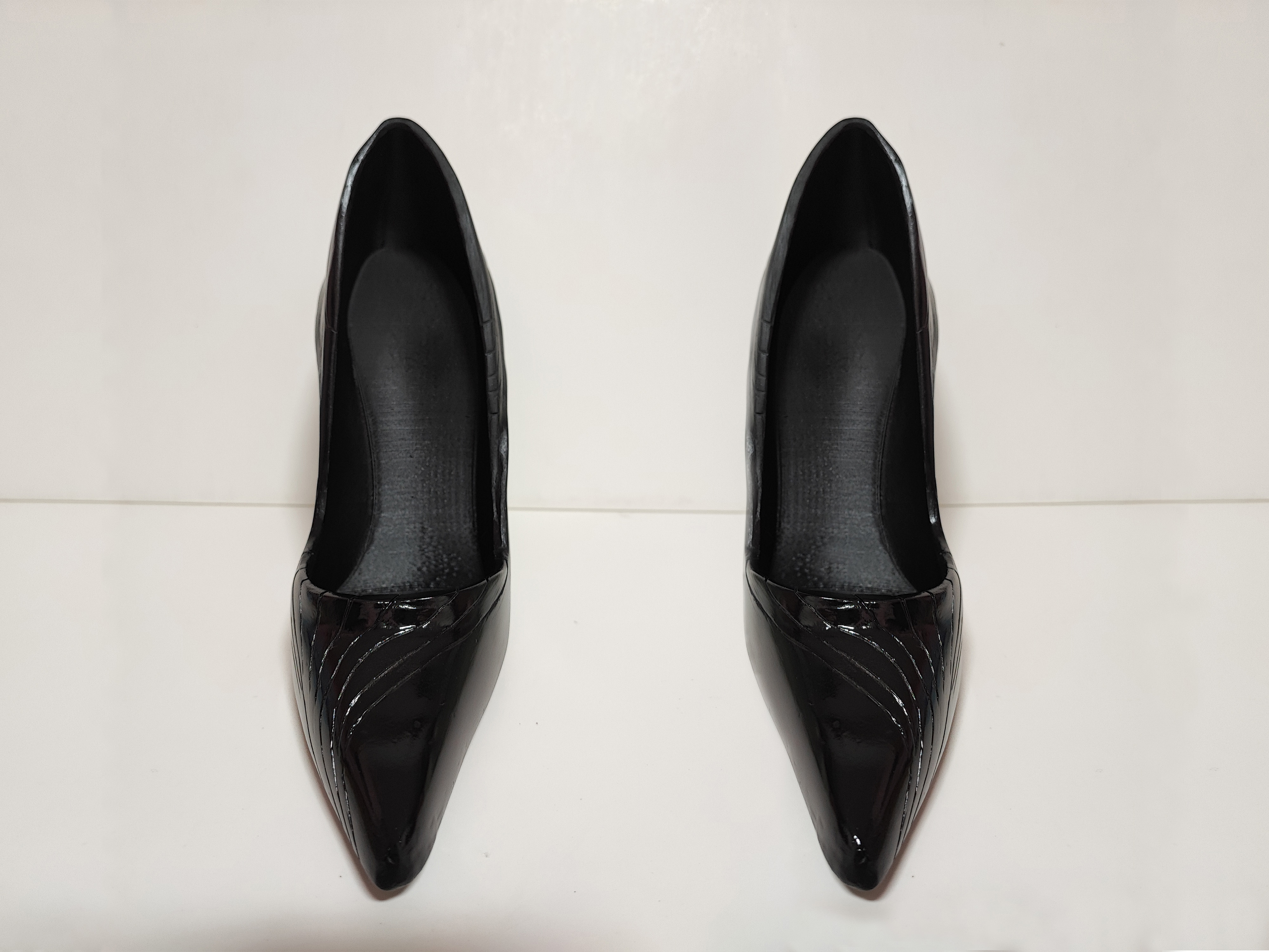 Its has two finishes combined, the matt black leather is on the outer and the gloss black is on the inner. The high heels shoe evokes a black volcanic metaphysic sense on the Shell.