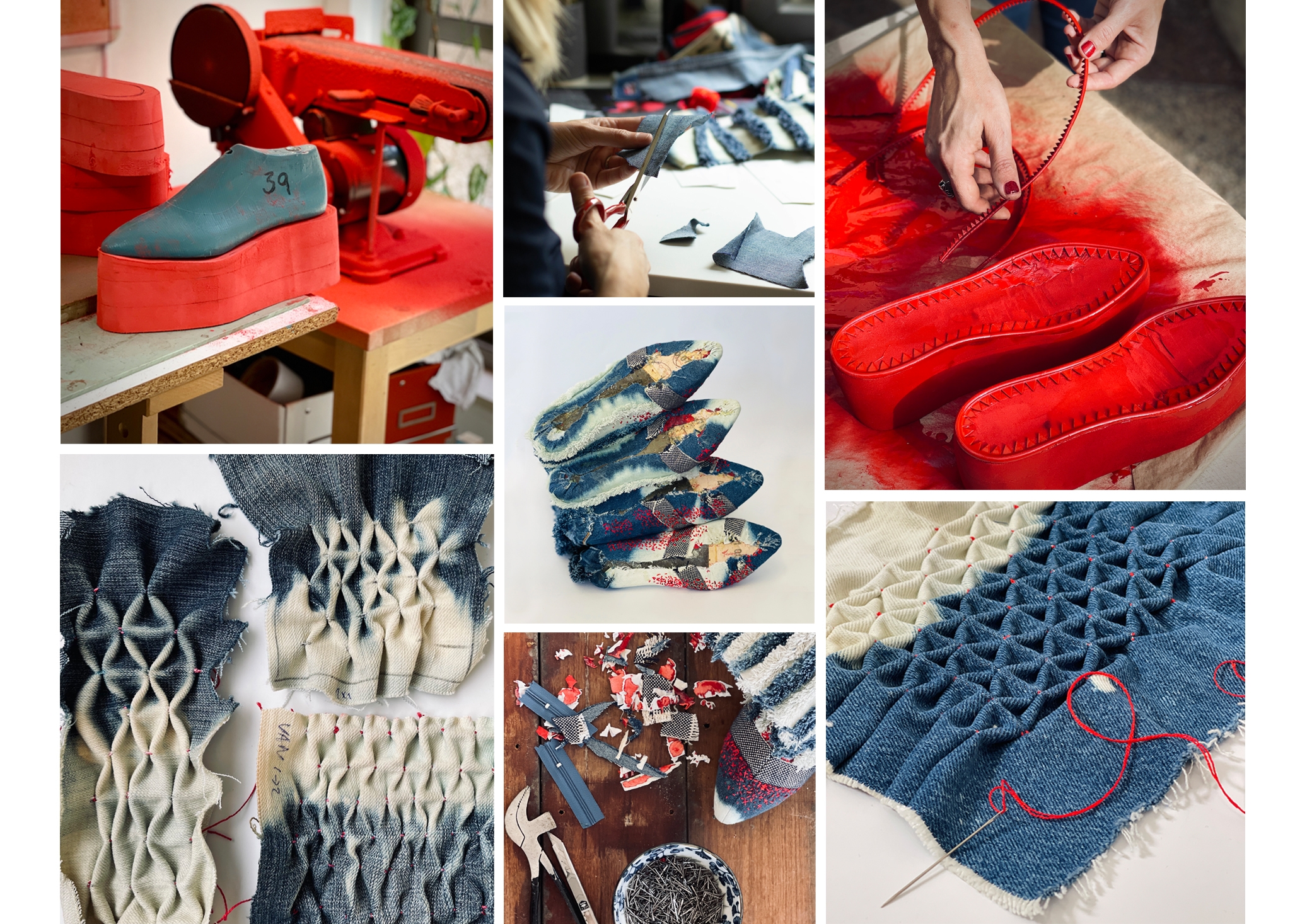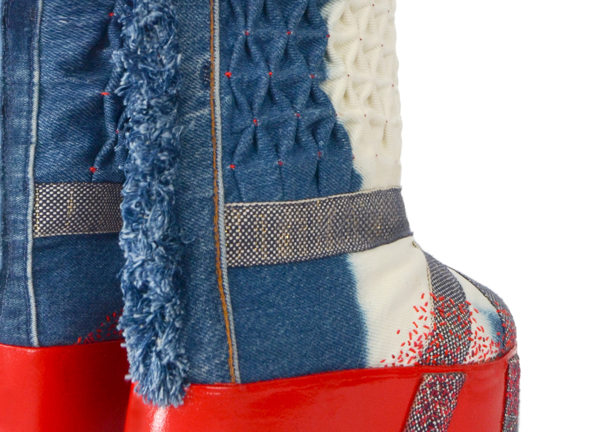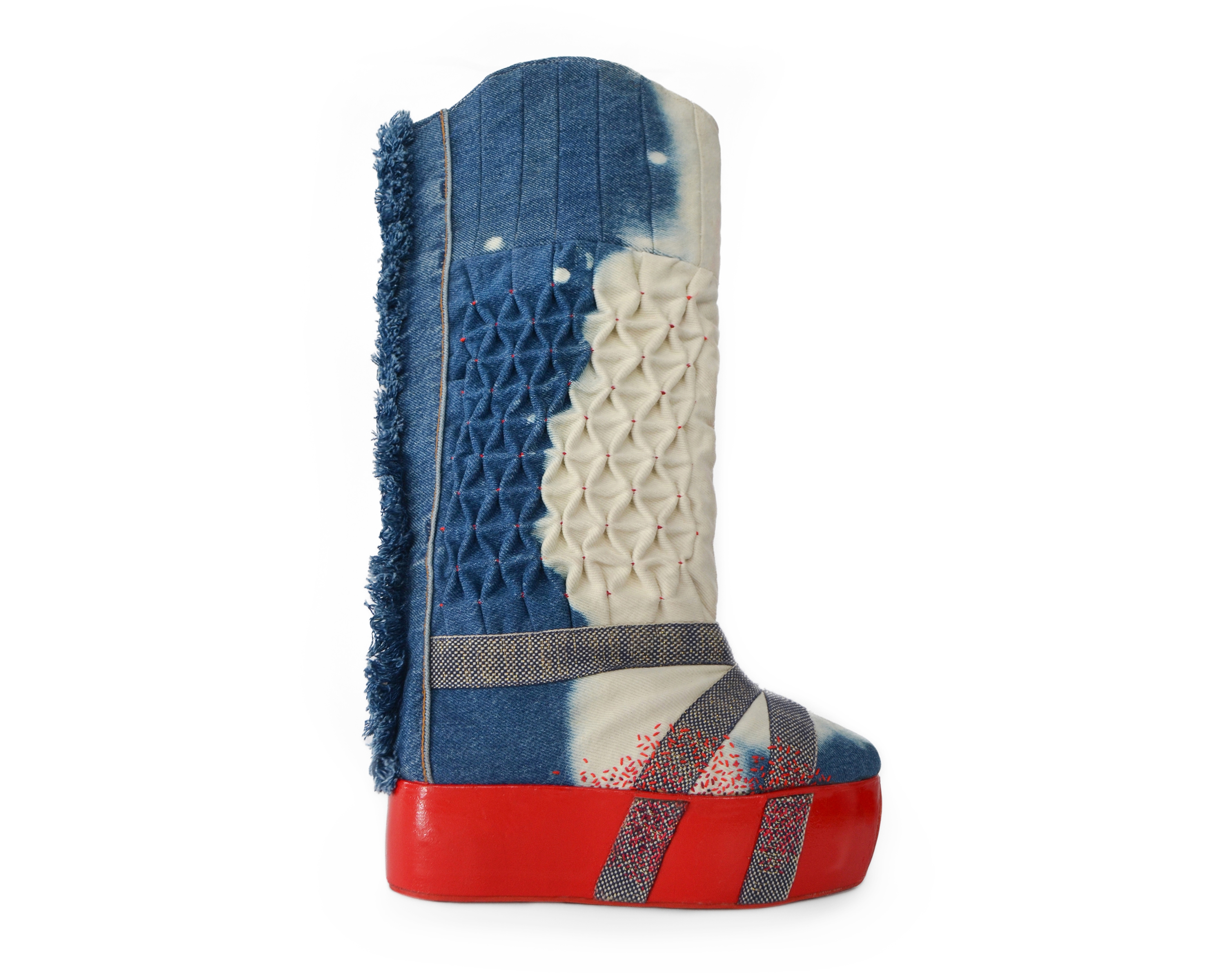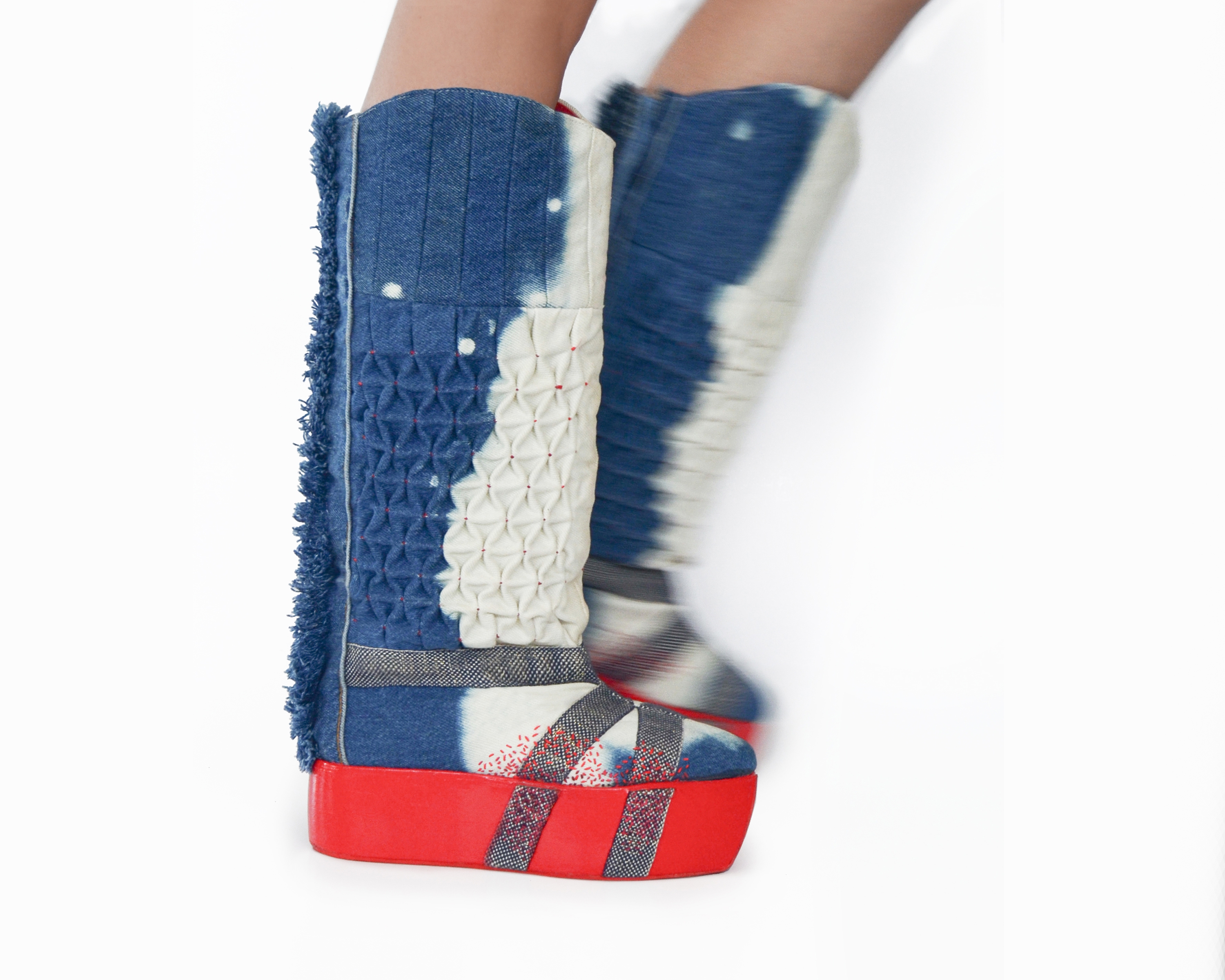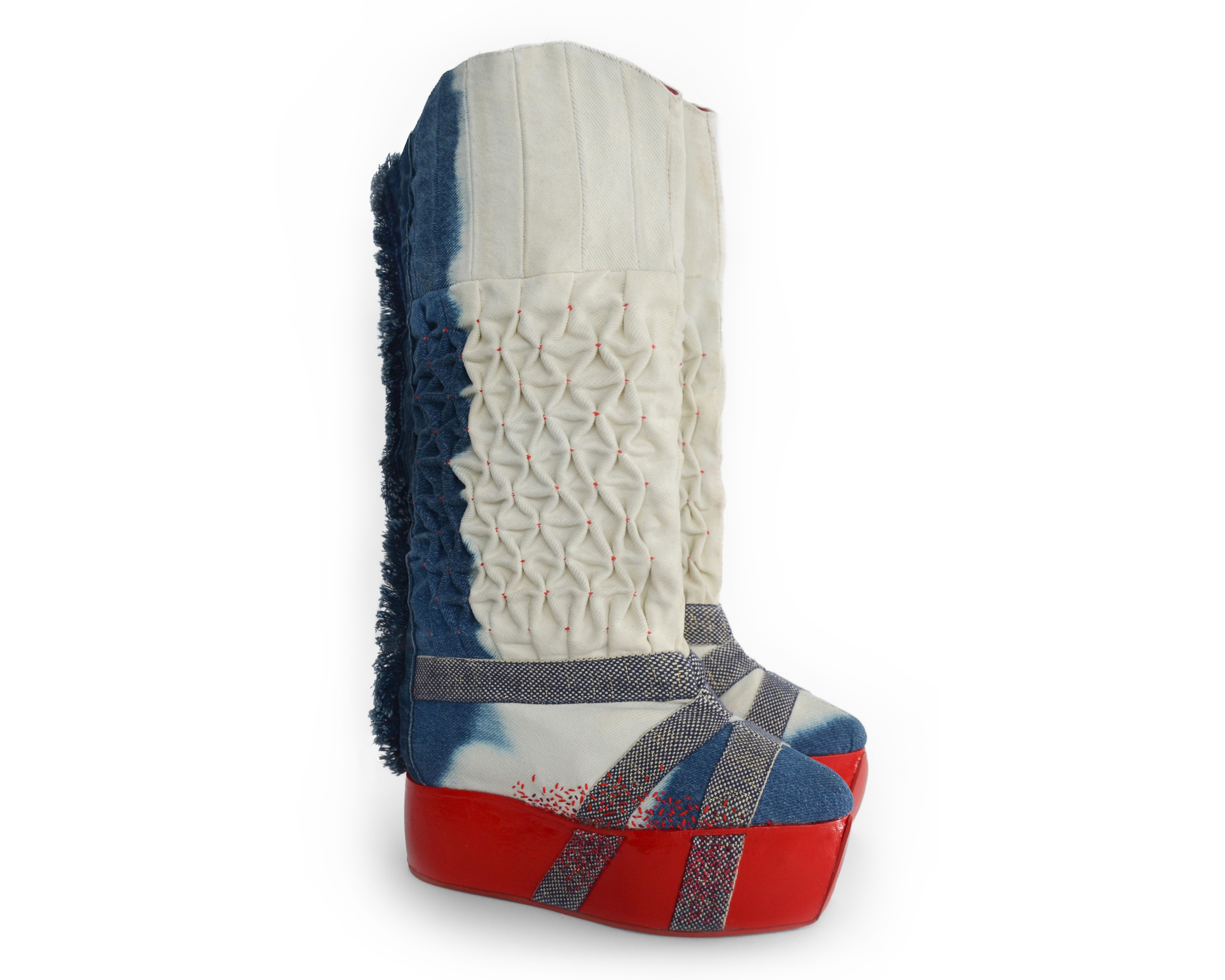 These boots, made from repurposed jeans, are an inquiry into the tug of war between the United States and the People’s Republic of China. Two giants dividing the world and meddling in each others affairs.