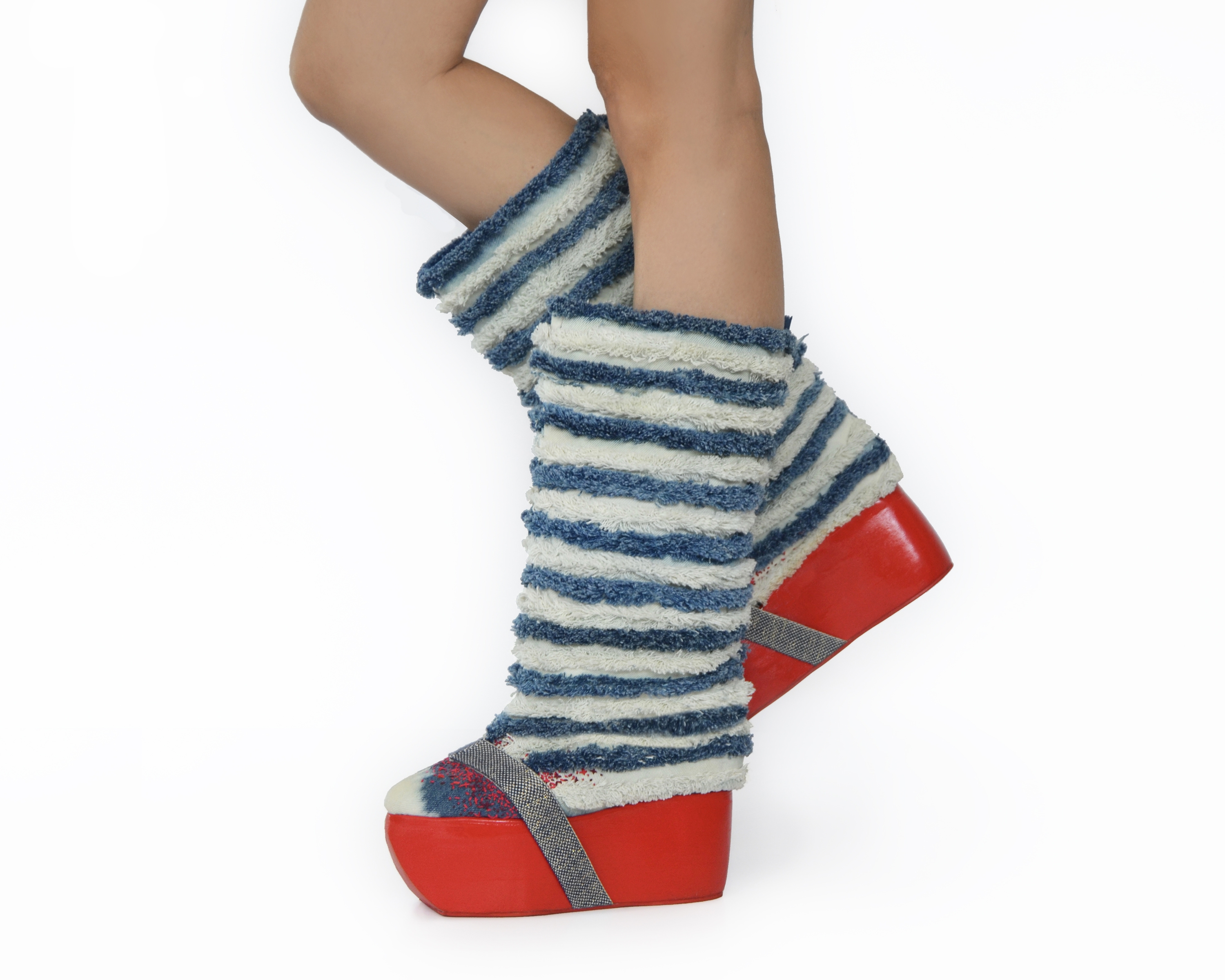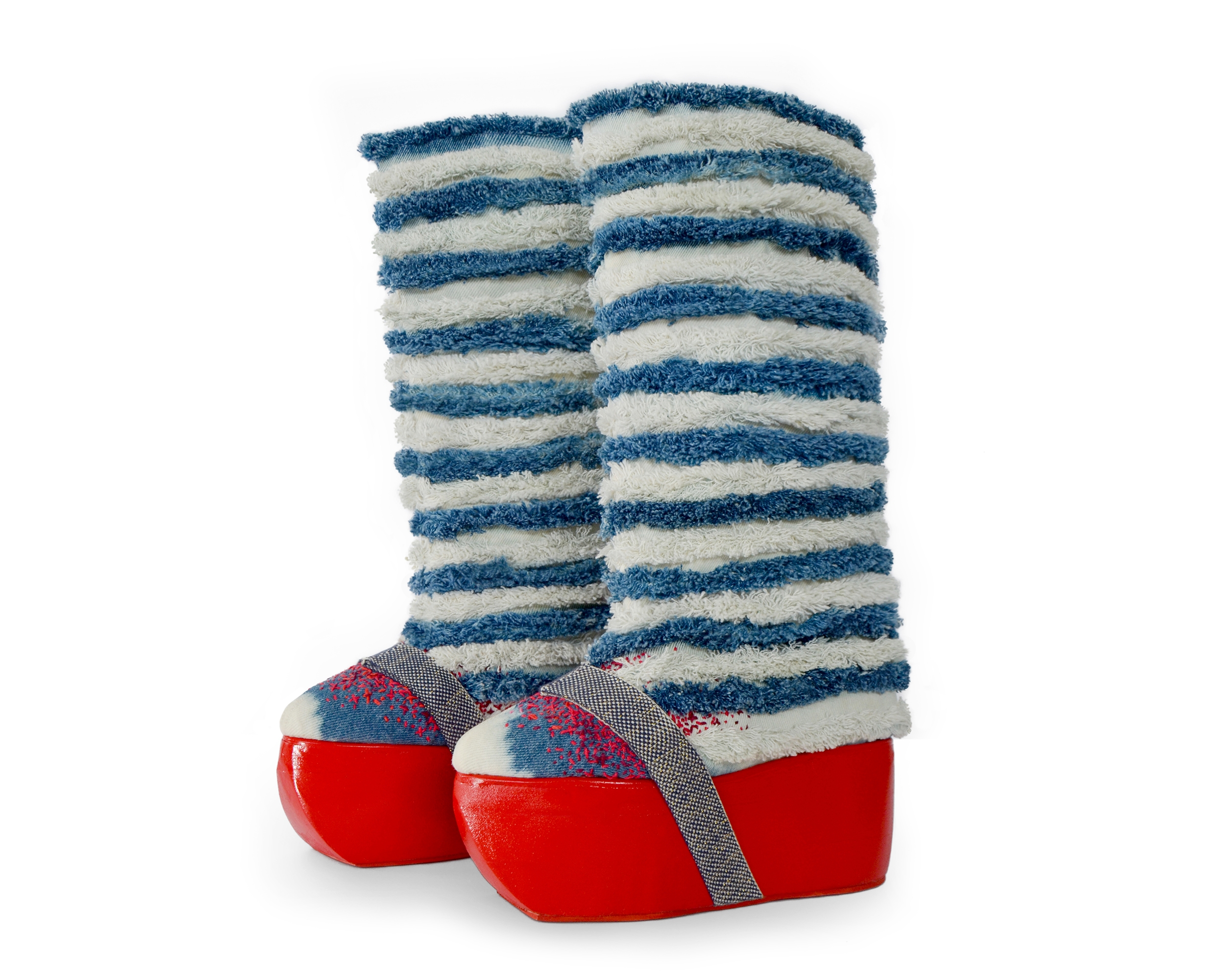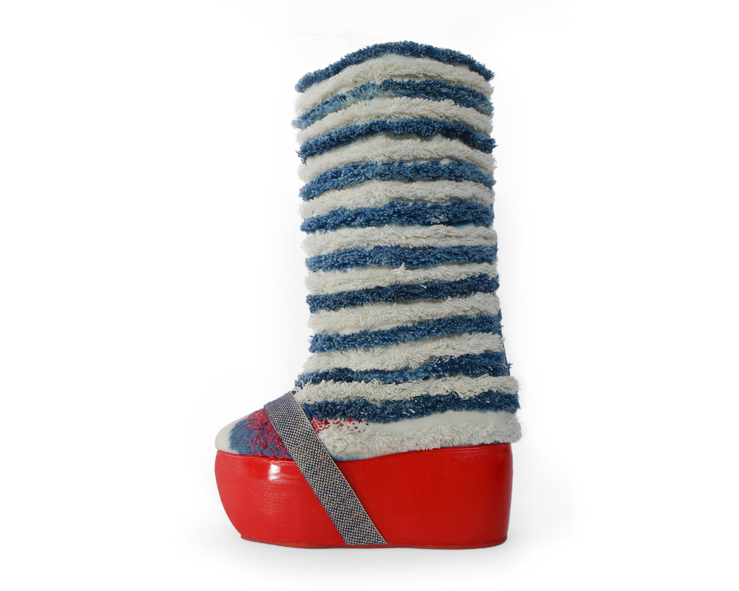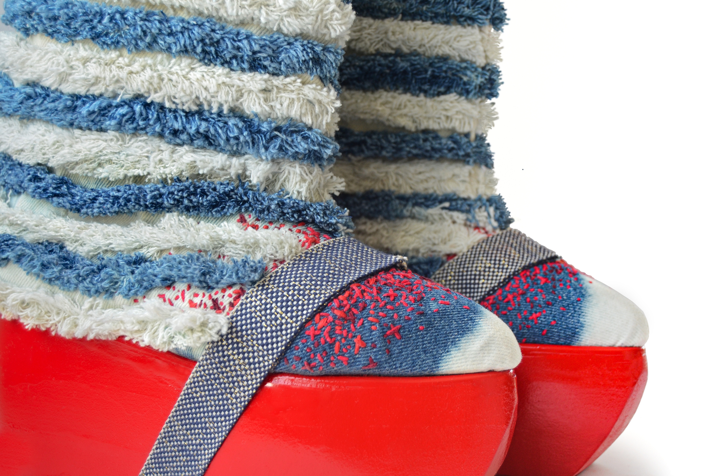 These boots, made from repurposed jeans, are an inquiry into the tug of war between the United States and the People’s Republic of China. Two giants dividing the world and meddling in each others affairs.