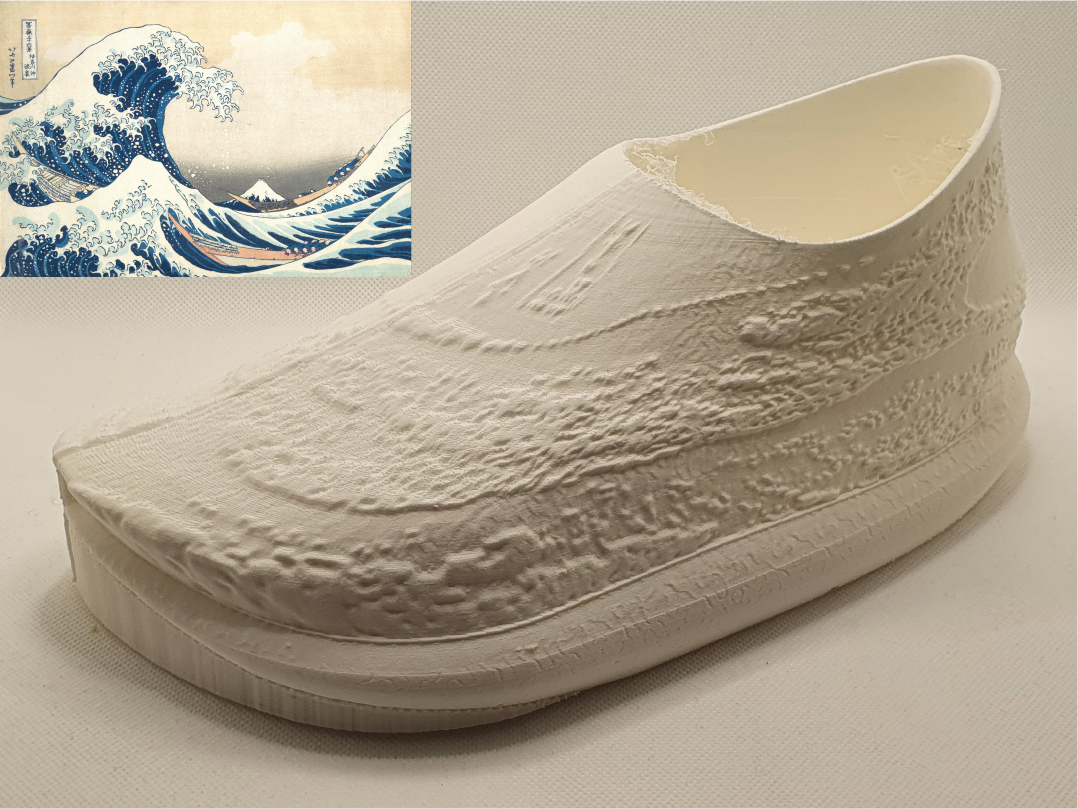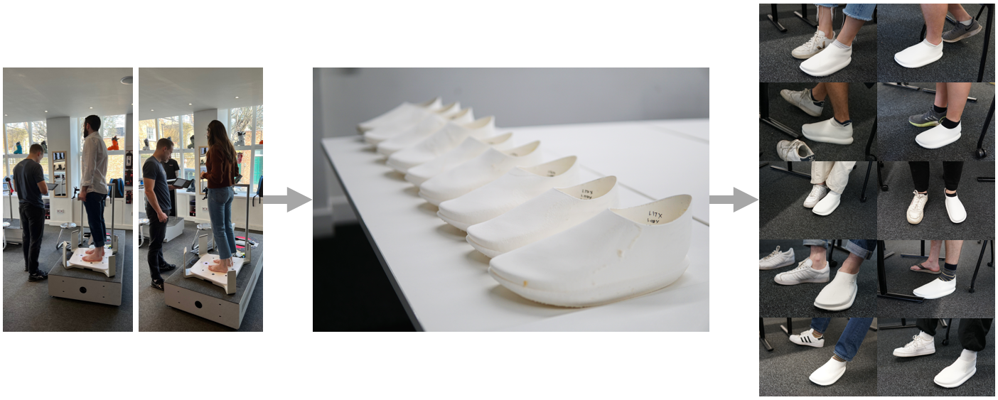 User’s 3D scan their feet using a dedicated scanner or smartphone. This scan is uploaded into the generation algorithm which automatically produces a personalised shoe in 6 seconds. This is 3D printed in foaming TPU, enabling variable density in a single material and potential for closed loop recycling. Tested with 76 scans and 10 users. Aesthetics can be personalised by uploading any 2D image as a surface texture, democratising the design process.
