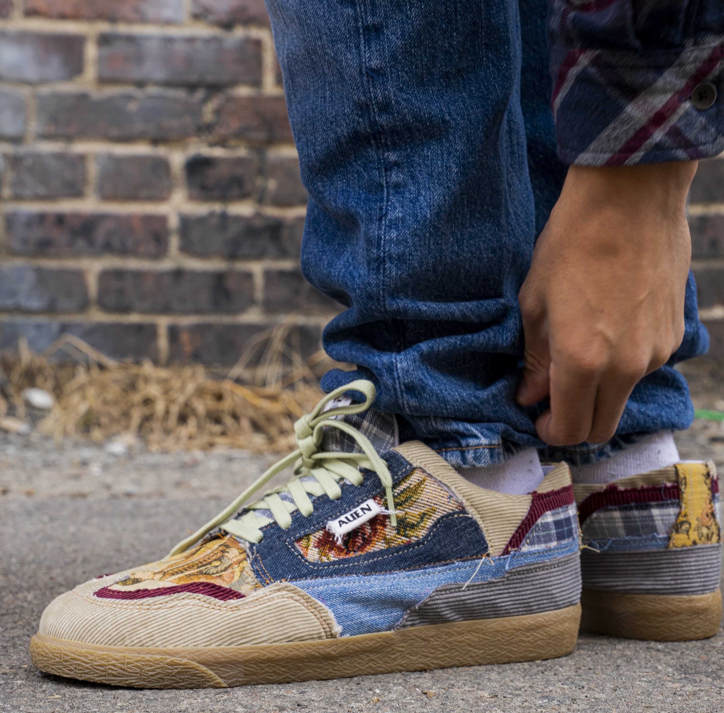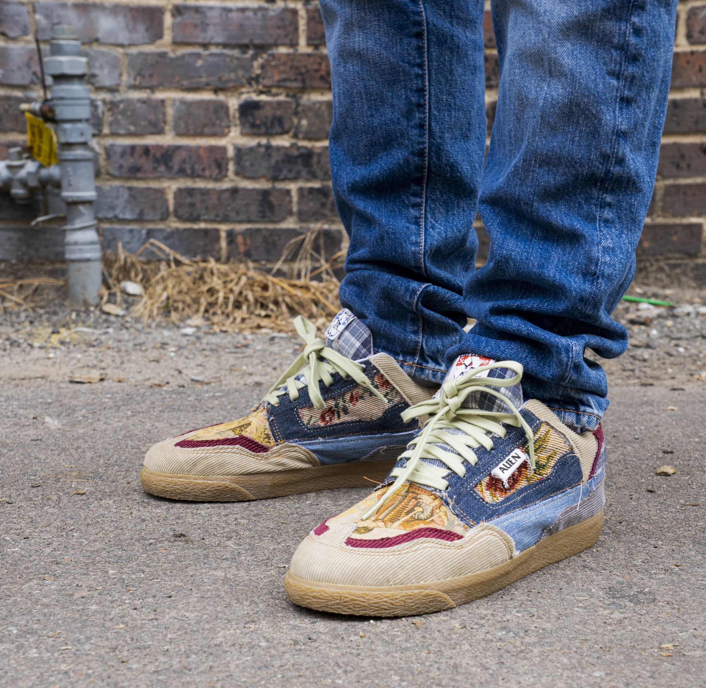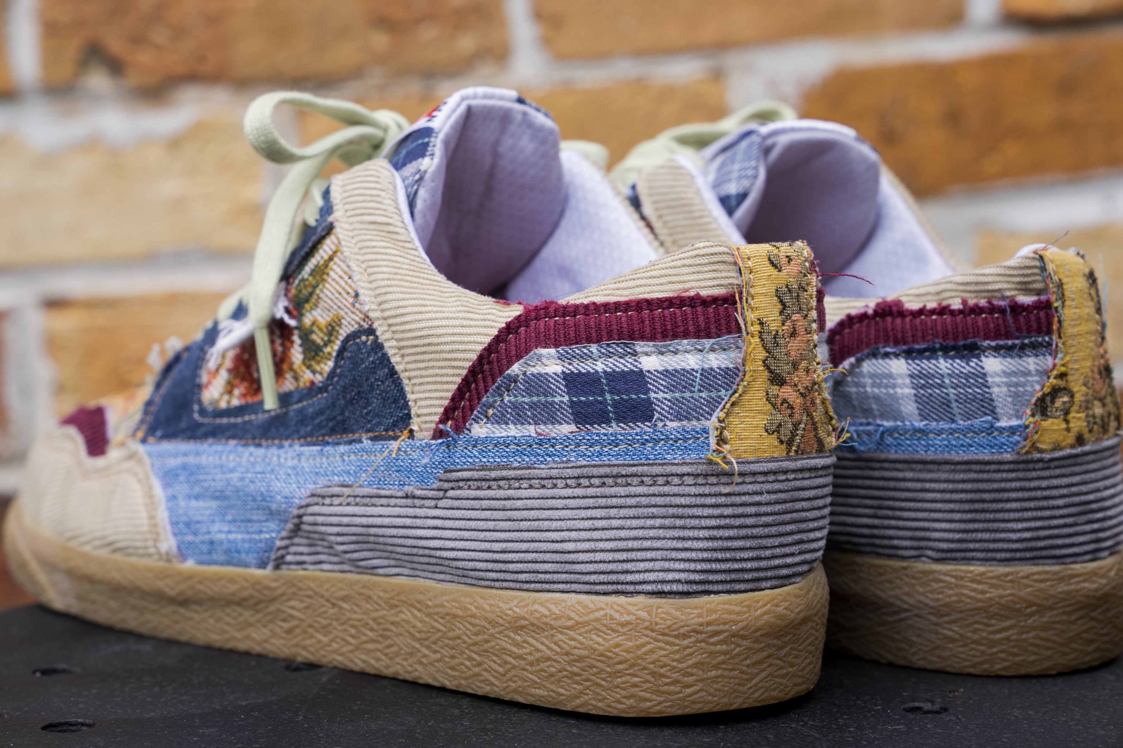 This shoe is a small step in the right direction of sustainability. The uppers are made up of materials I dug out at the Goodwill Bins. My goal while constructing the standard 79 was to take unsought-after items from goodwill and turn them into something beautiful.