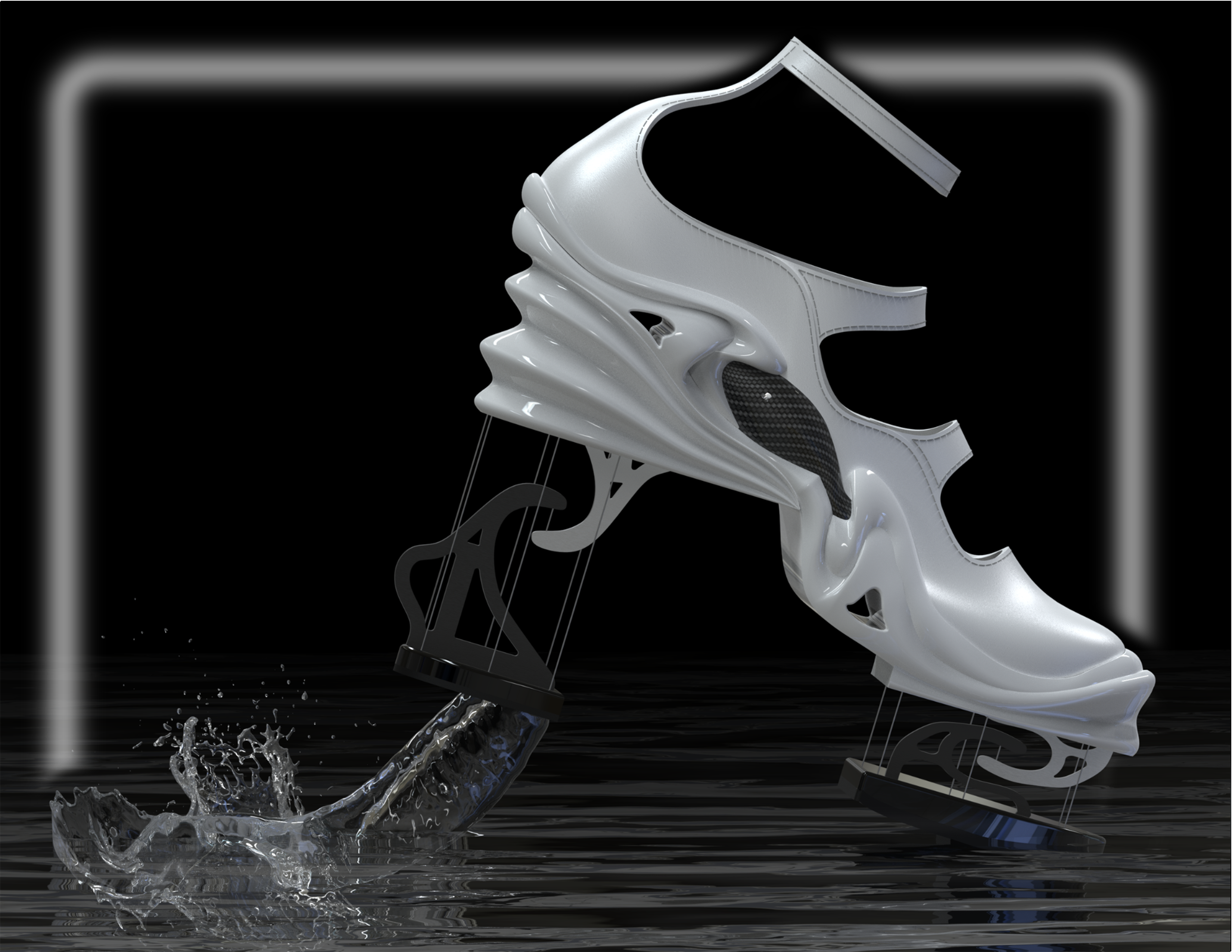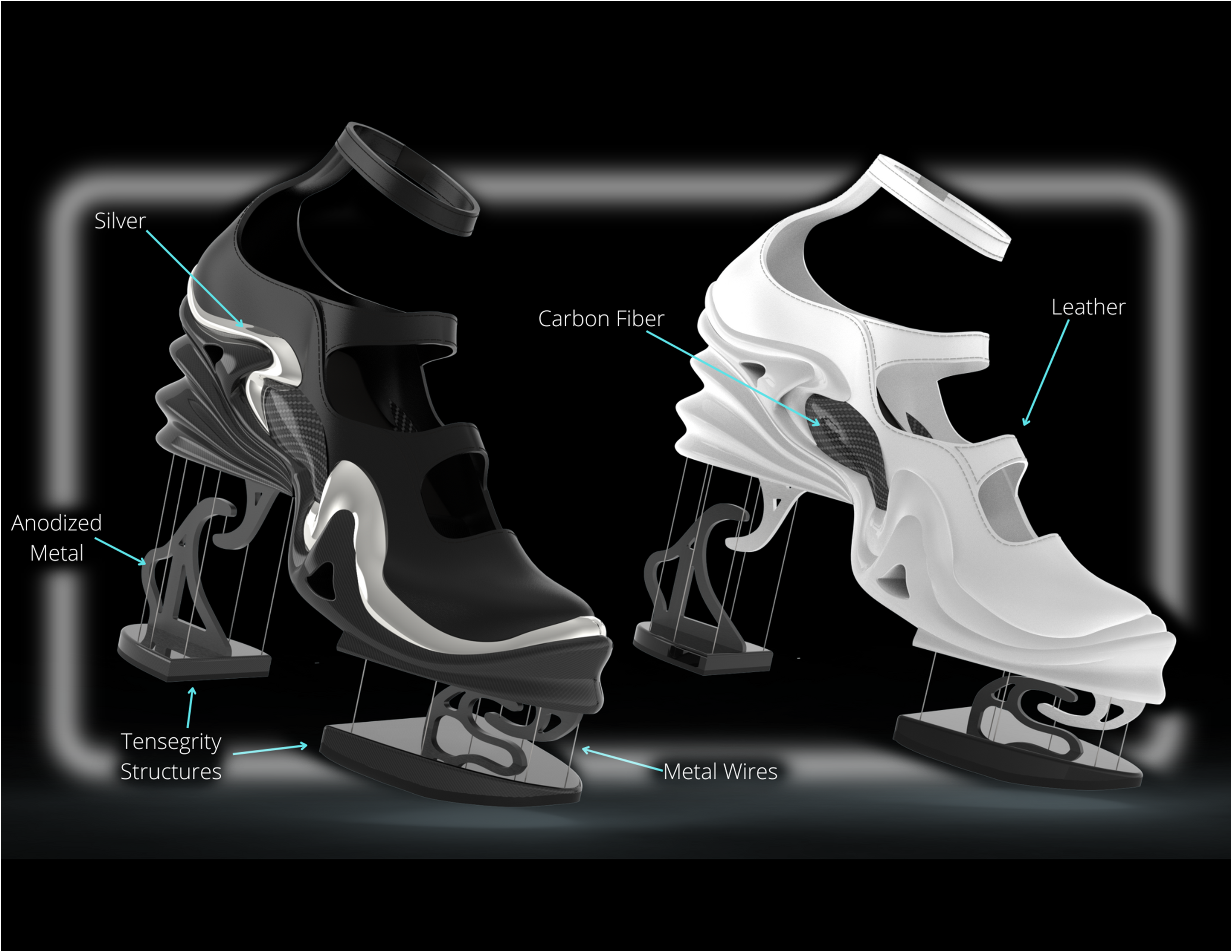 The Tensegrity Strider uses tensegrity structures to suspend the wearers foot to give off the illusion that it is floating above the ground. The shoe allows the wearer to float atop puddles by using the thin wire support system, much like a water strider uses their thin long legs to help them run atop the surface of the water.