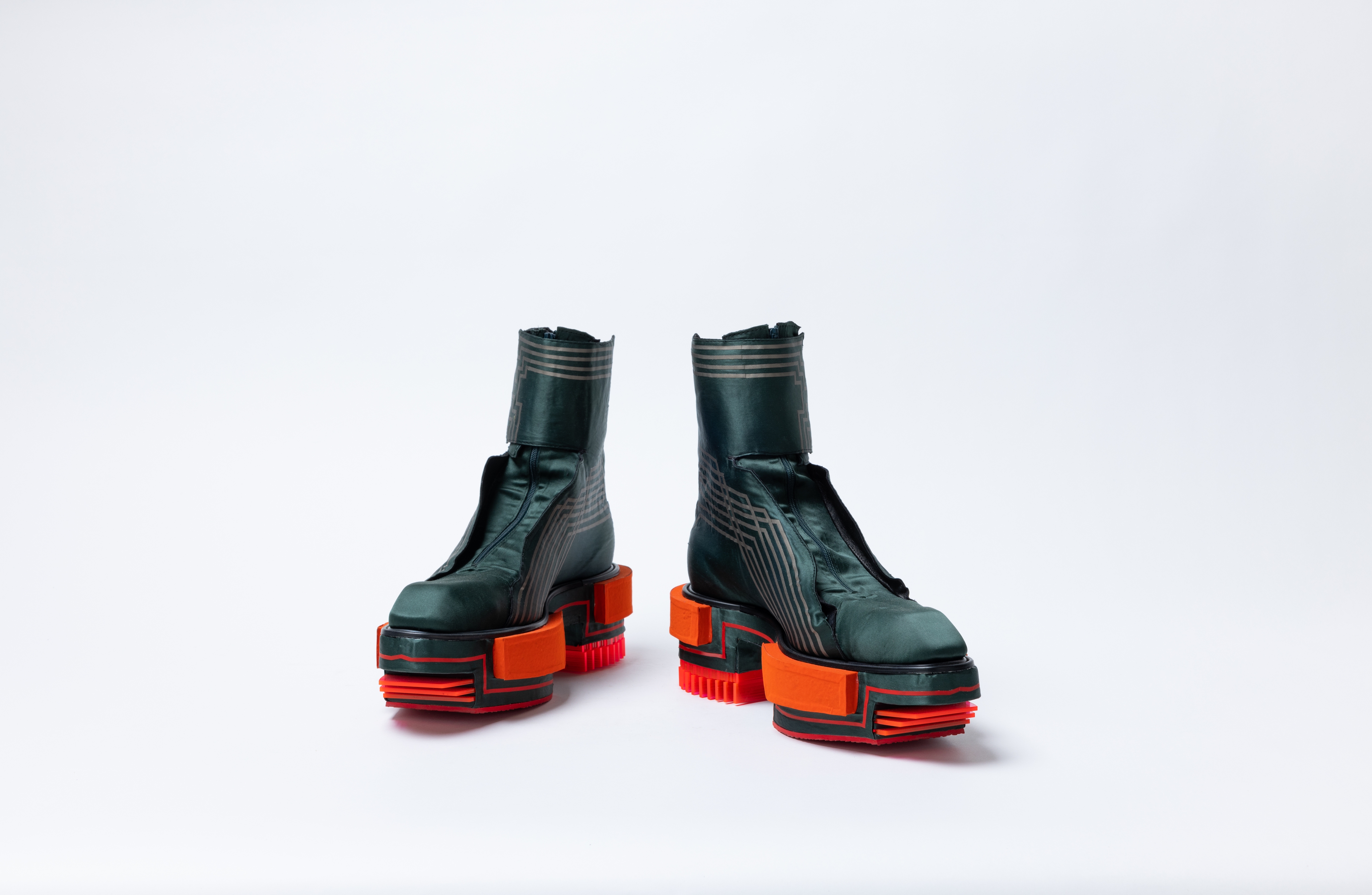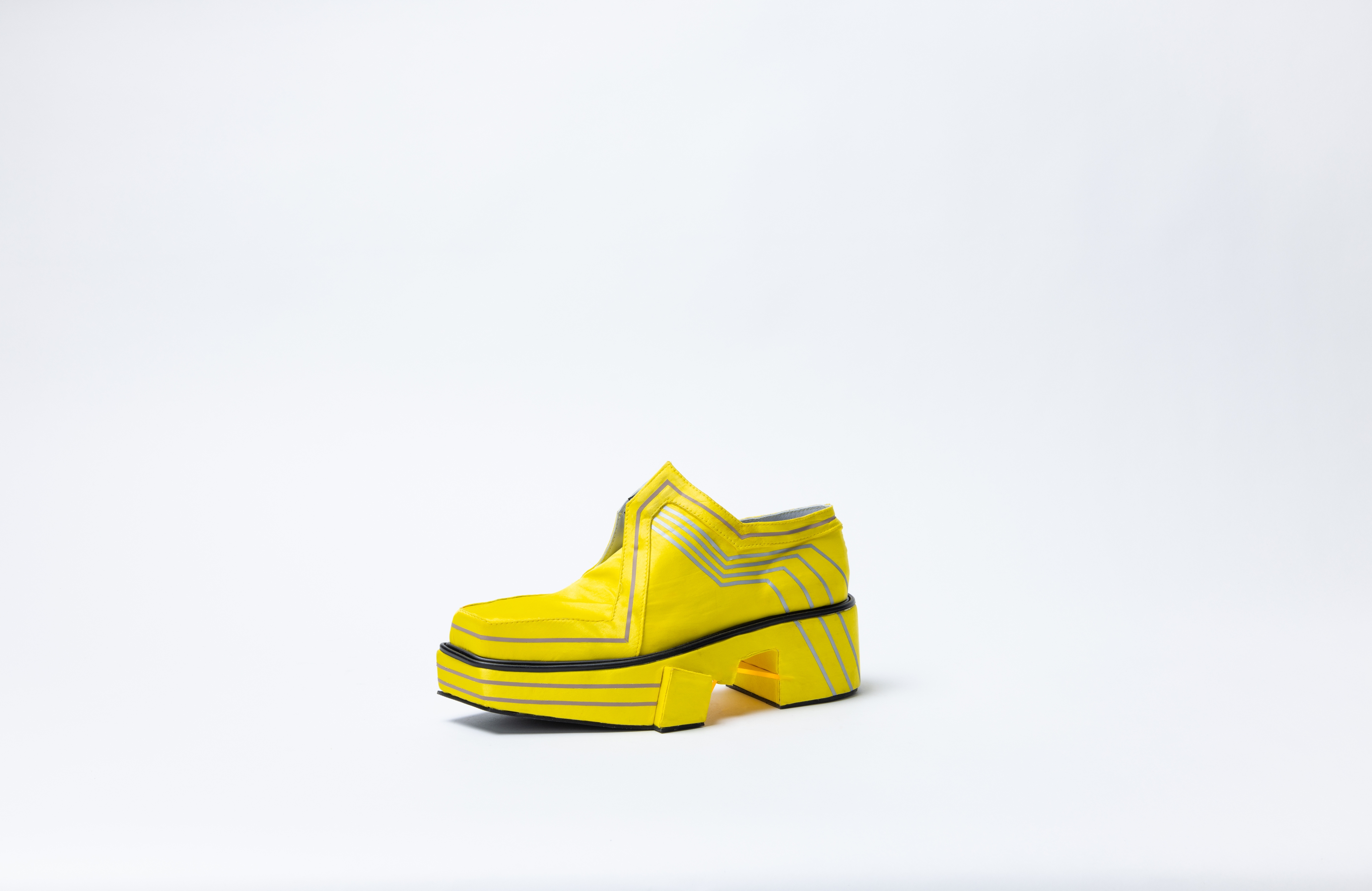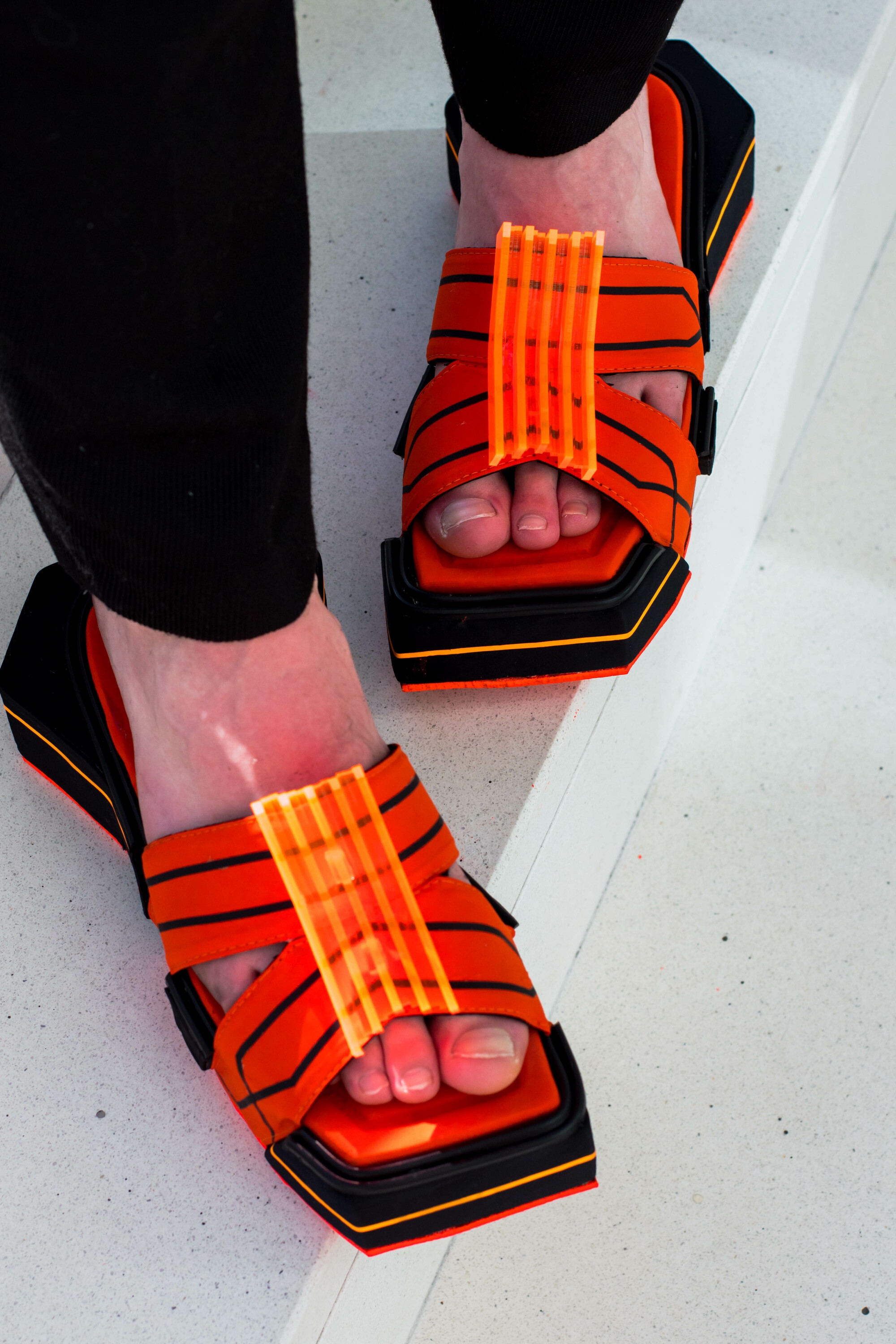 To translate these sources of inspiration into a concept for footwear, fabric uppers, leather lining, adhesive PET and (fluor) plexi-glass were used.