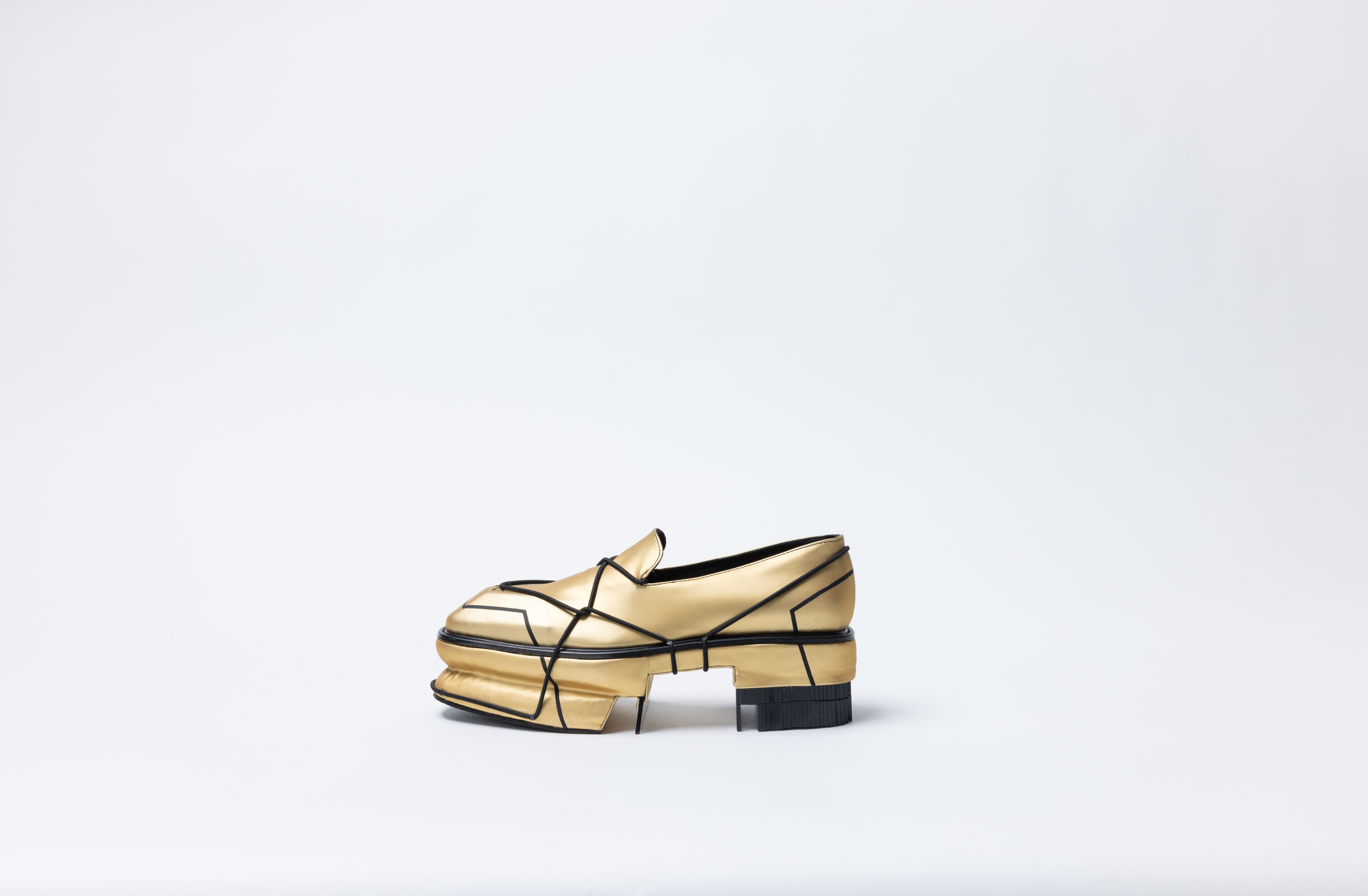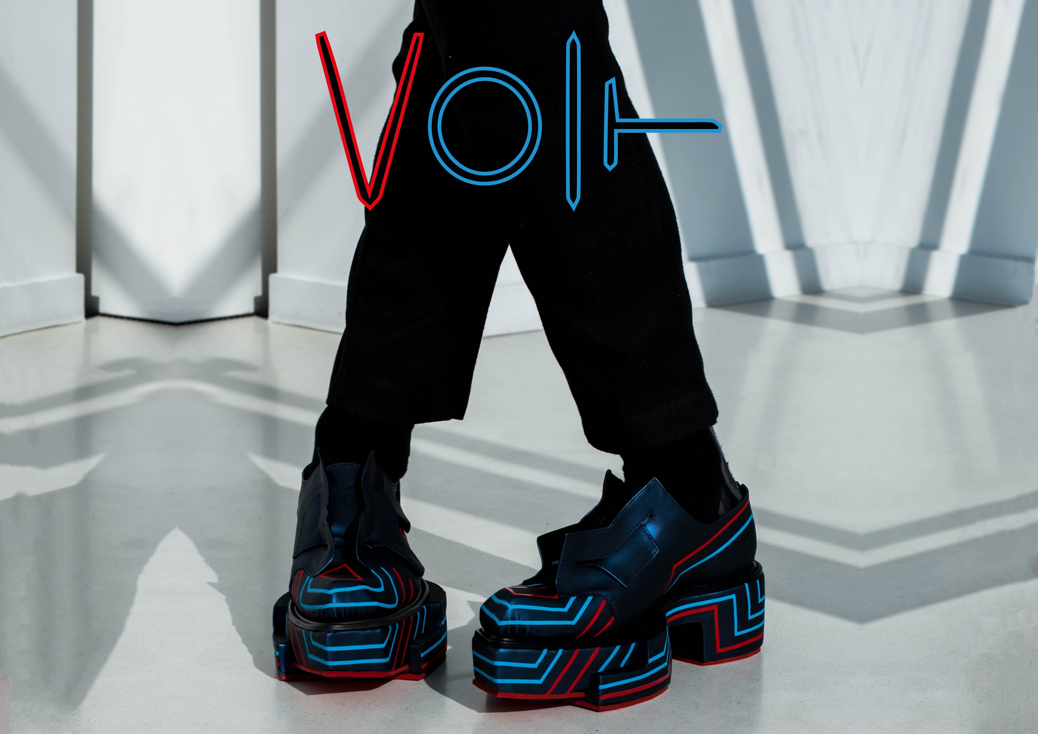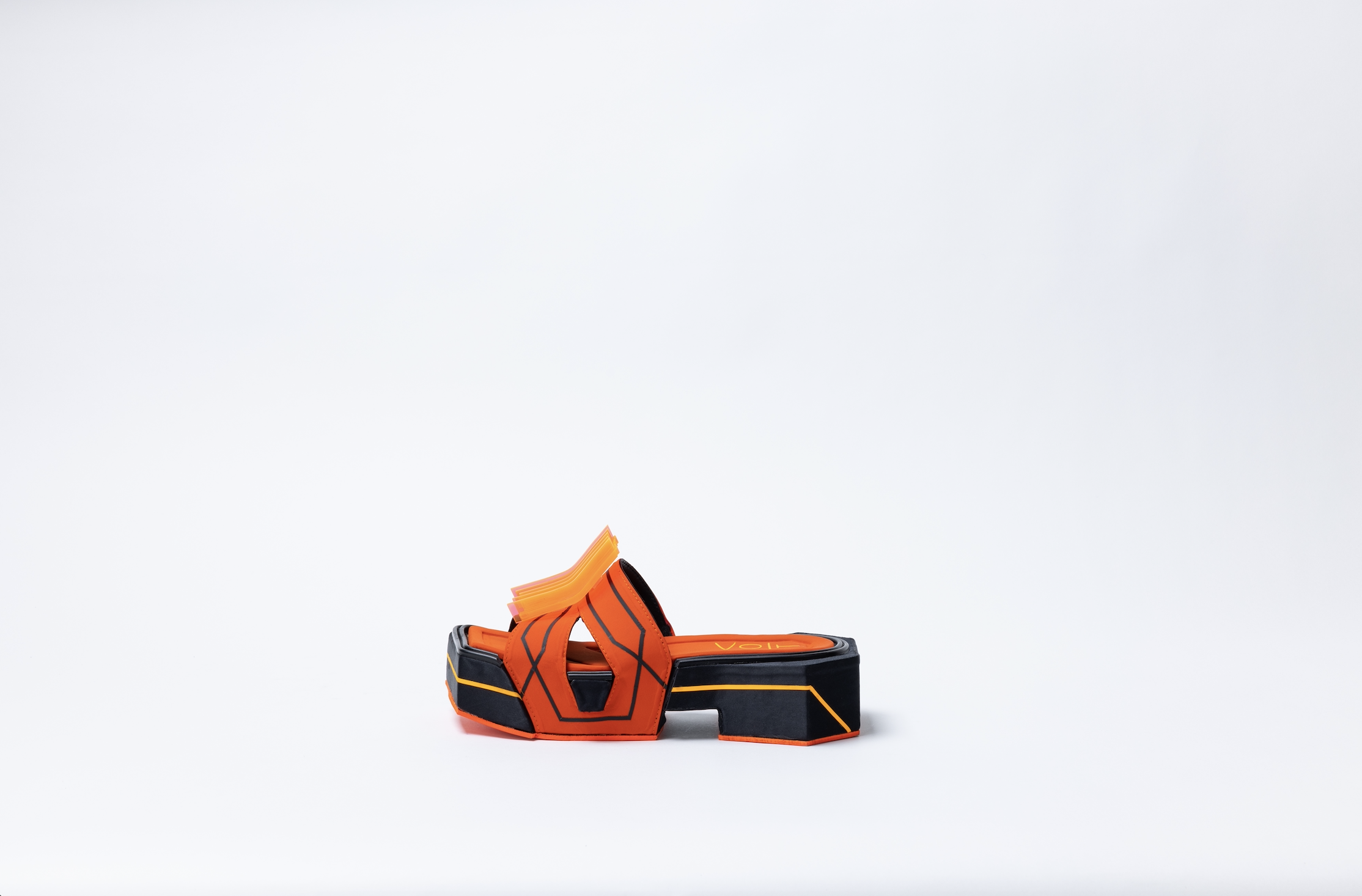 To translate these sources of inspiration into a concept for footwear, fabric uppers, leather lining, adhesive PET and (fluor) plexi-glass were used.