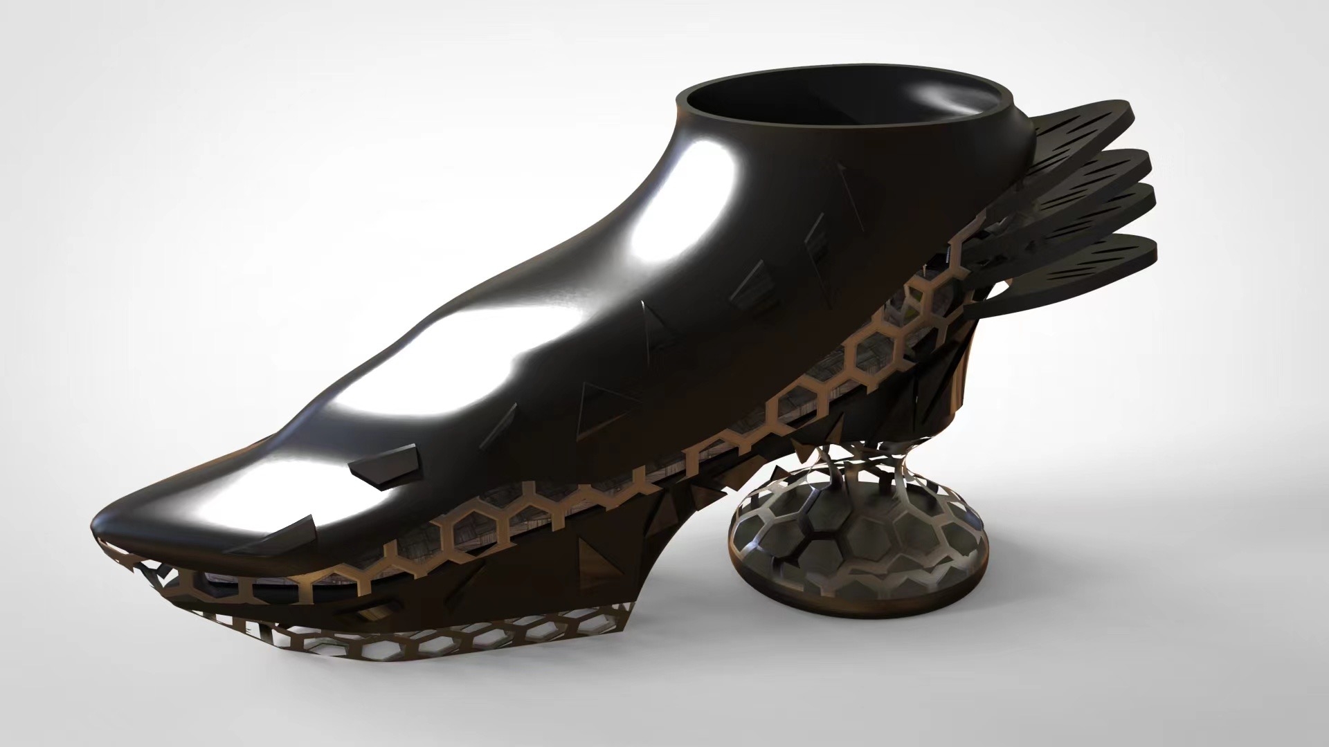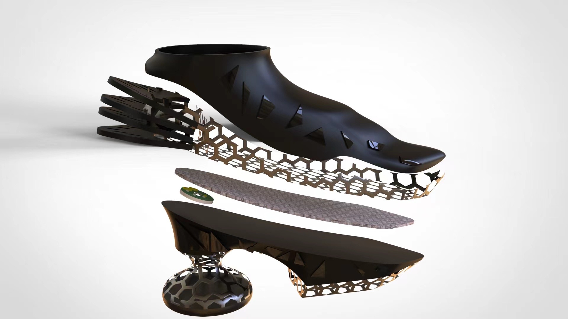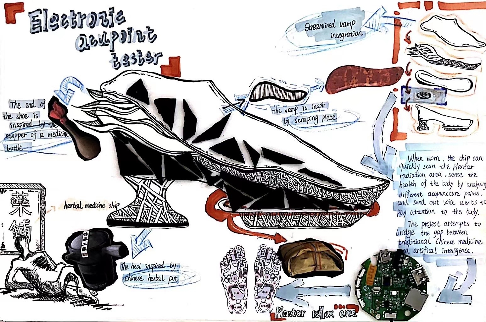 The shoes are designed to detect the health of body organs through different acupoints, which are combined with artificial intelligence based on plantar reflex acupoints. The whole body of the shoe is streamlined through 3D printing. The sole mimics the form of human acupoints and smart chips are inserted into the heel, attempting to bridge the gap between traditional Chinese medicine and artificial intelligence. It tries to change the relationship between shoes and body from "thing and creature" to "creature and creature".