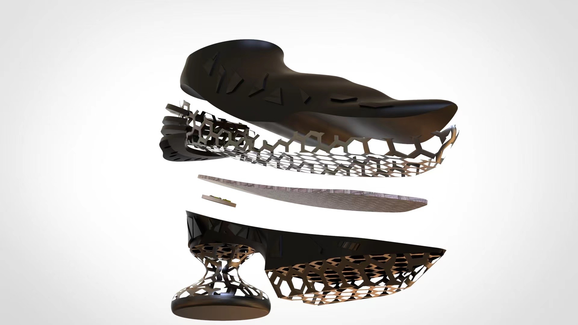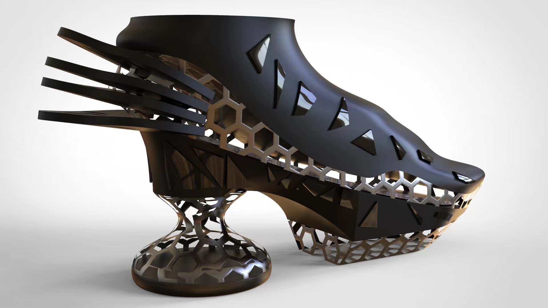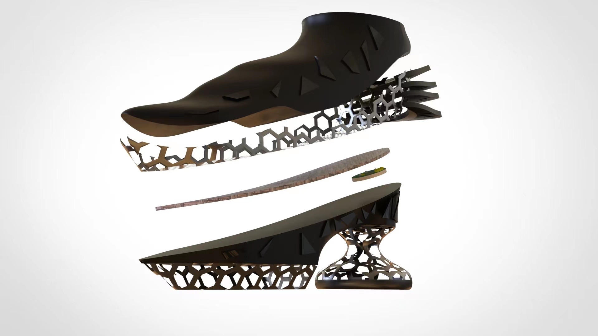 The shoes are designed to detect the health of body organs through different acupoints, which are combined with artificial intelligence based on plantar reflex acupoints. The whole body of the shoe is streamlined through 3D printing. The sole mimics the form of human acupoints and smart chips are inserted into the heel, attempting to bridge the gap between traditional Chinese medicine and artificial intelligence. It tries to change the relationship between shoes and body from "thing and creature" to "creature and creature".