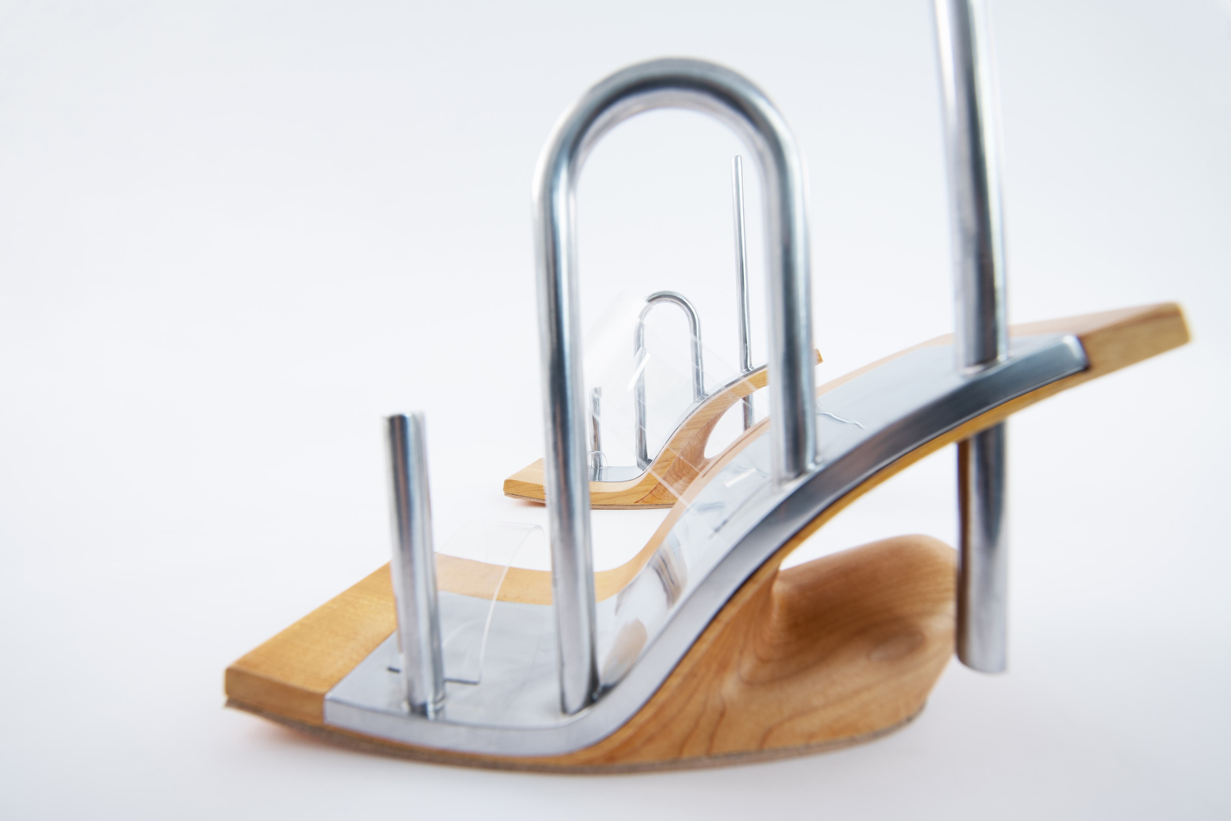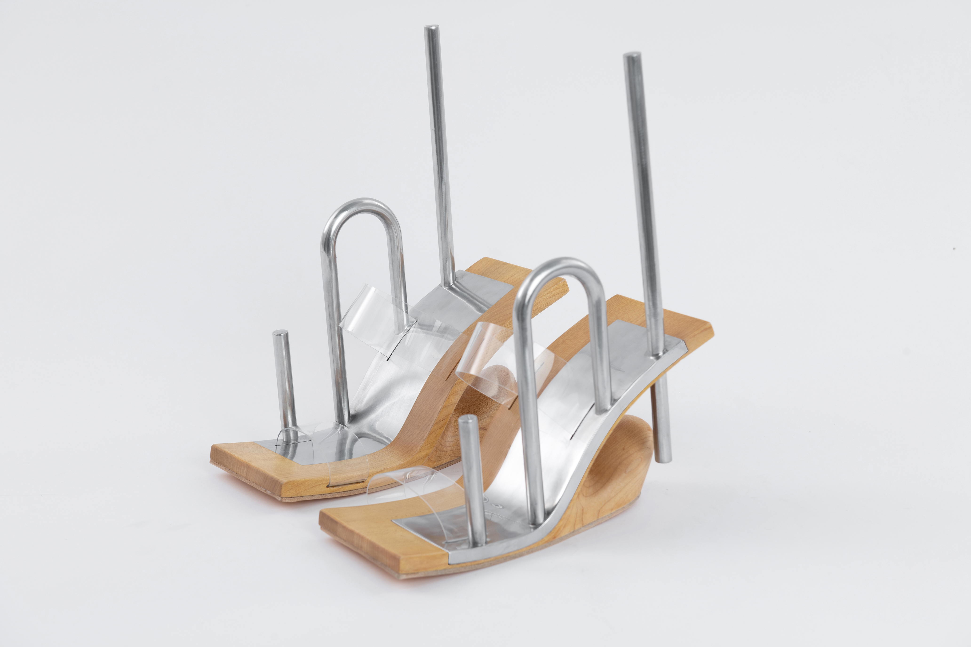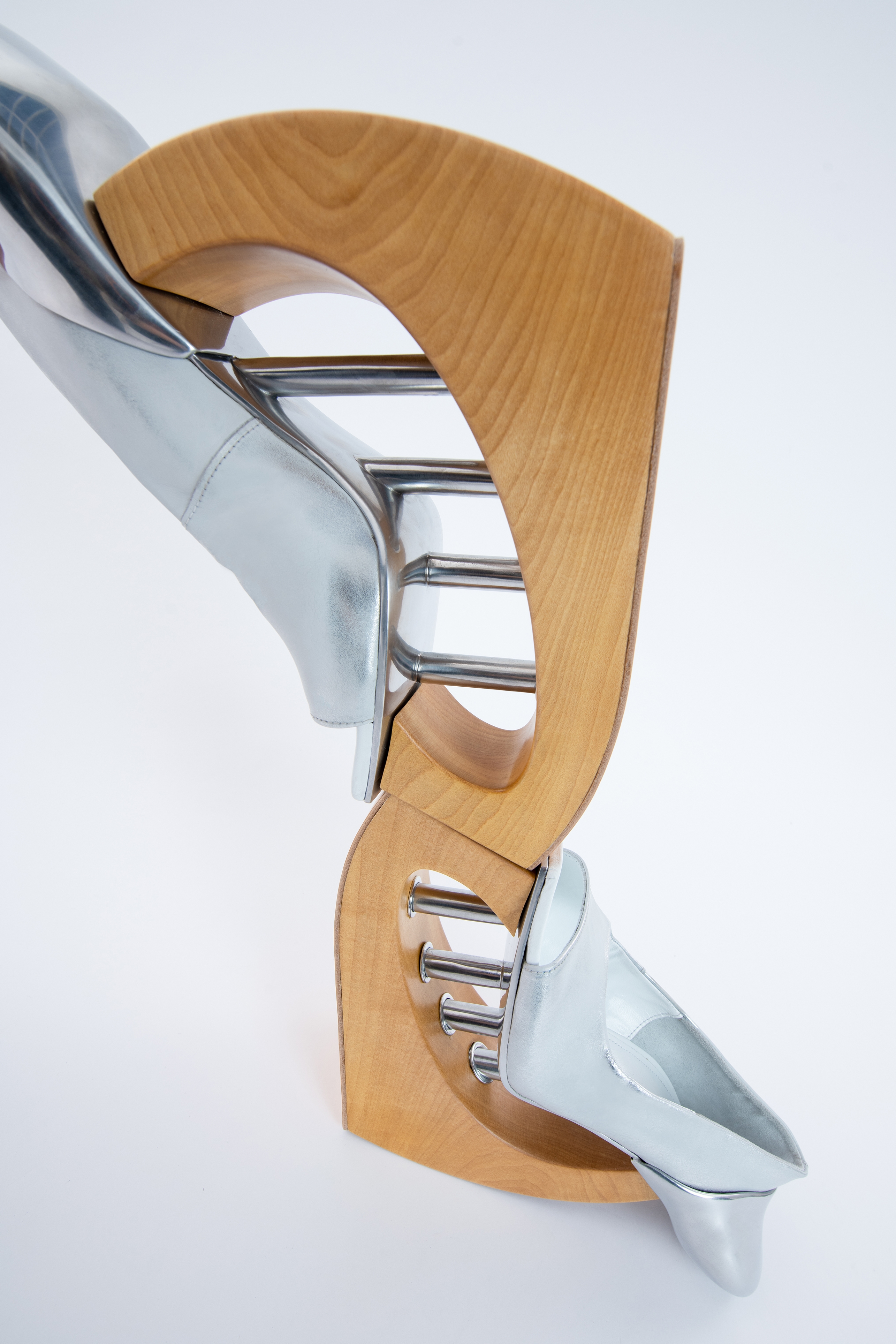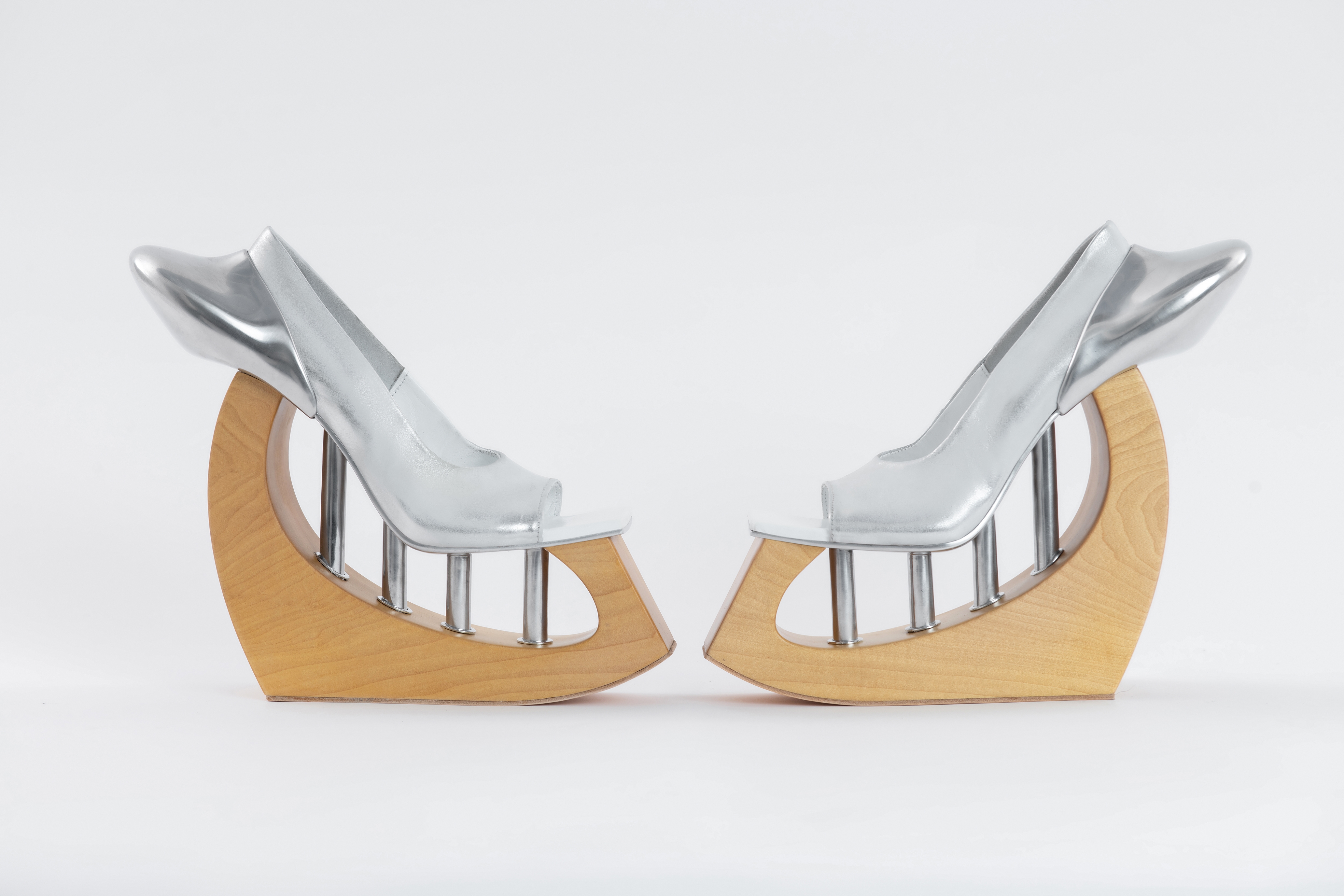 This experimental footwear collection comes from designer Ying Ou's fear and unease about the rigidity of self-consciousness caused by the physical separation of the human body from the external environment in public space in this era. By exploring the changing position of the subject and the relationship between railings and handrails, and contemplating its psychological spatial perception, the collection explores new forms of footwear that attempt to awaken human communication and perception of objects in public space. And looking for breakthroughs in metal, two-tone leather and 3D printing.