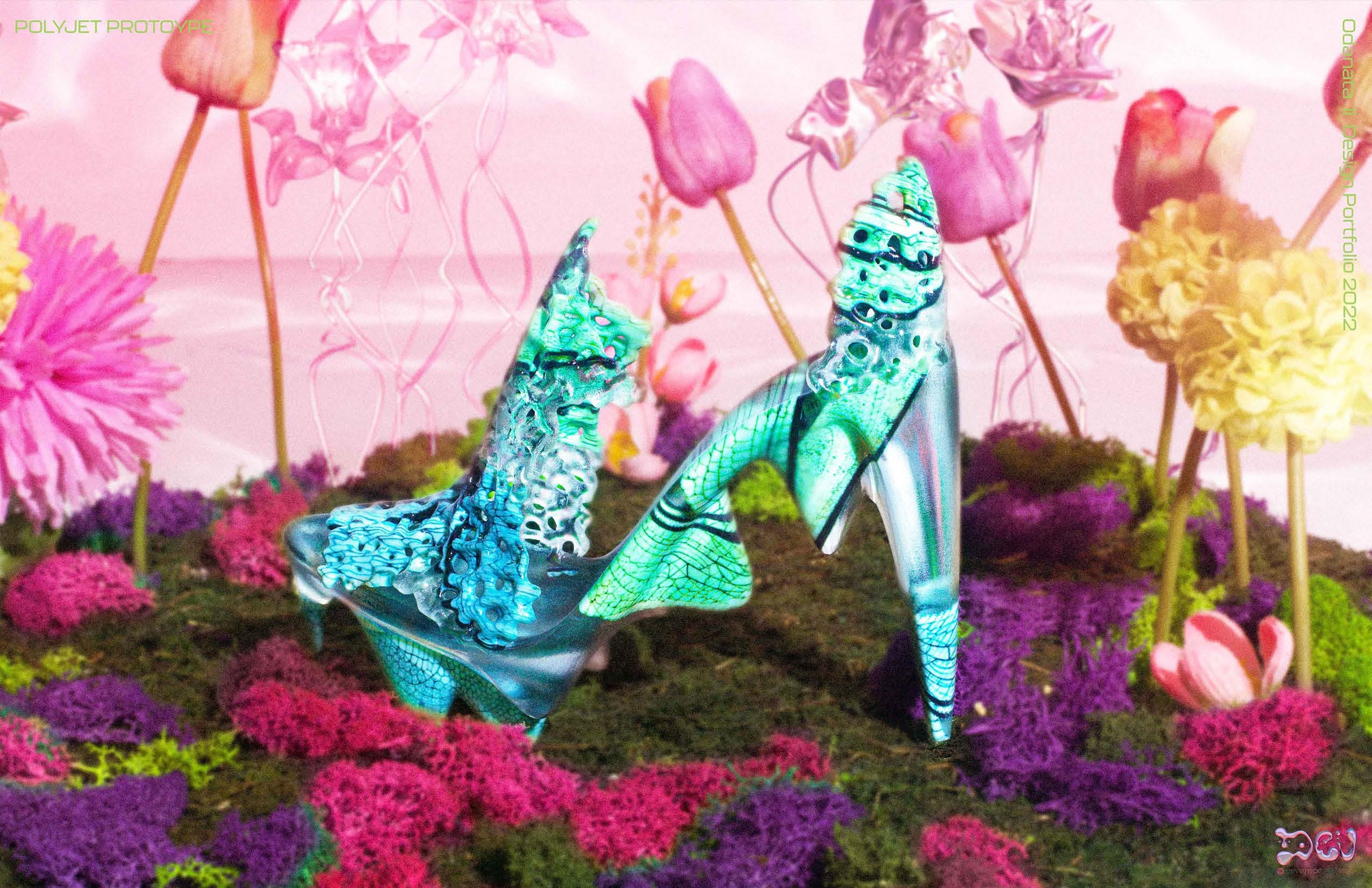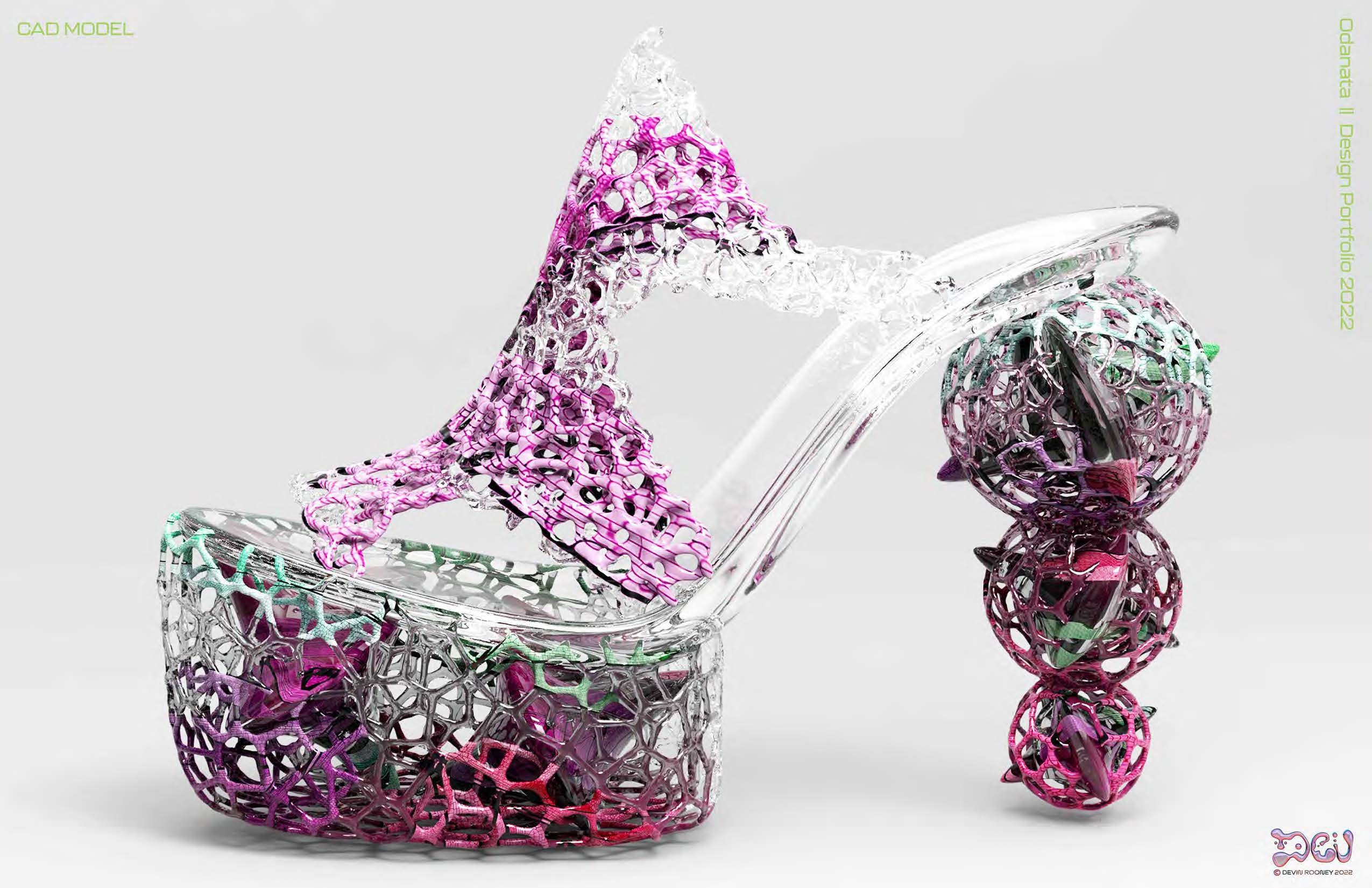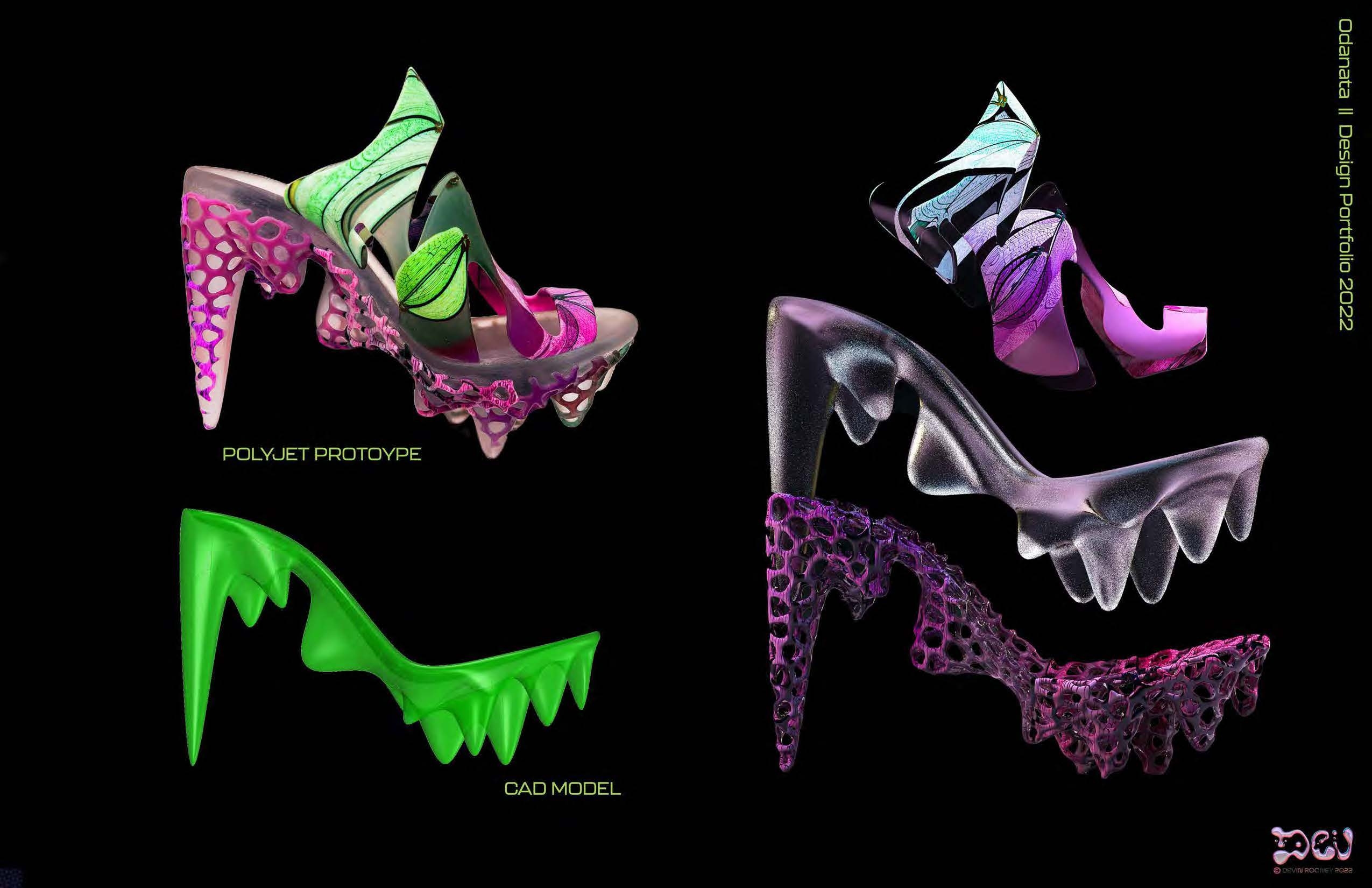 Odonata is an entirely resin polyjet 3-d printed heel collection inspired by the growth patterns of dragonfly wings. Dragonflies represent overcoming delusions of the self along with transformation in the same way this collection helped me transform from a student to a Designer with a capital D. Odanata is a collection of three heels Lilibula, Odonata and Lilbu. Using rhino & grasshopper modeling software Odonata was grown using Voronoi structures to mimic nature's favoring of efficiency in wings. Each cell in Voronoi has a seed point finding the nearest neighbor & shortest path to structure.