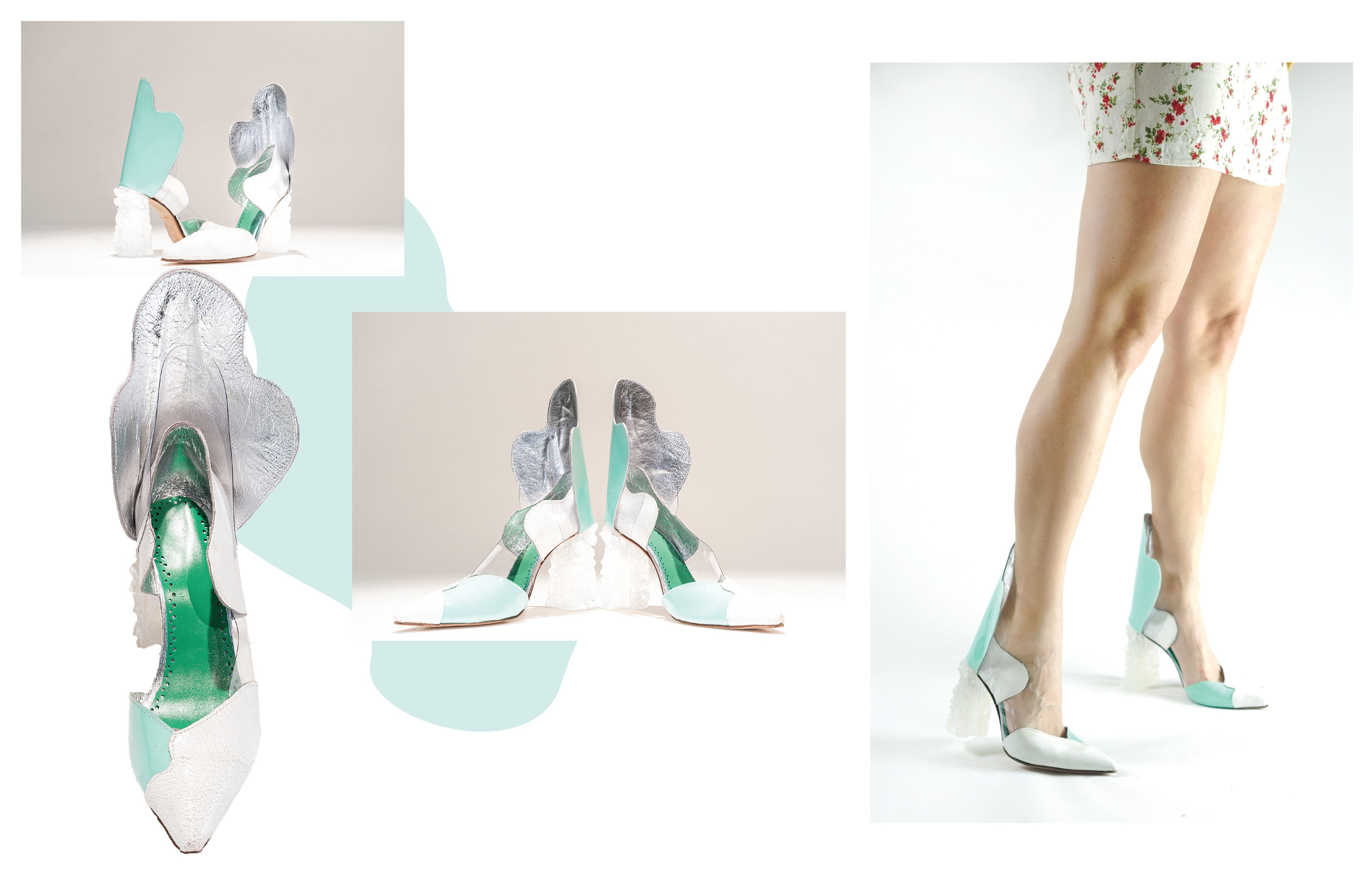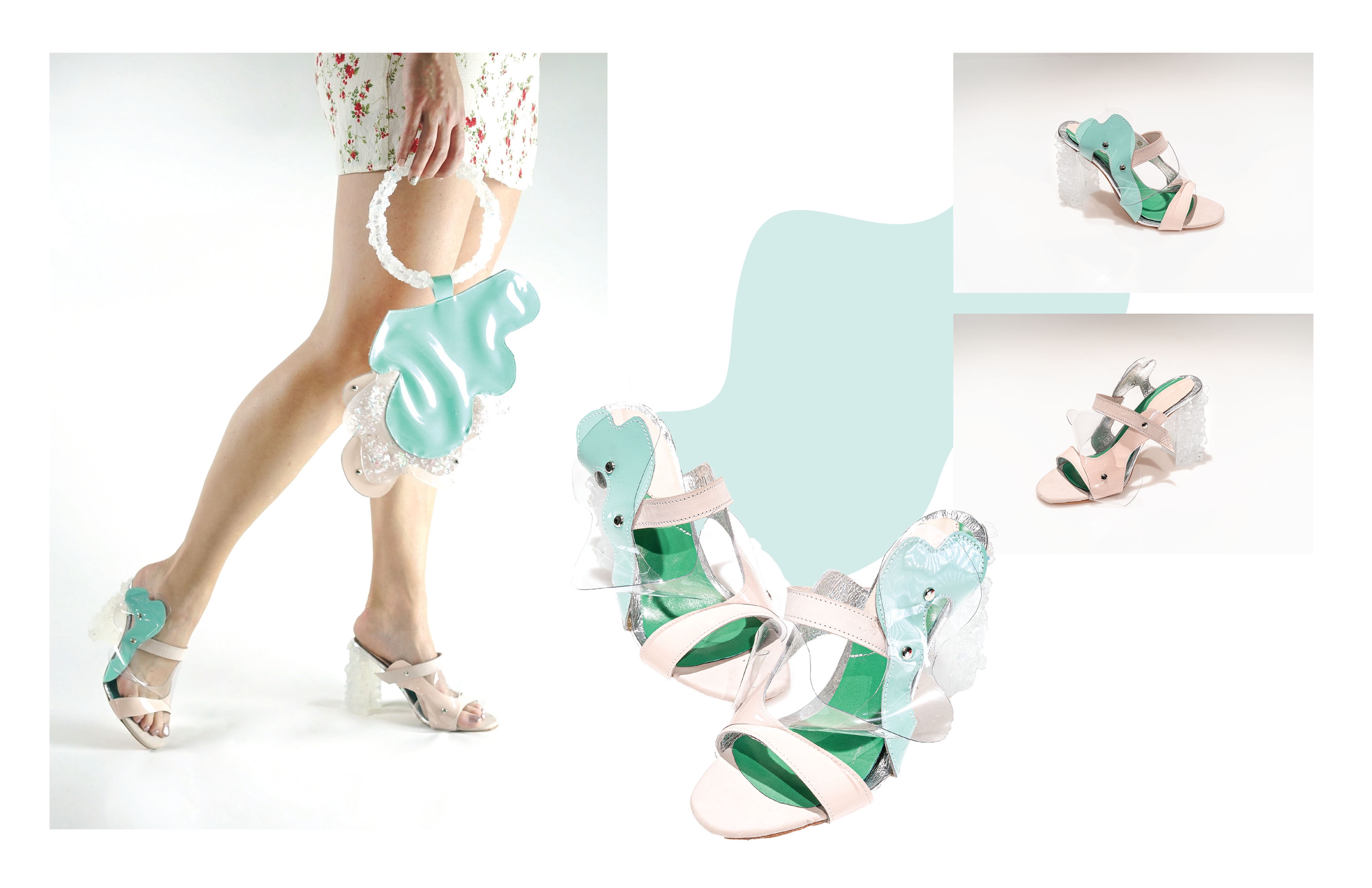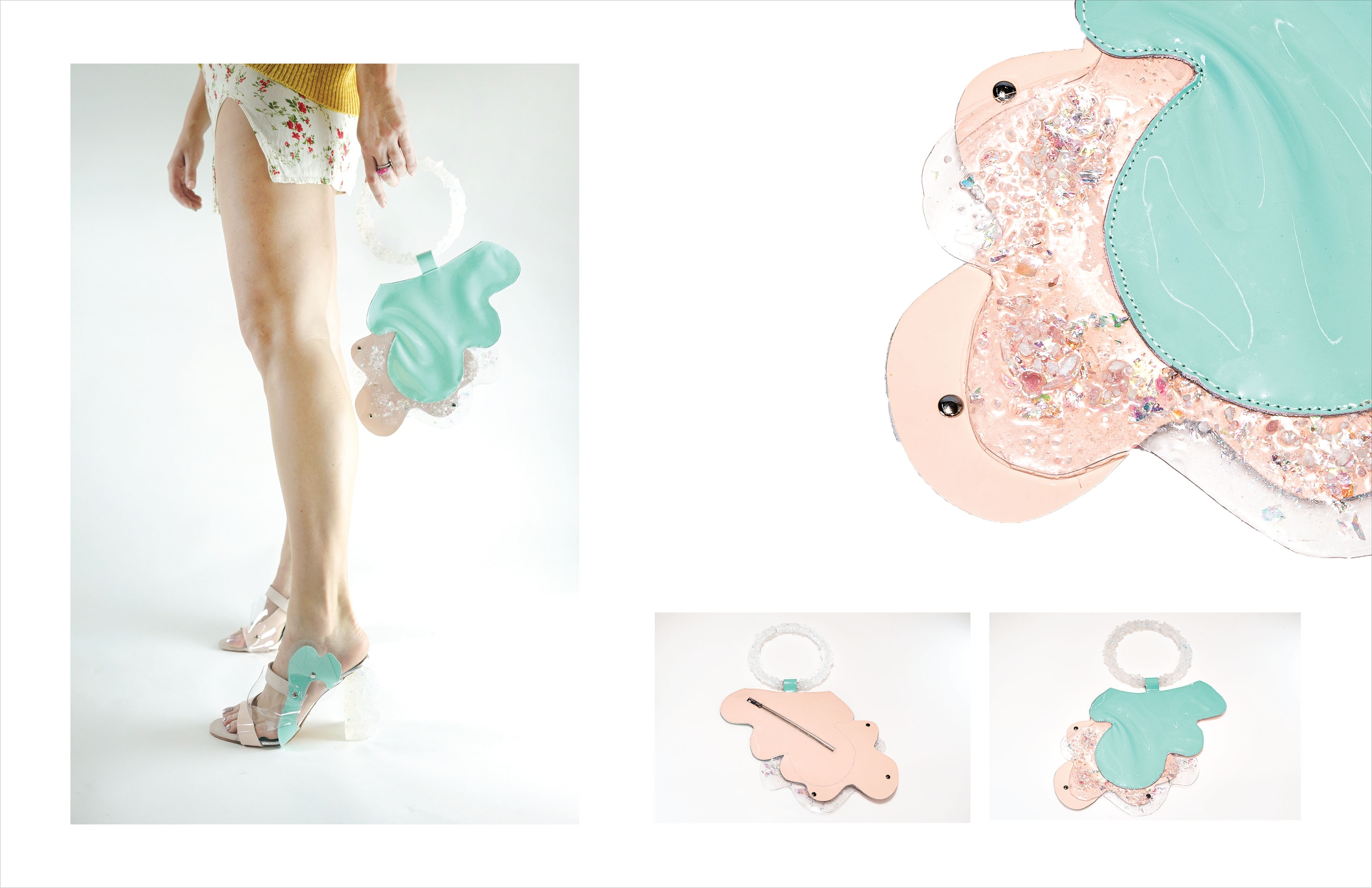 This footwear and handbag collection was inspired by frozen lakes and salt flats. The idea was to create a heel that looks like an iceberg. I experimented glueing various crushed natural stones onto different heel and handle shapes, making a mold out of the shape. Then using mix of resin, glitter and natural stones to create a texture that is similar to ice.