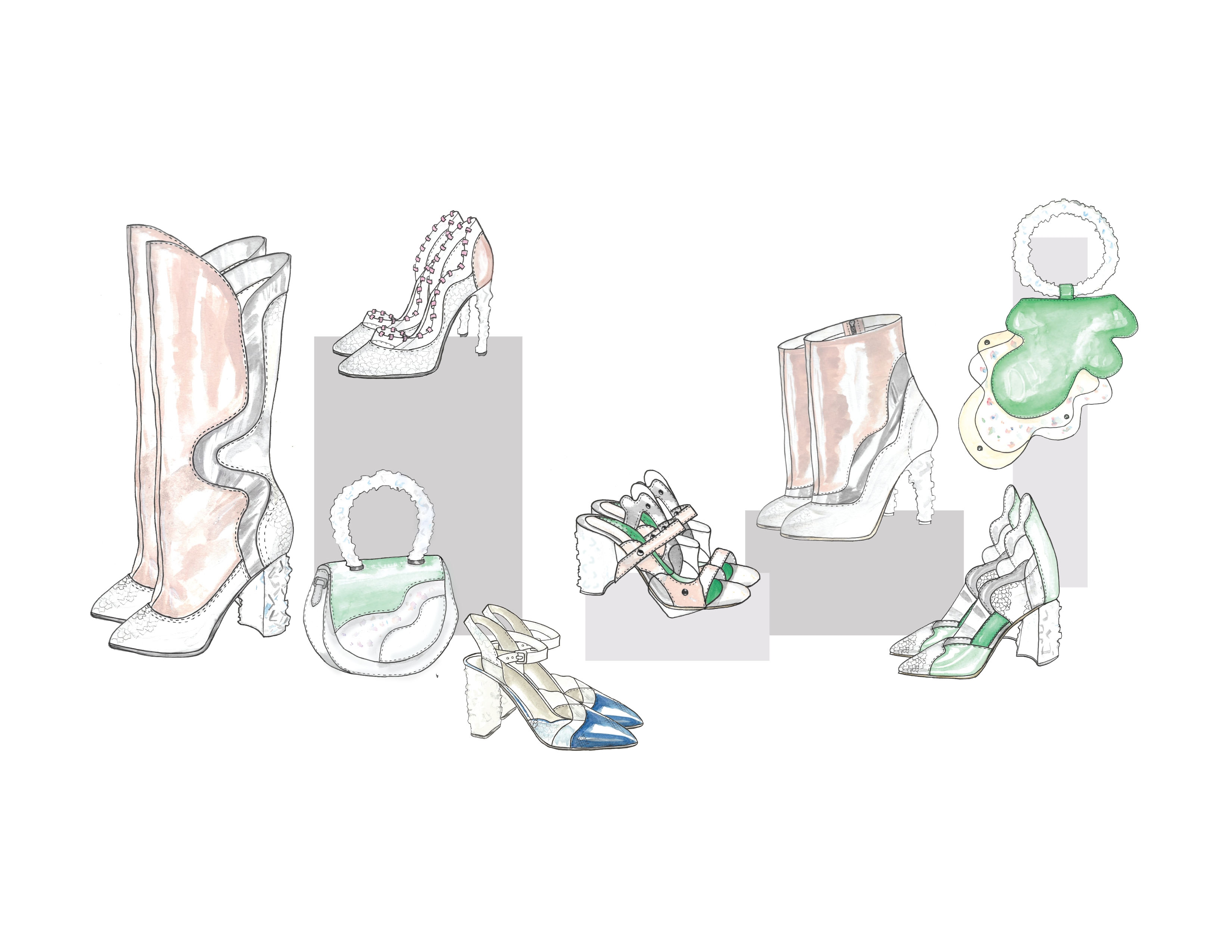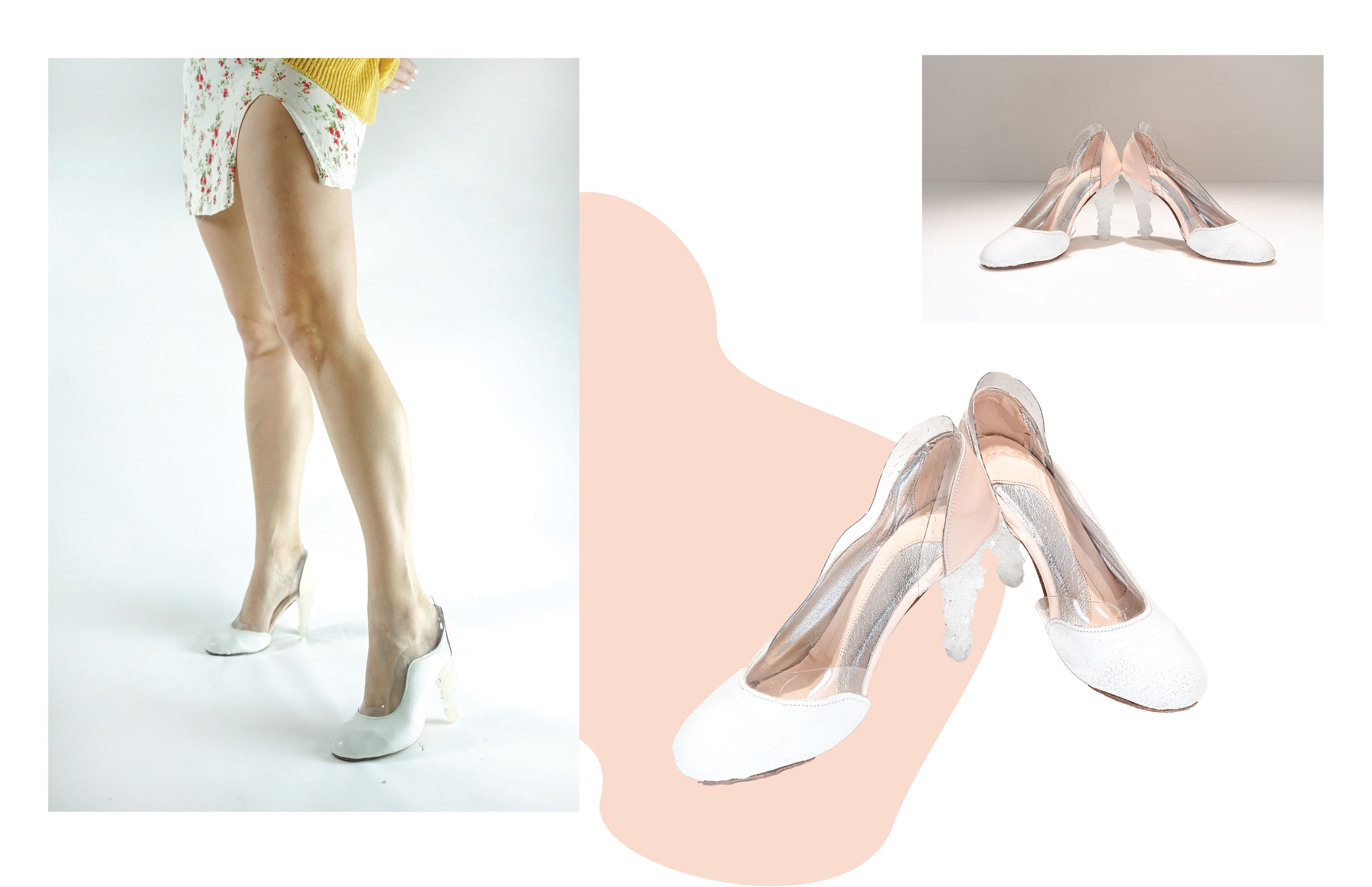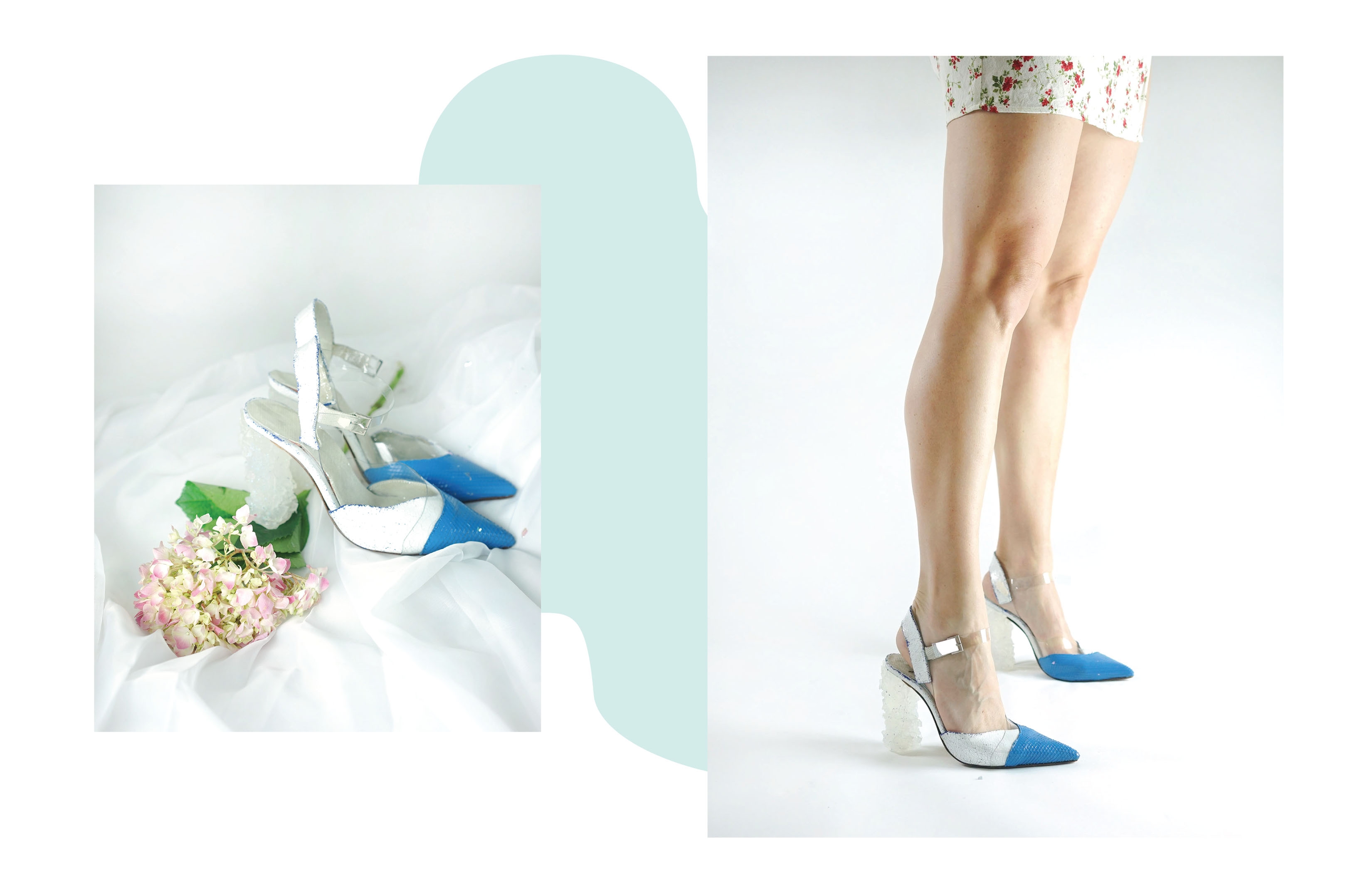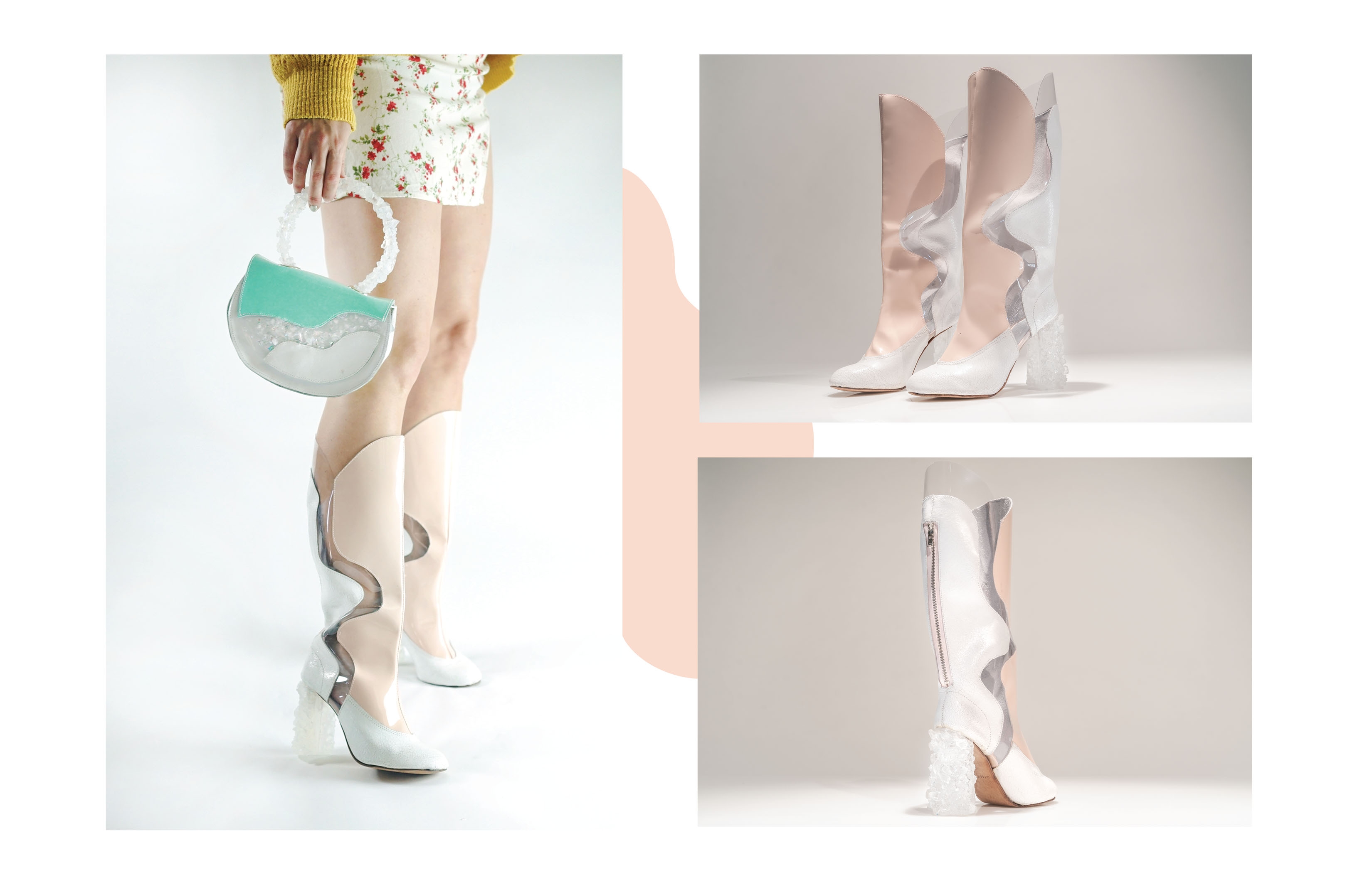 This footwear and handbag collection was inspired by frozen lakes and salt flats. The idea was to create a heel that looks like an iceberg. I experimented glueing various crushed natural stones onto different heel and handle shapes, making a mold out of the shape. Then using mix of resin, glitter and natural stones to create a texture that is similar to ice.