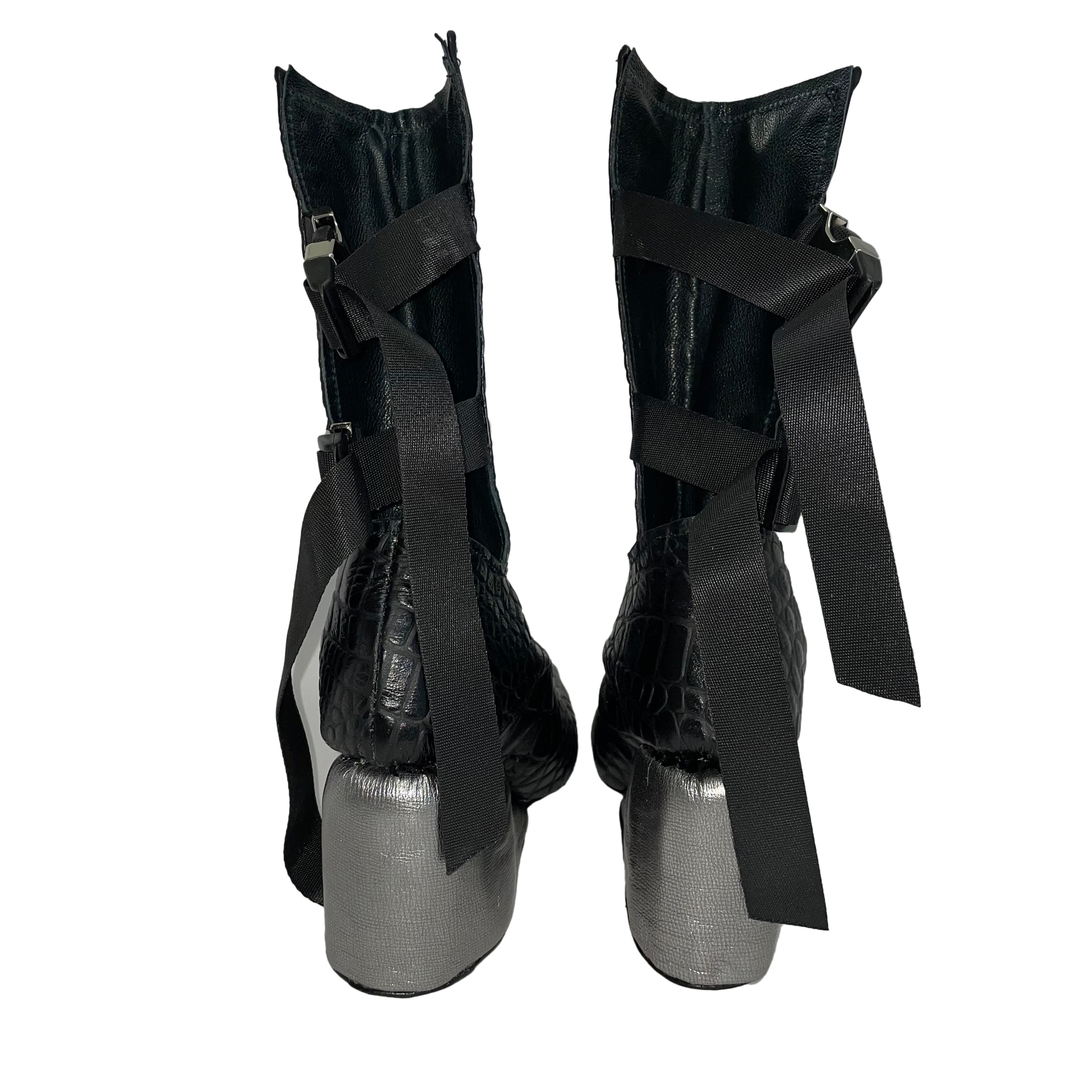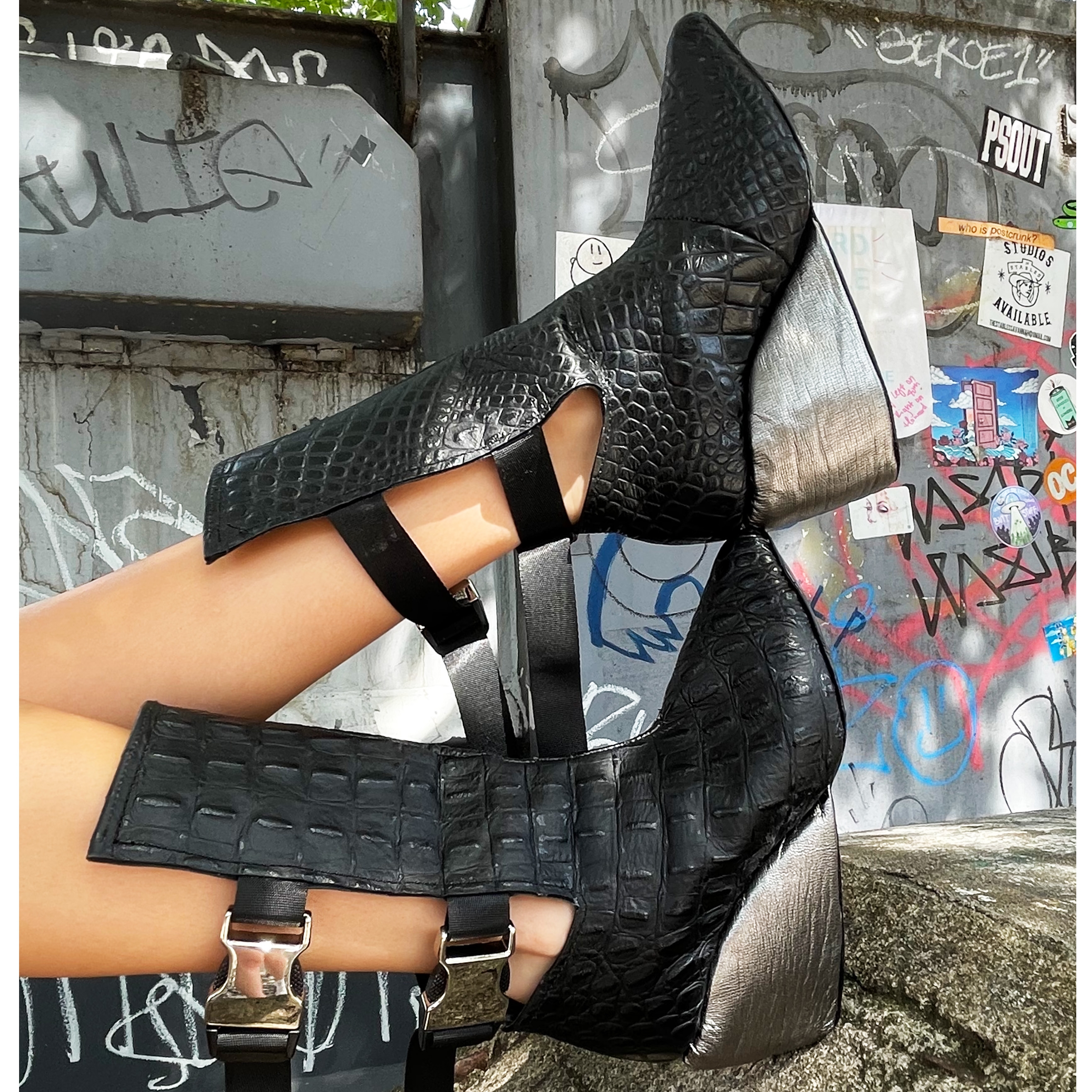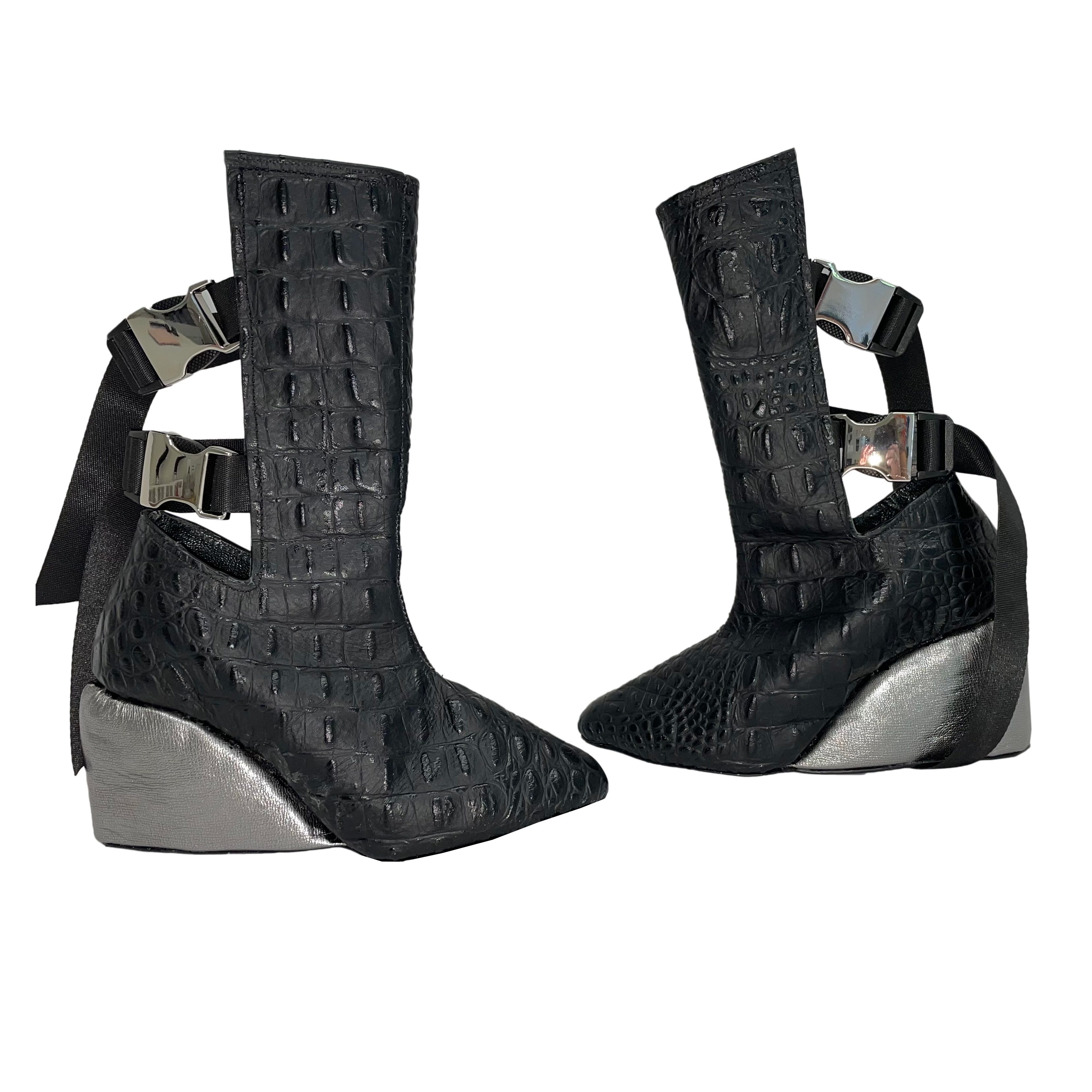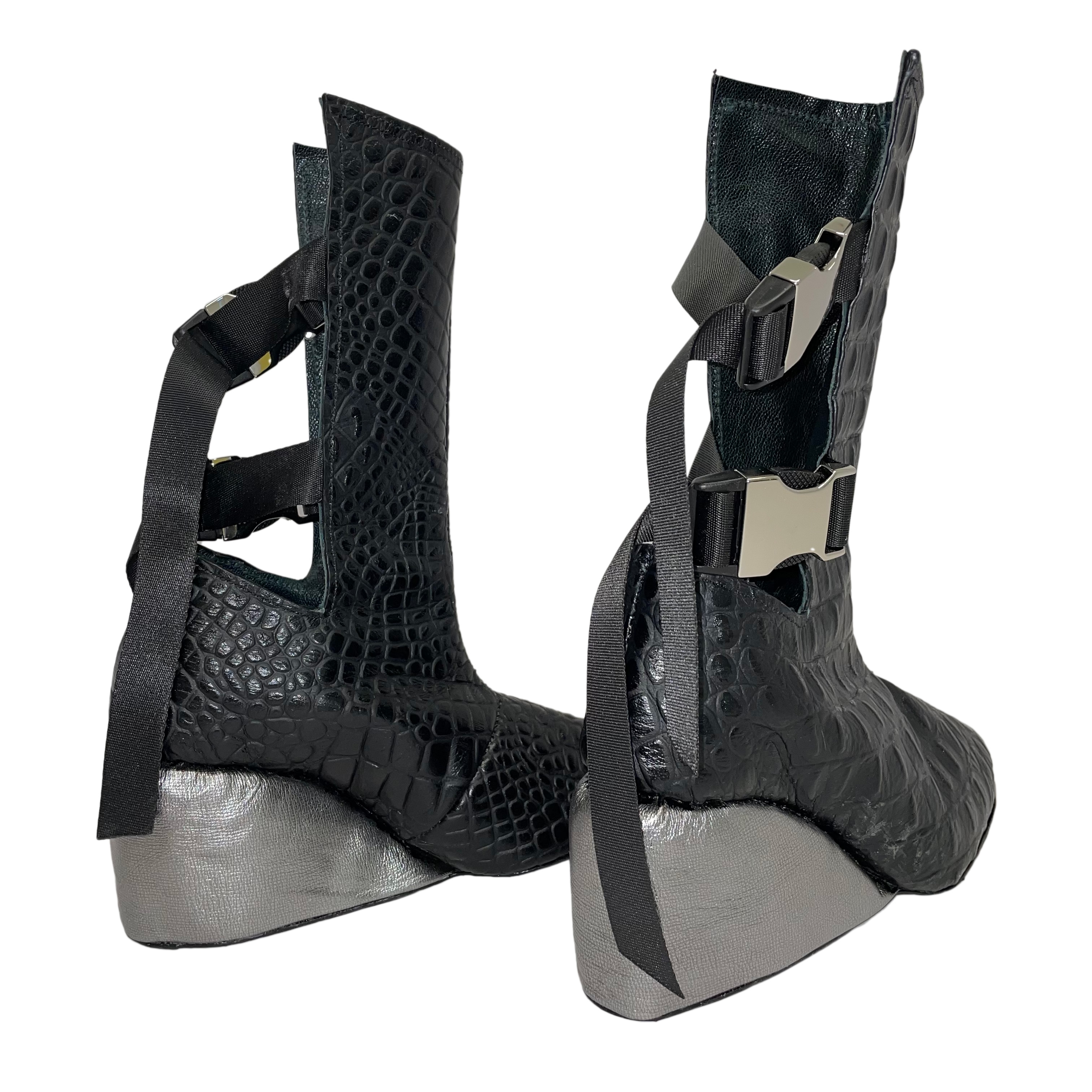 The upper of the Claire Wedge is constructed from embossed cowhide with adjustable side release buckles attached to nylon straps. The wedge portion of this shoe is carefully hand-carved EVA Foam wrapped in a thin leather