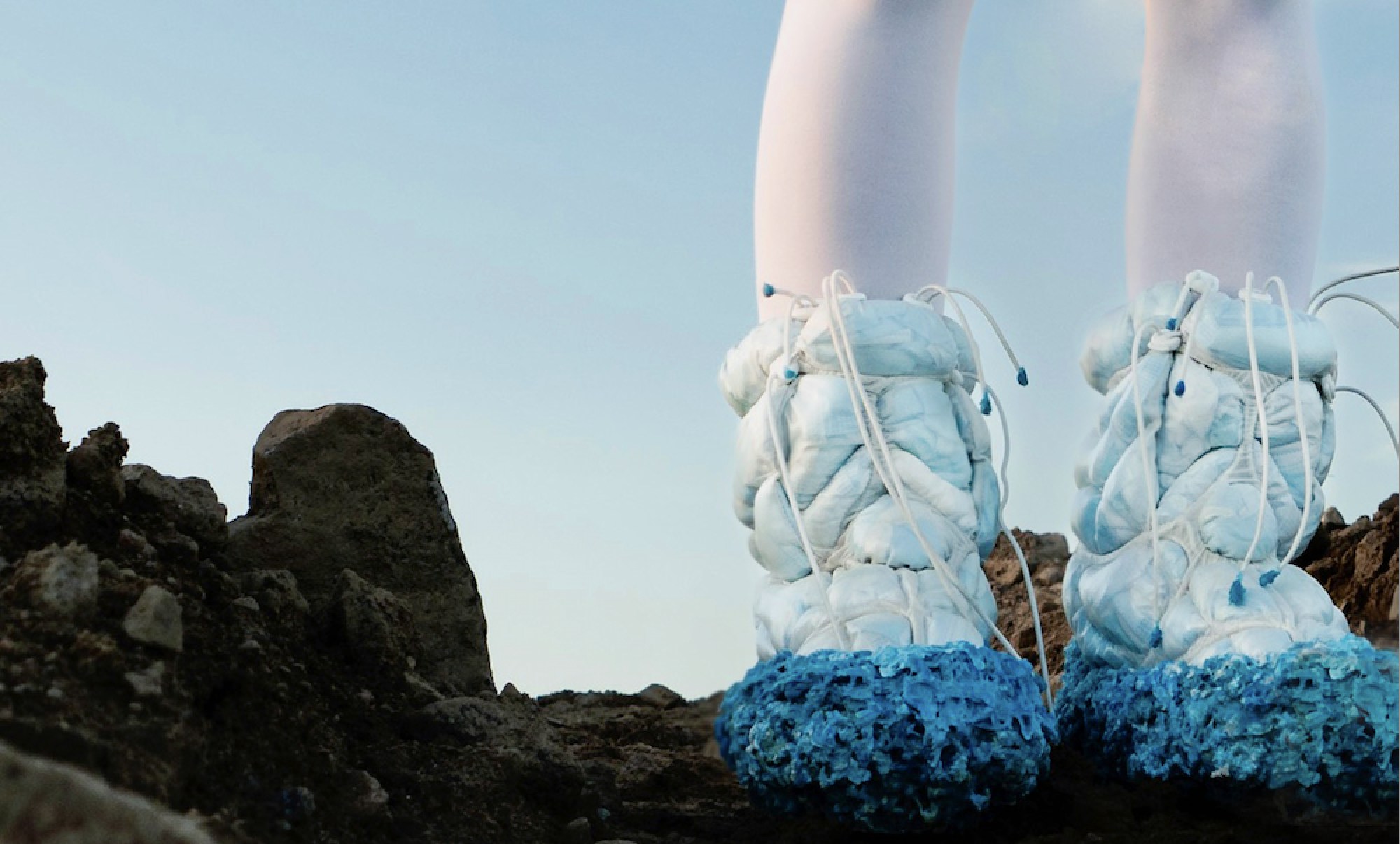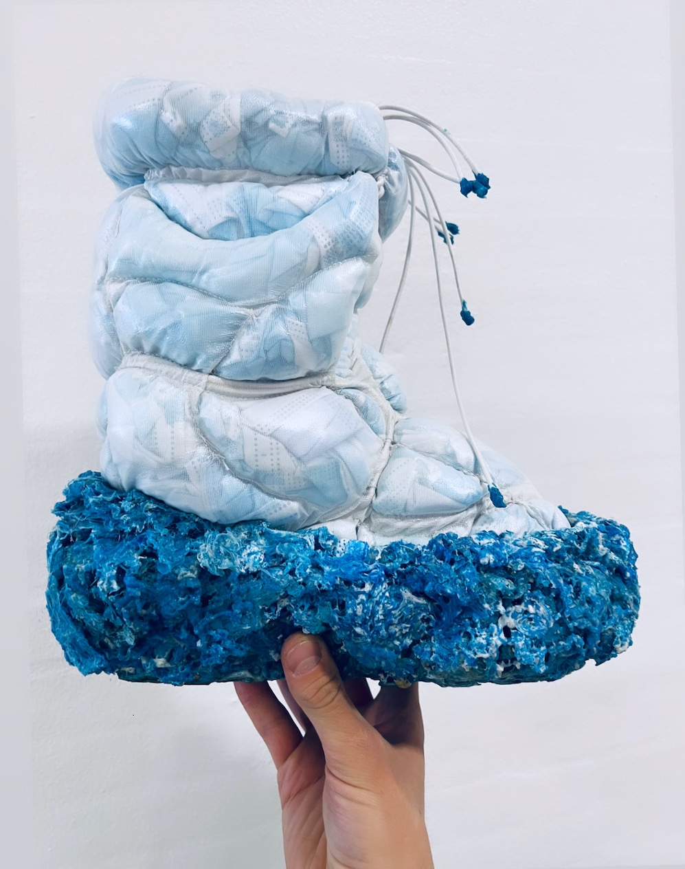 Inspired by cold arctic explorations. Shaped like a boot meant to resist extreme conditions. Thick opulent sole is made out of heat melted facemasks, revealing its corroded look in this contrasting design. A forward-looking product that has already been worn by the elements.