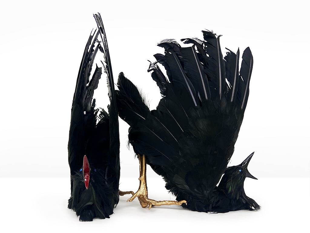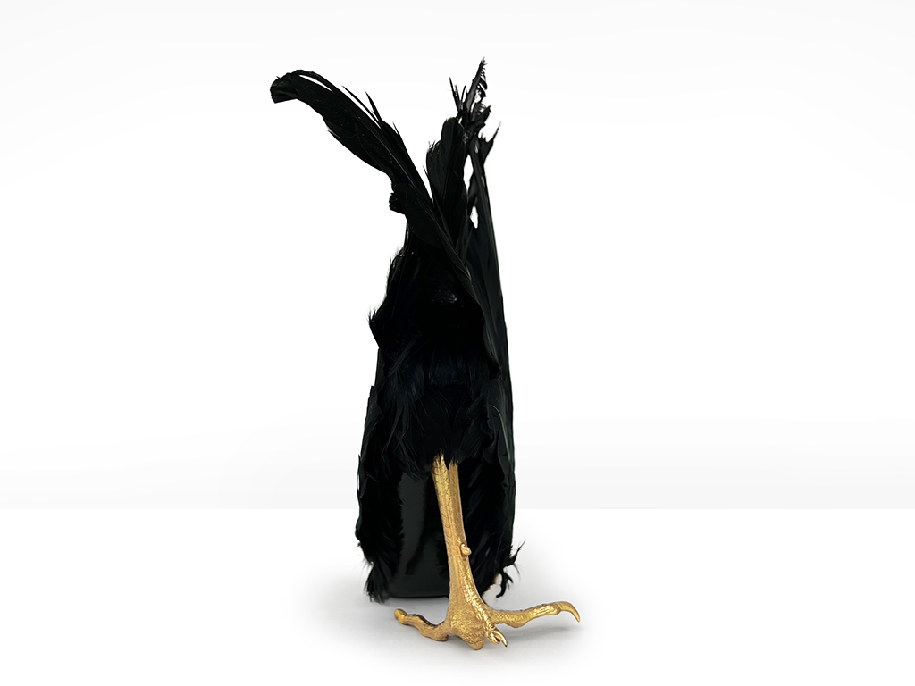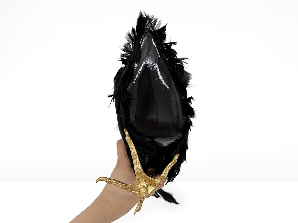 Materials: Refurbished Crow Toy, Feathers, Chicken leg, Crystals, Epoxy Clay A playful design inspired by the image of vast and serene wheat fields interrupted by a flock of crows.