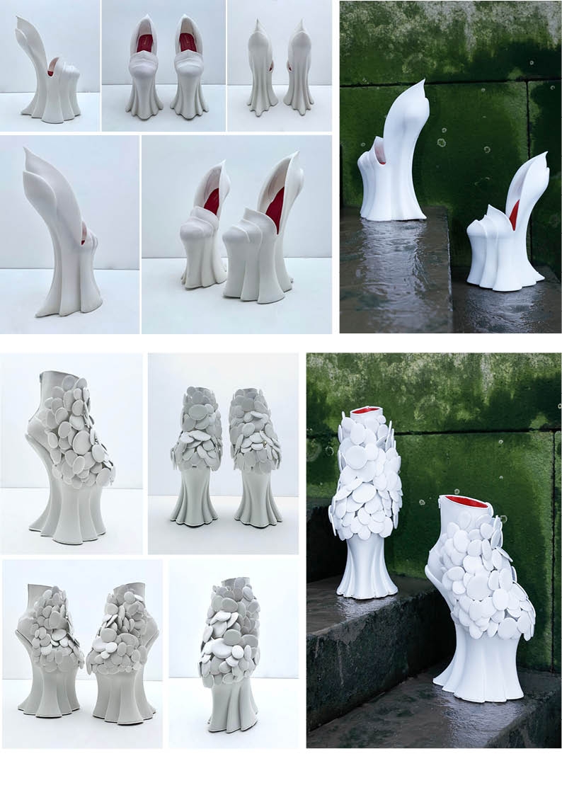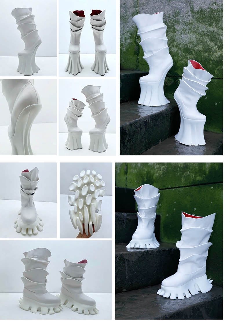 "Walking on Water" is a collection of futuristic fashion shoes designed around the contemporary sustainability issue of sea-level rise. The project aims to show how people's living environment will change through the design of future footwear, thus guiding people to think about their future environment in terms of adaptability. The project draws inspiration from artifacts and marine life adaptable to marine life. 3D printing technology is used in production engineering in combination with traditional handicrafts, produced using environmentally sustainable materials.