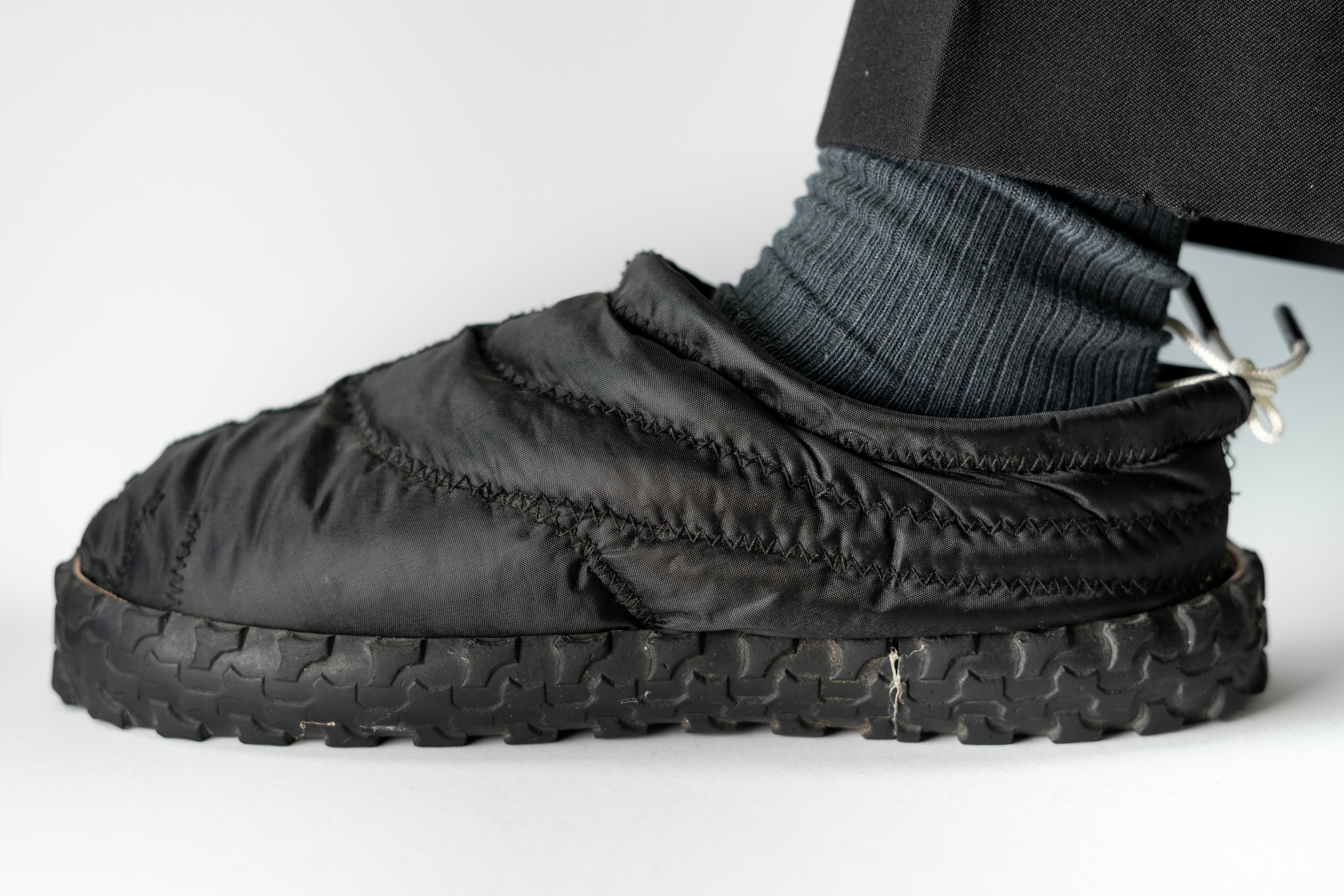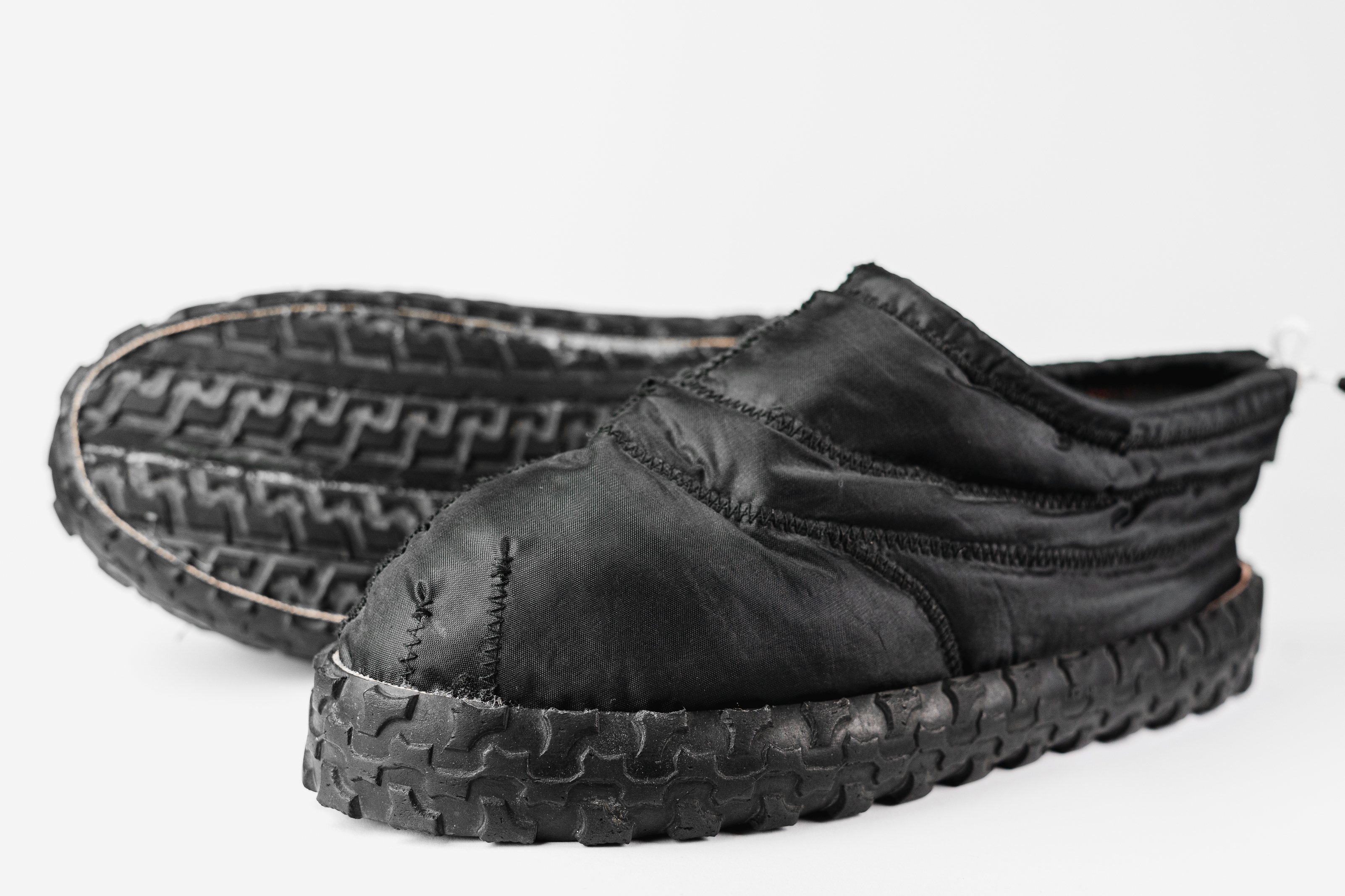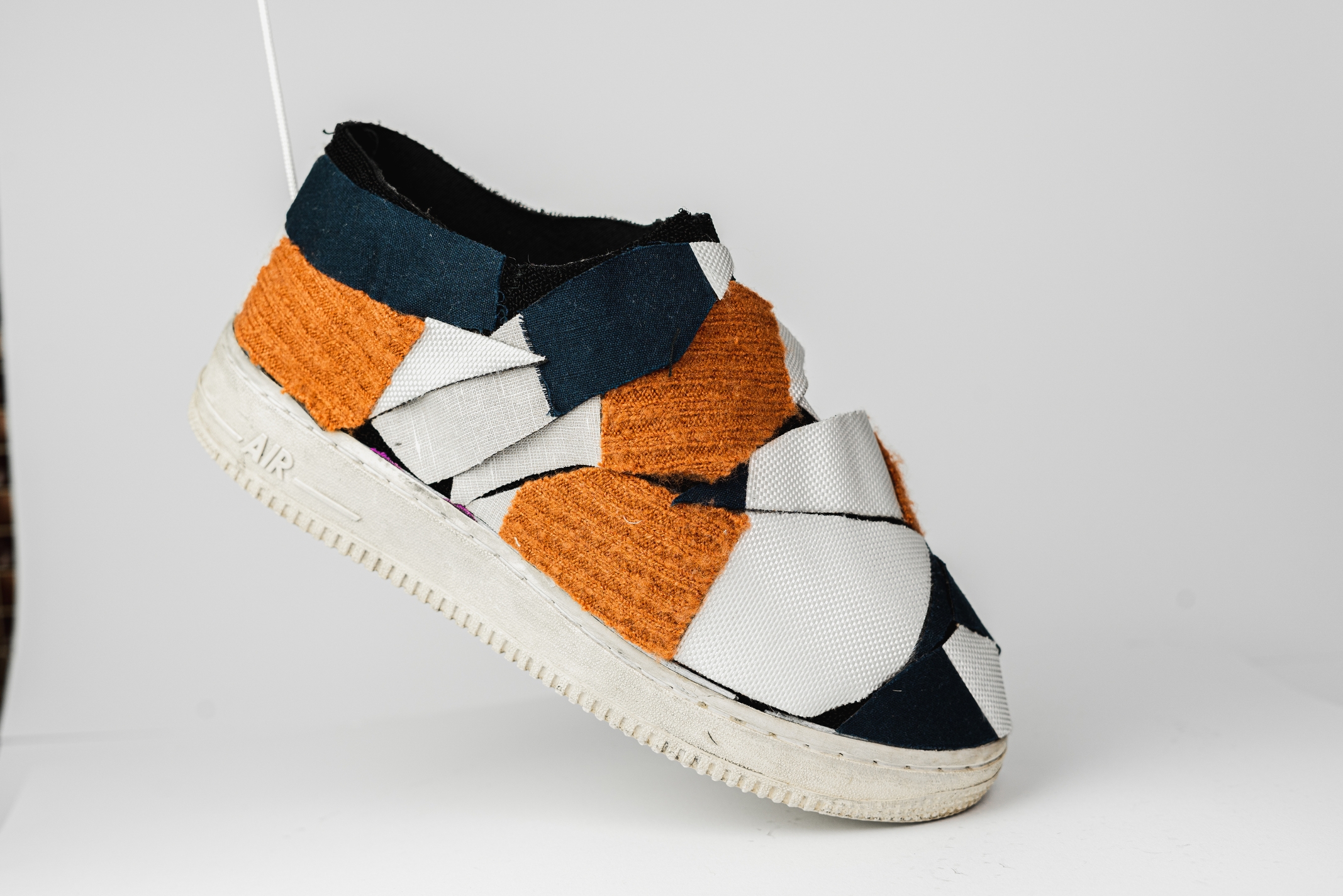 The focus is the LESS-waste design/pattern drafting. This will likely increase the efficiency, respect, and value of the materials. LESS is a pair of mules made of repurposed personal unwanted (functional) clothes also other materials found on the street to achieve a simpler unisex upper pattern of footwear, which is inspired by the ancient mocassin, and supported by the Japanese Boro and Wabi-Sabi philosophies for its beauty in imperfection. LESS revalues.
