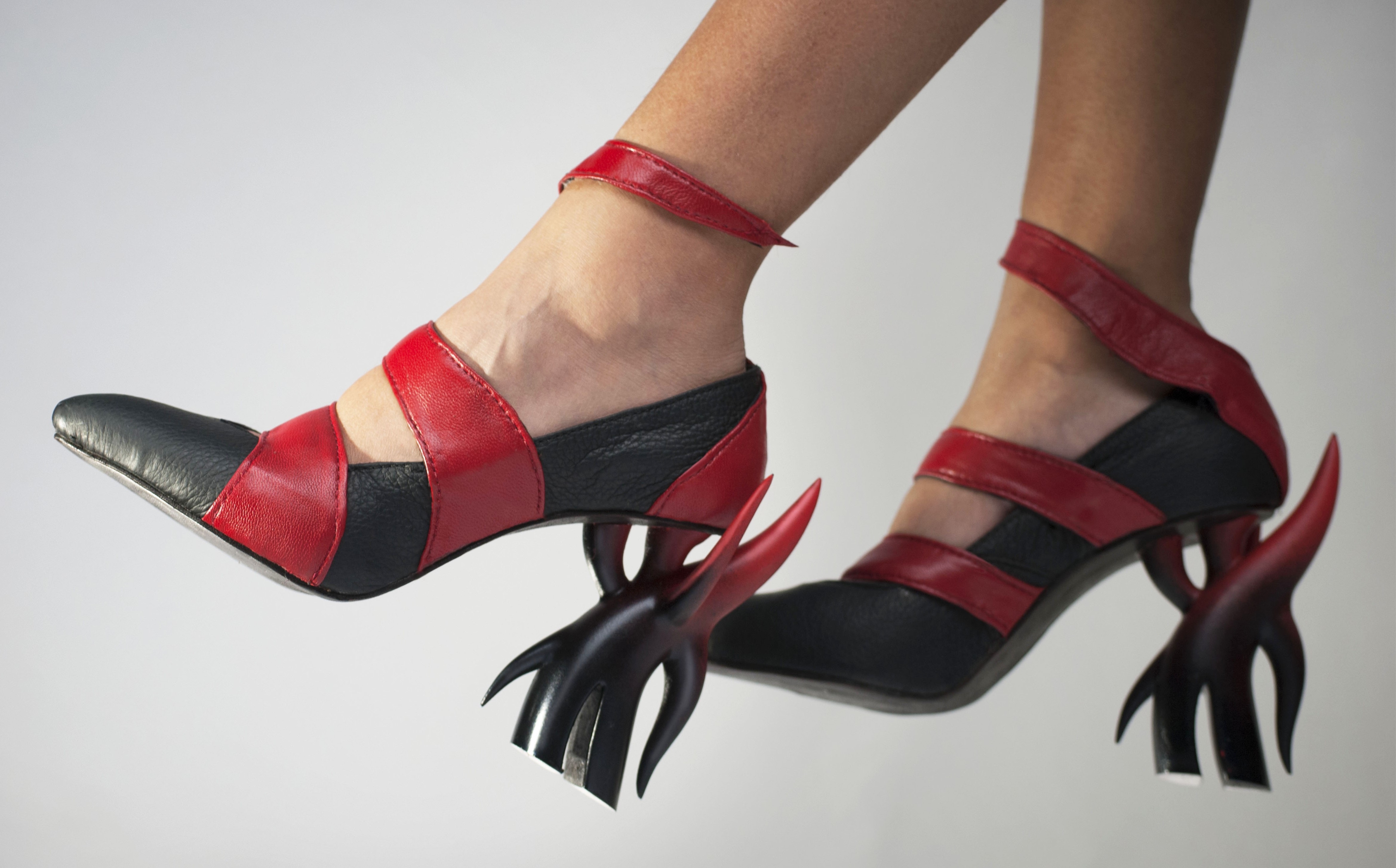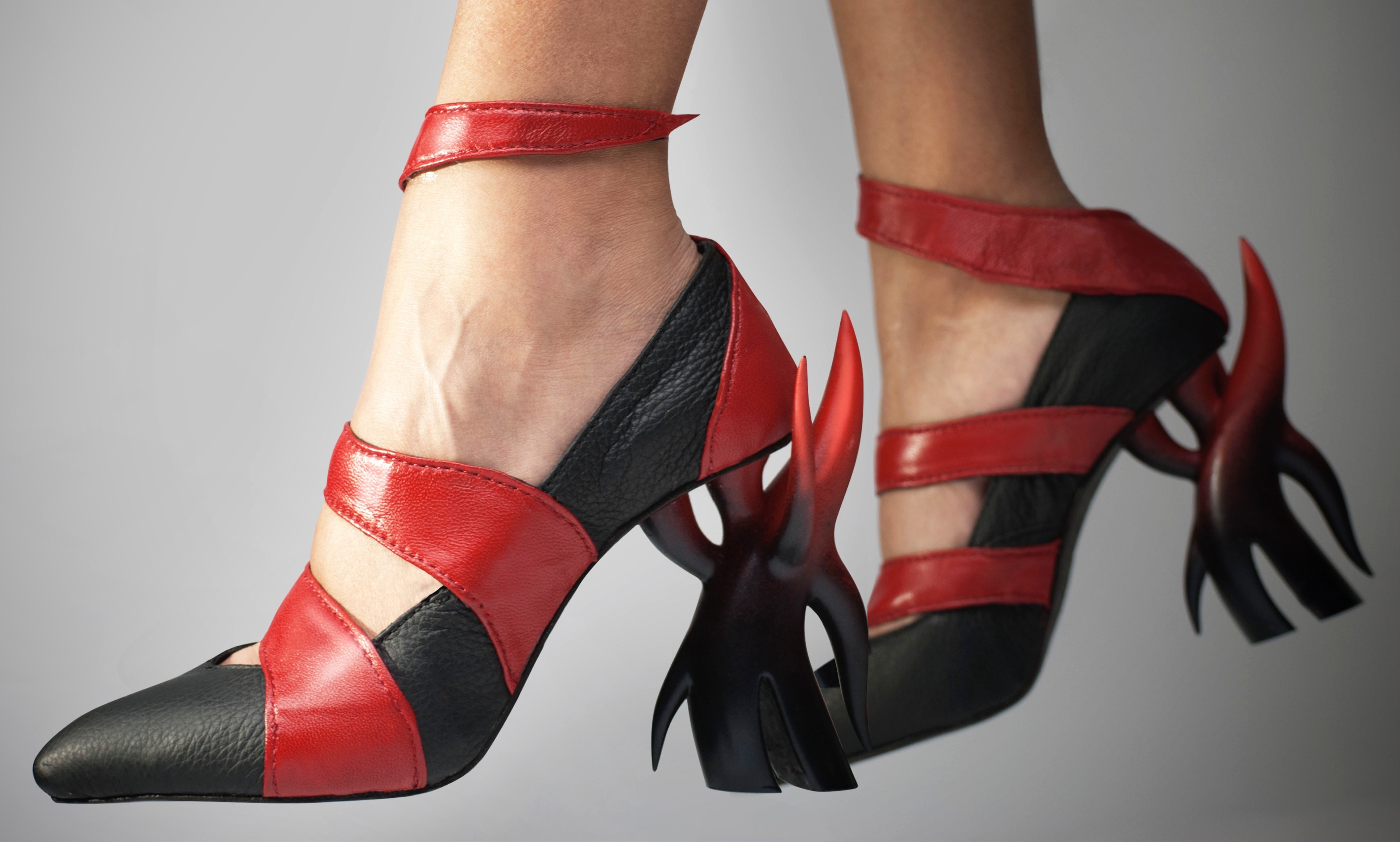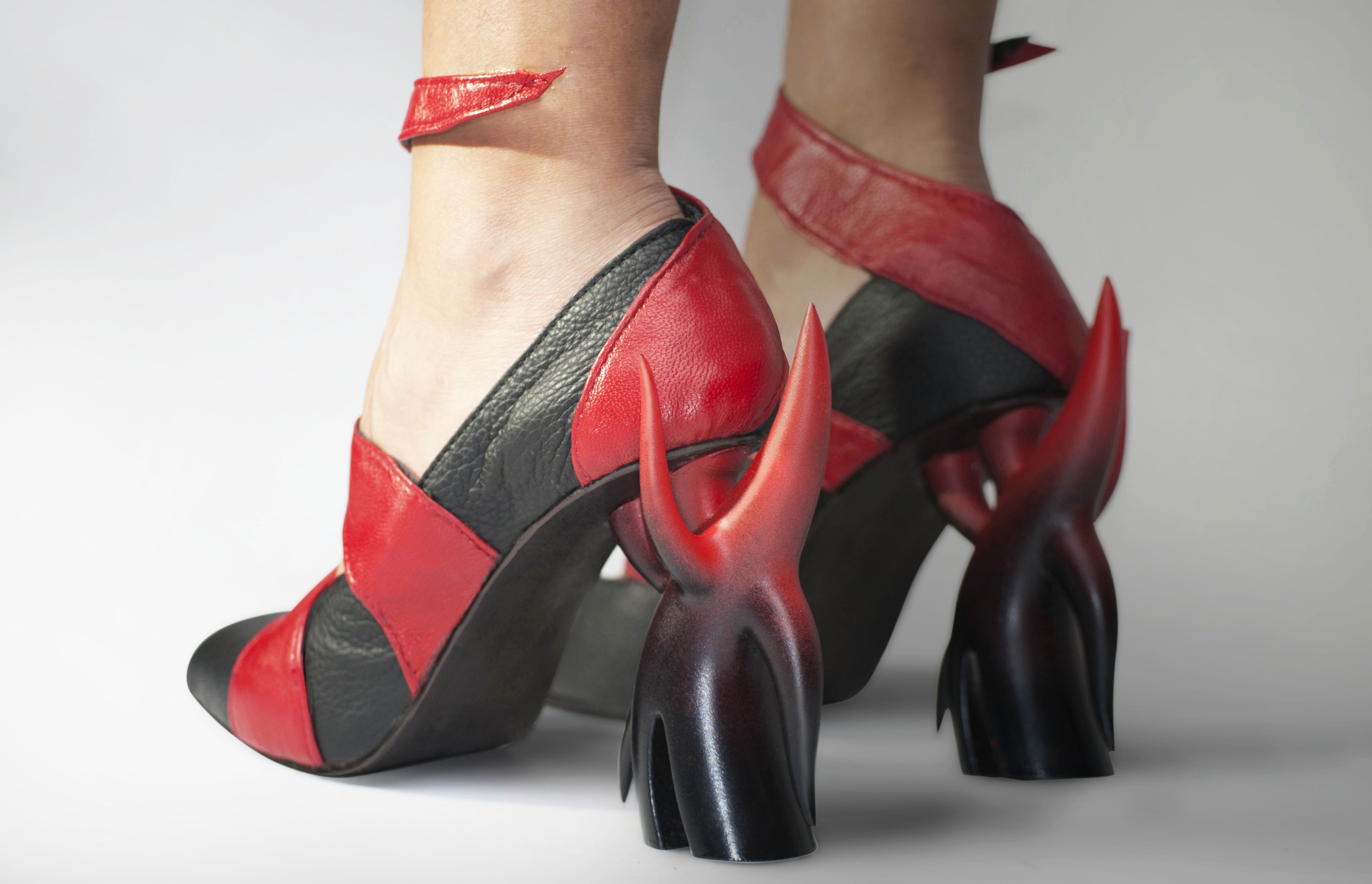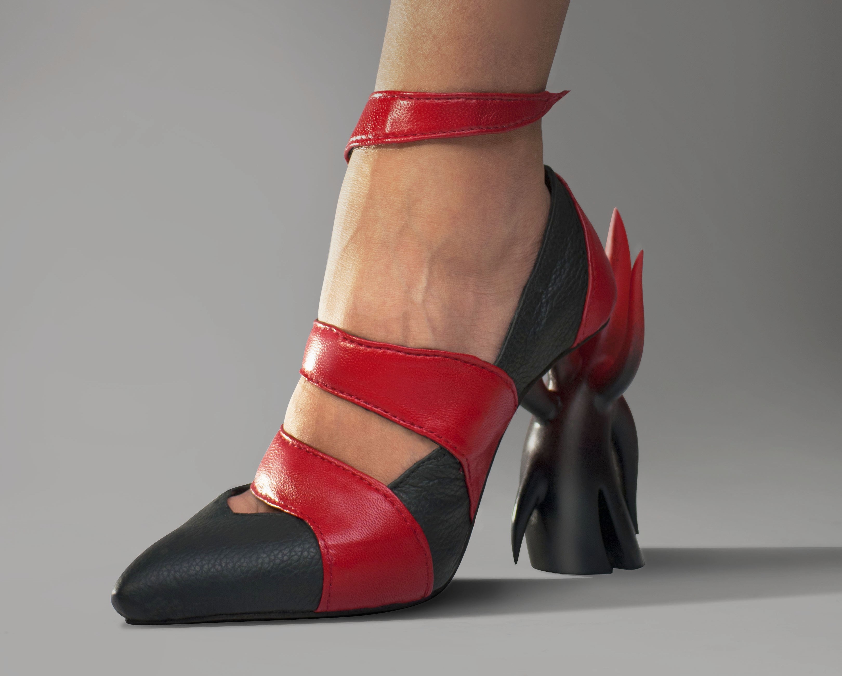 Inspired by "Inferno", the first part of Dante Alighieri's epic 14th century poem: "The Divine Comedy". Inferno describes the recognition and rejection of sin. The mood and colors are inspired by Eugene Delacroix's "The Barque of Dante", a romantic painting filled with emotion and movement. The sense of movement in this shoe is achieved with the shape of the heel as well as the red strap which can wrap around the leg. The form of the heel resembles an angel but with sharp elements that represent horns.