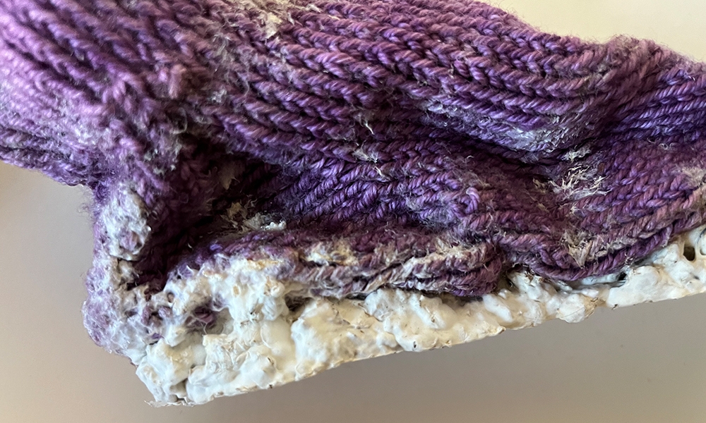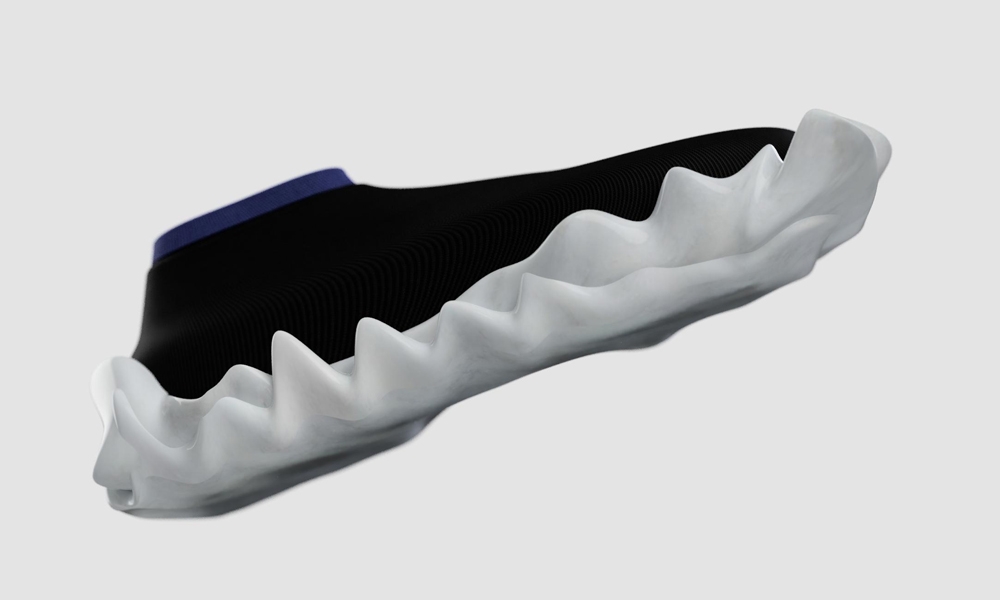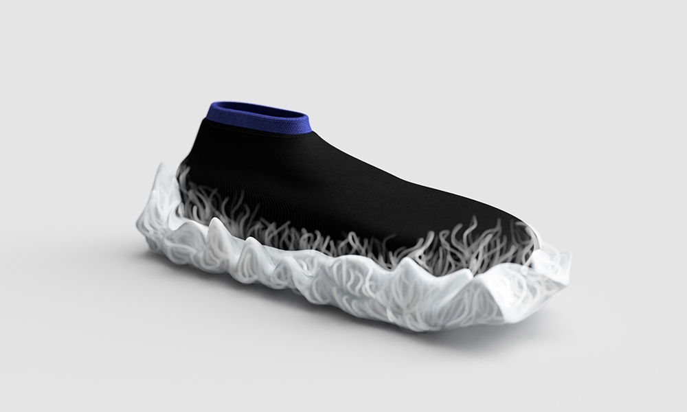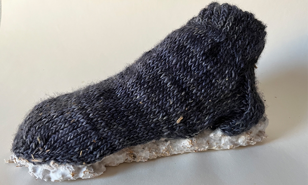 Shrooes are a footwear design which collaborates with living mycelium to bond with a knitted textile upper. Mycelium, the root-like structure of fungi, are sentient organisms which can bond with textile materials. As footwear today uses synthetic foams, are constructed with toxic adhesives, and unable to biodegrade, I am exploring the potential for a mycelium foam midsole which replaces adhesives. King Oyster mycelium has a high compression strength and a similar density to cork, with the potential to be used as a casual footwear sole. Overall, the entire shoe would be biodegradable.