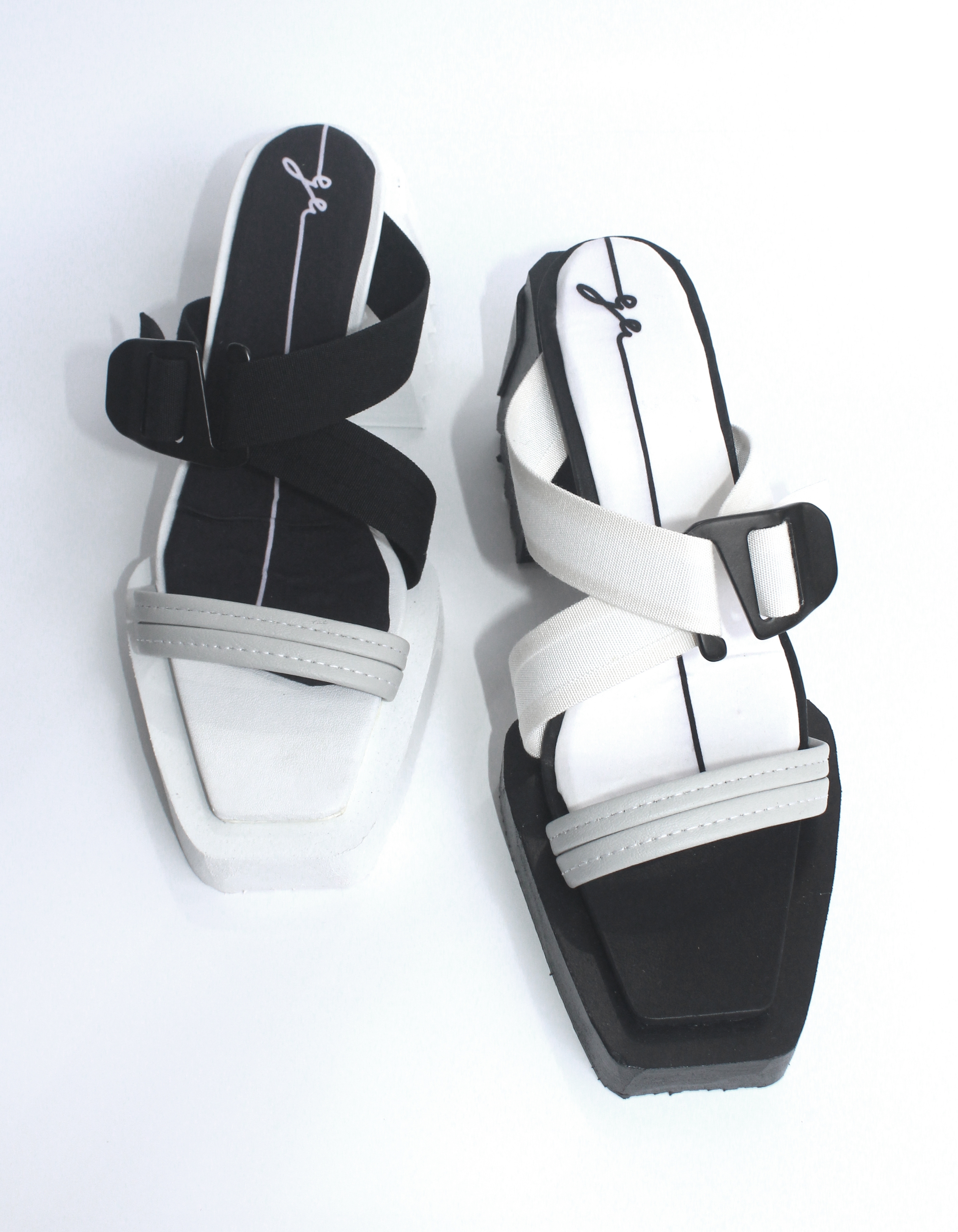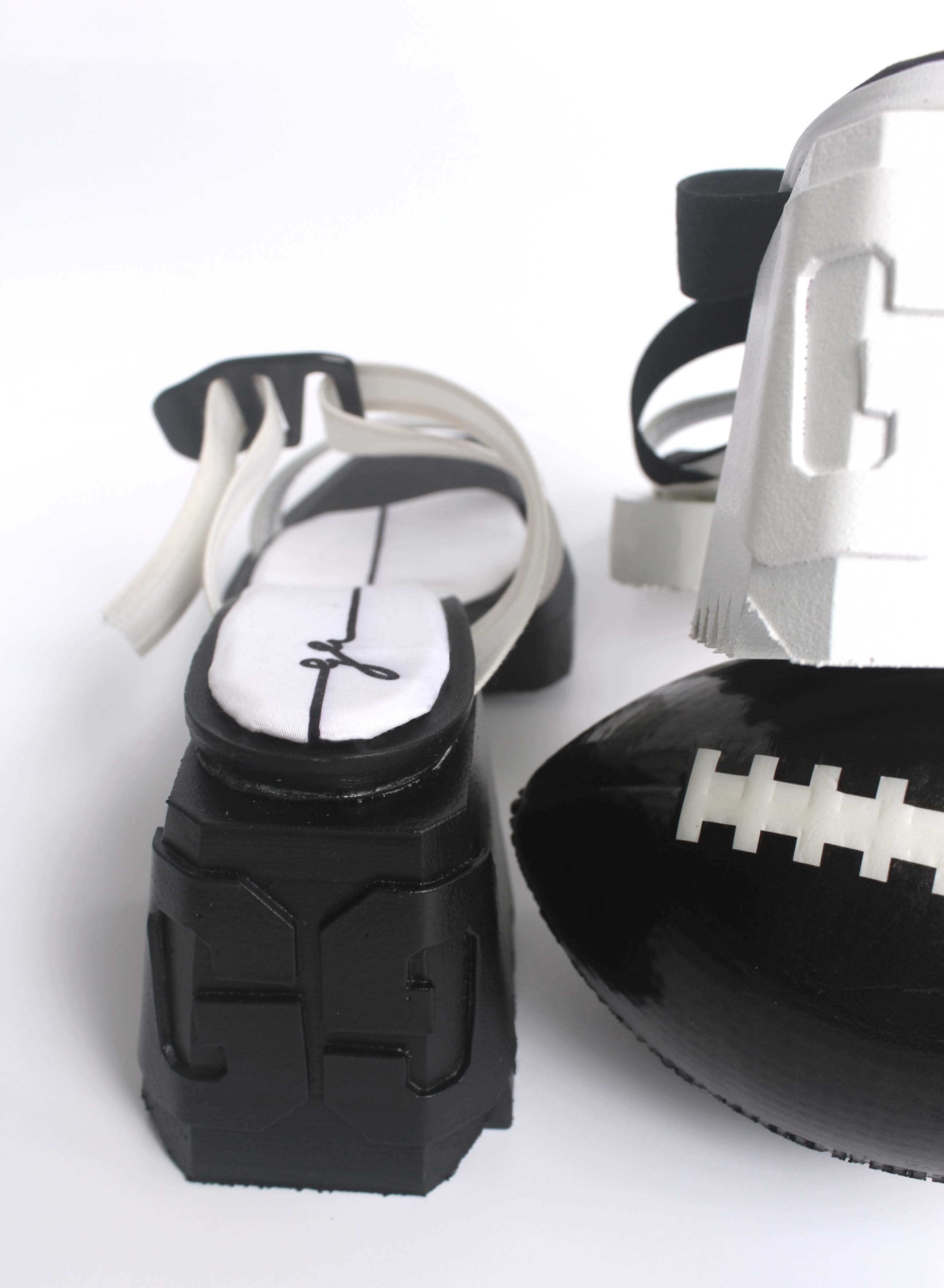 A flyer is the cheerleader at the top of the pyramid being thrown into the air to land in perfect balance. These shoes encapsulate the sportiness, lightweight feel and power of these athletes. By combining chunky heels and platforms, the upper of the shoe is light and in perfect balance to replicate a cheerleading pyramid.