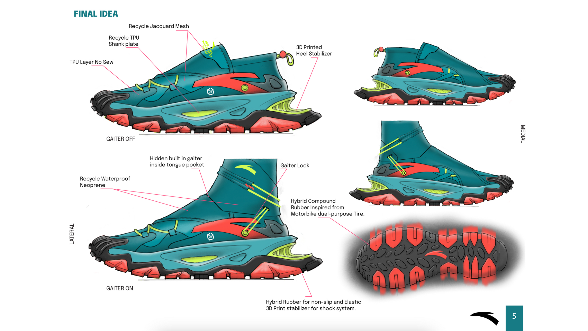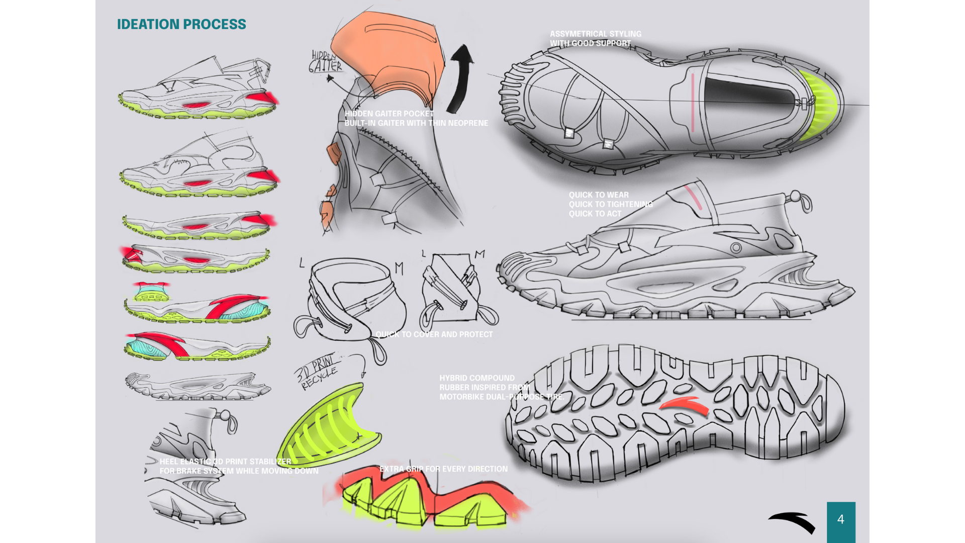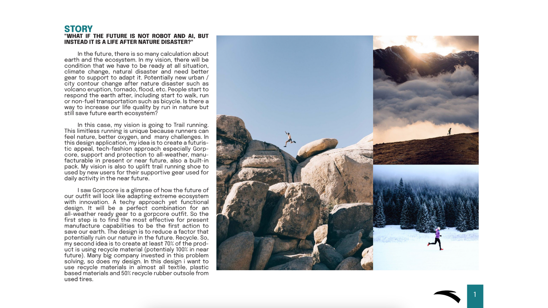 A footwear design competition was held by Anta in 2021 with a big theme to answer the question, what is the future will be? I answer with earth ecosystem because we live on earth despite our different countries, geomorphology, nature, and climate. We have to act quickly and consistently to save the planet together for a better future while exploring any possibilities with innovation. Sometimes all we need is to feel the nature to "listen" and then act. In this vision, I am imagining the future will be a natural disaster and how we live forward.
